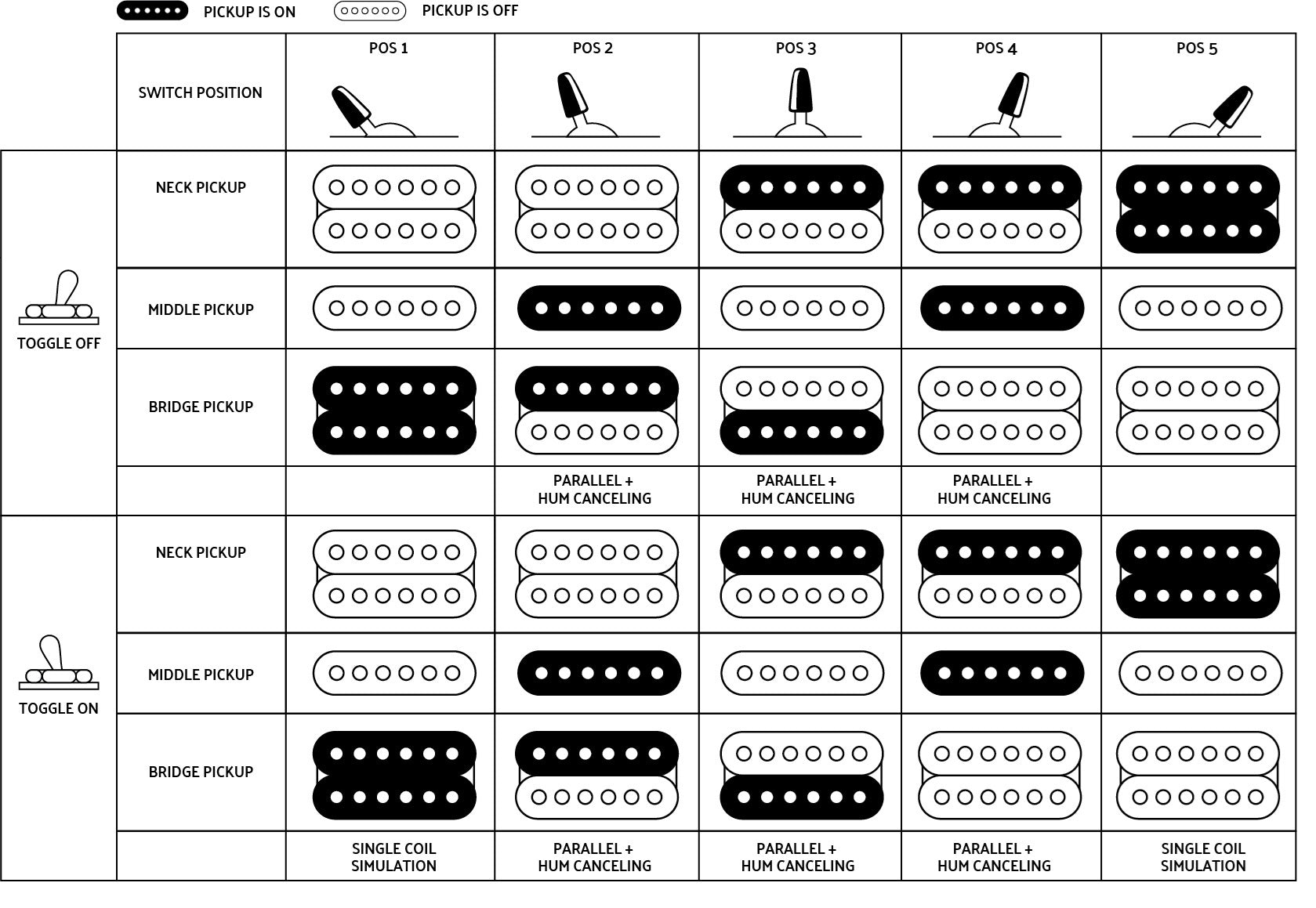 Pickup Switching 5-Position Blade: Position 1. Full Bridge Pickup, Position 2. Bridge Inner Coil and Middle Pickup, Position 3. Bridge Outer Coil and Neck Outer Coil, Position 4. Middle and Neck Outer Coil, Position 5. Full Neck Pickup