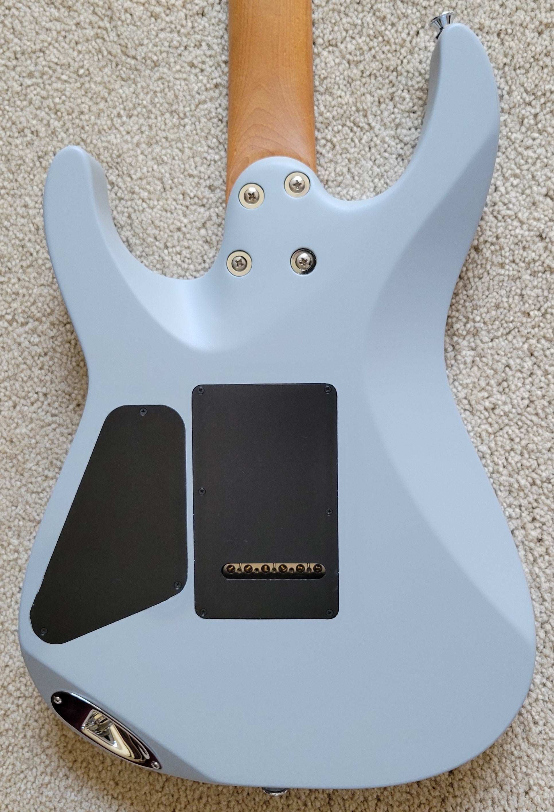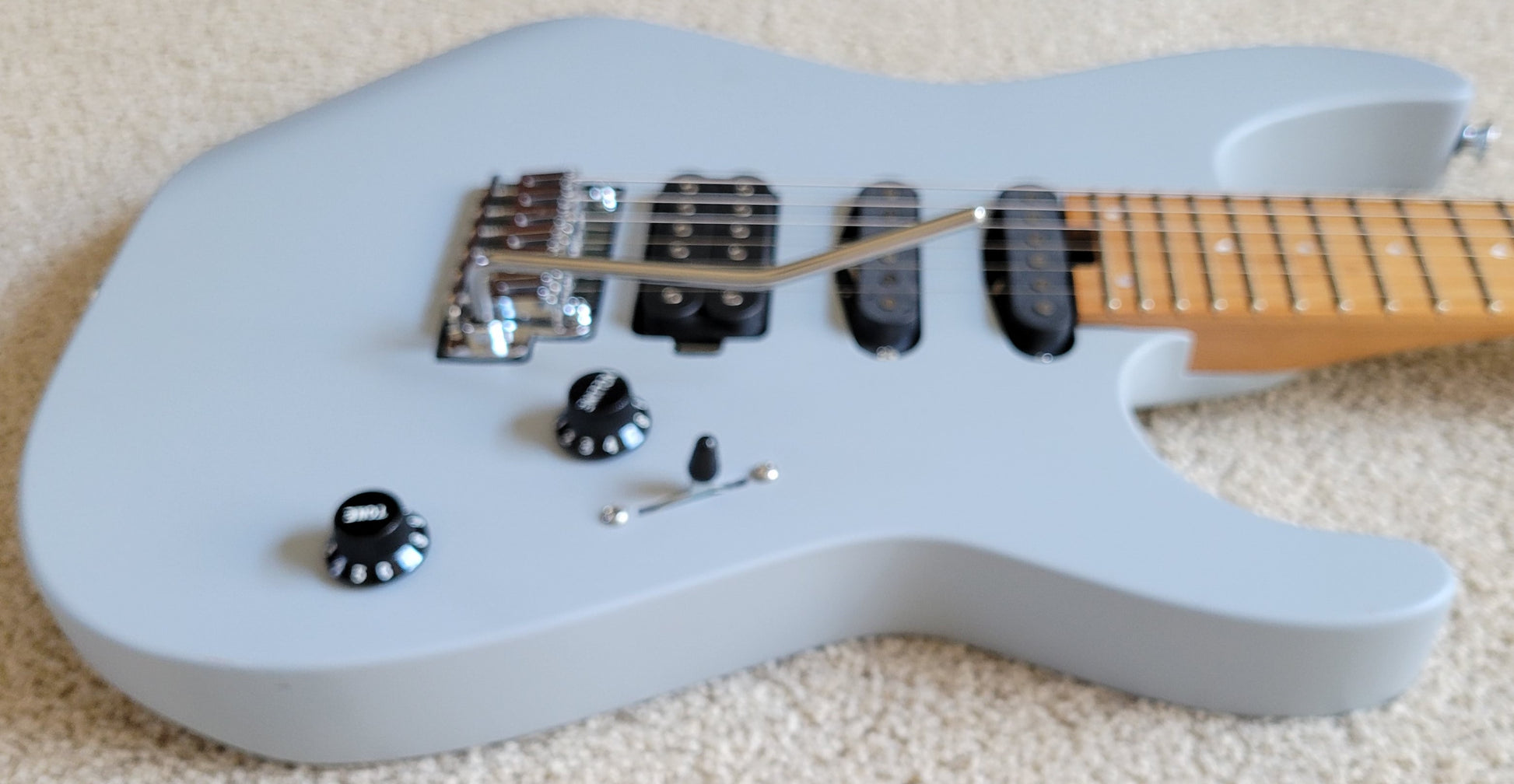 Its alder body in the classic Dinky style is dressed in a no-nonsense Primer Gray finish. The two-piece bolt-on caramelized maple “speed” neck has graphite reinforcement, sculpted heel, heel-mount truss rod adjustment wheel, Luminlay side dots and a silky-smooth hand-rubbed urethane finish. Its 12”-16” compound-radius caramelized maple fingerboard features comfortable rolled edges, 24 jumbo frets, pearloid dot inlays and Graph Tech nut.