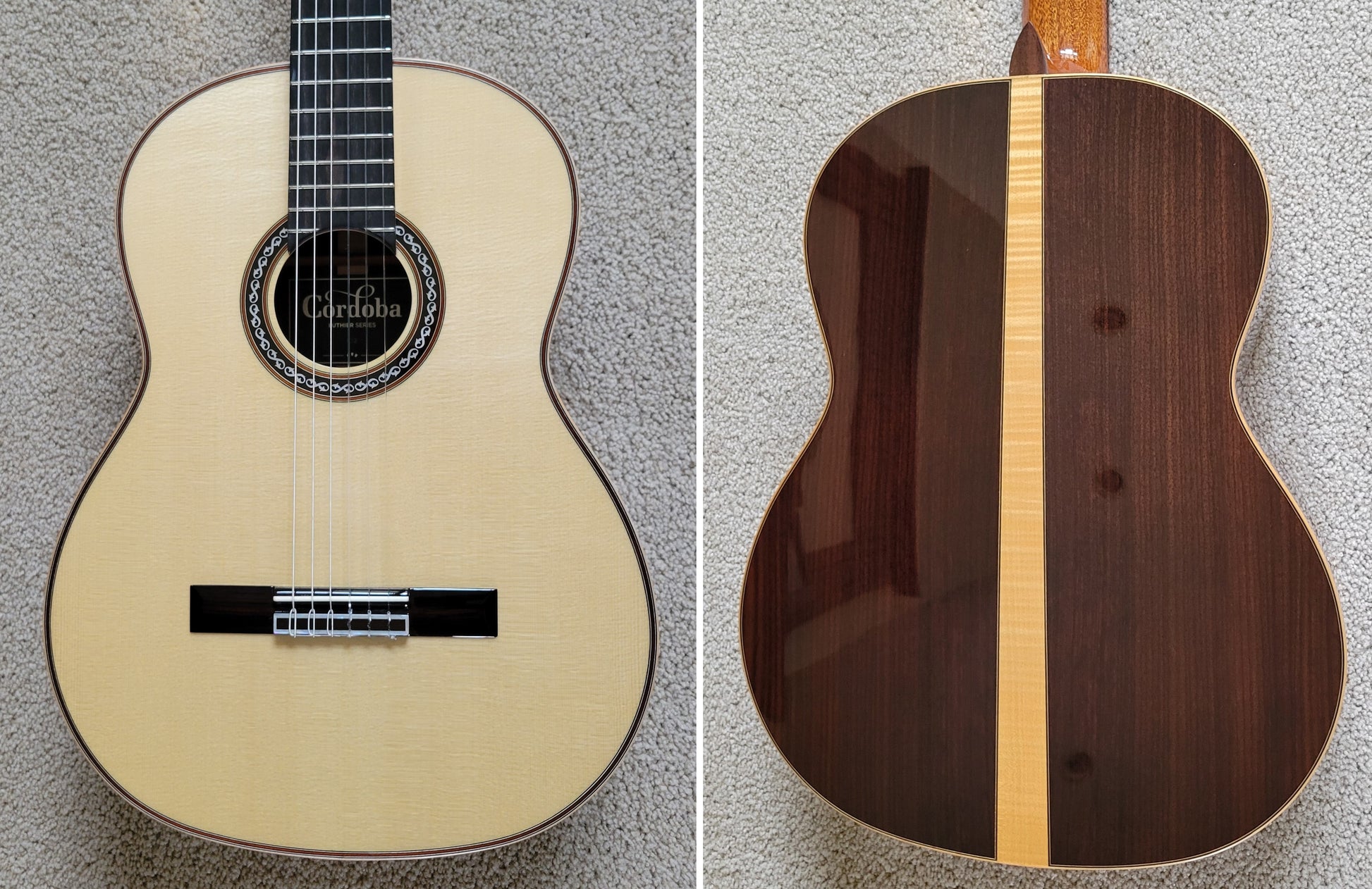 The all-solid C12 is one of our most high-end and modern guitars. Available with either a solid Canadian Cedar or European Spruce top with Indian Rosewood back and sides, the C12's lattice bracing and raised fingerboard are elements that make this model truly stand out from the rest. The delicately braced top provides rich tones with a lively presence and the raised fingerboard makes accessing upper frets a breeze. The C12 is a treasure to last a lifetime with stunning decorative elements such as its flamed maple center wedge on the back, matching maple binding, and hand-inlaid 1920s-inspired pearloid rosette. Comes inside a hardshell Córdoba humidified archtop case.