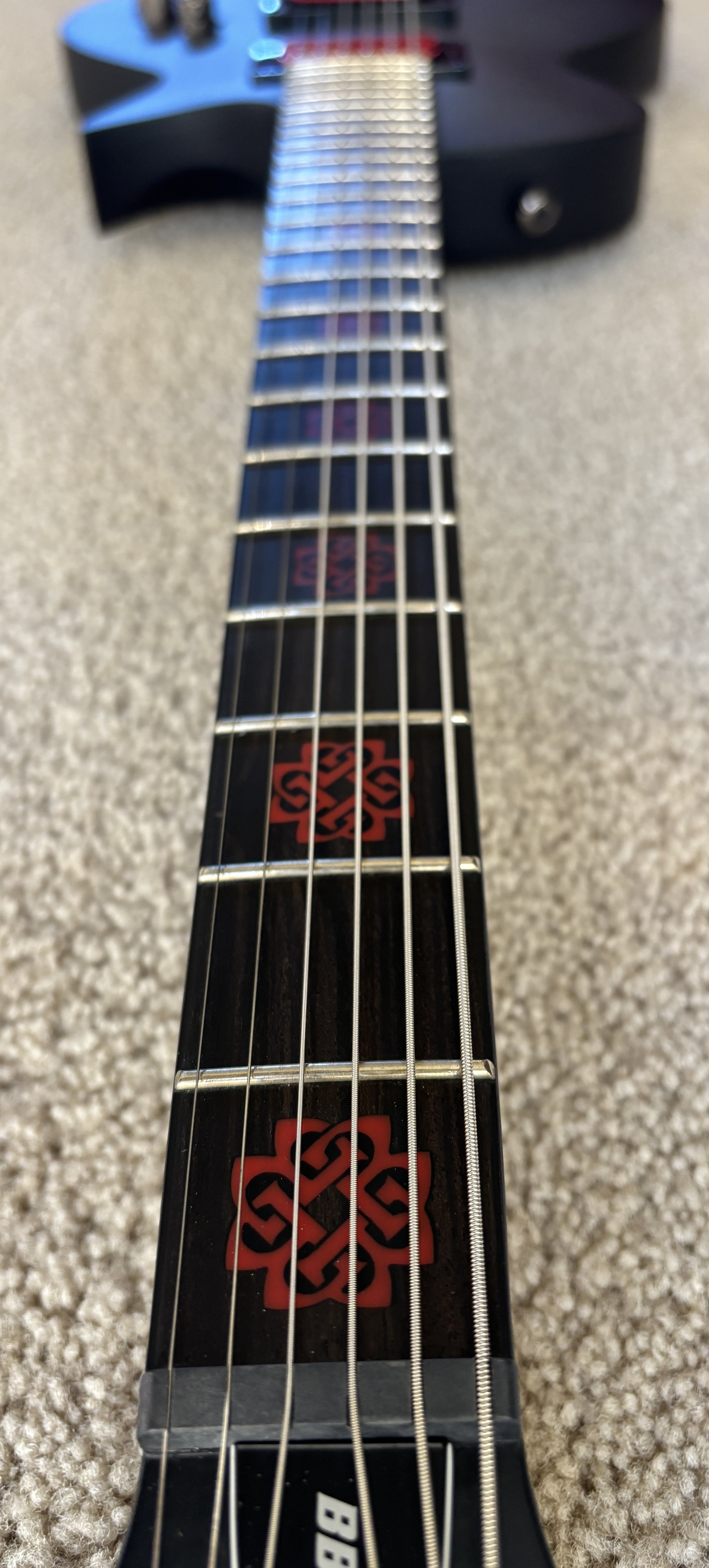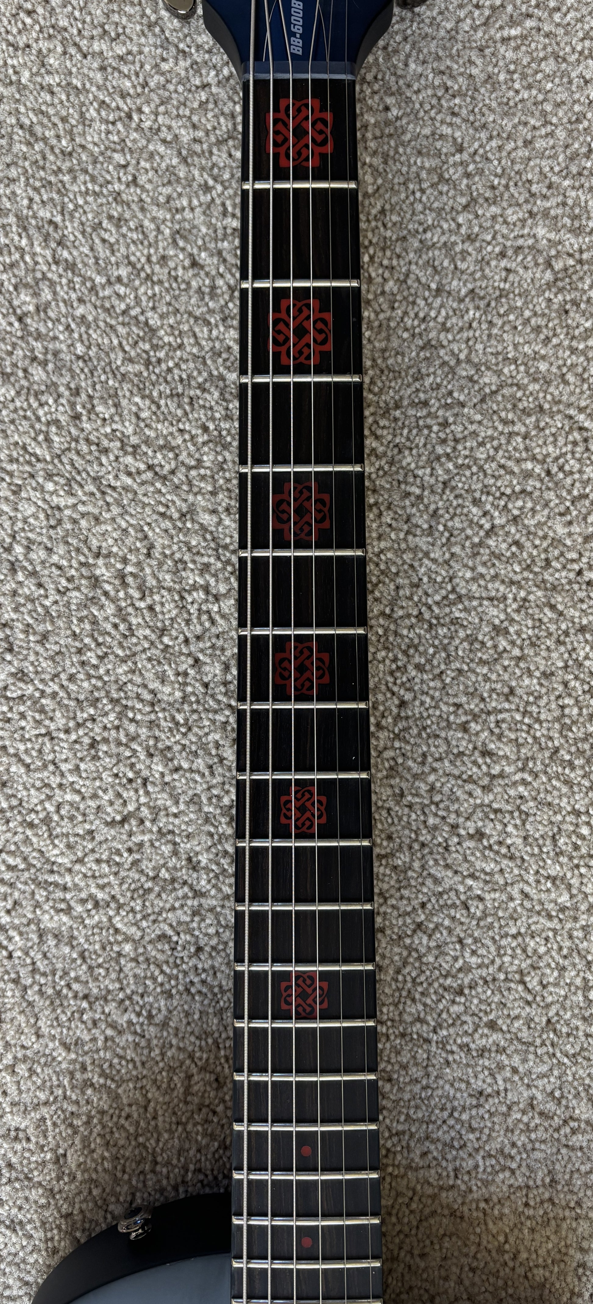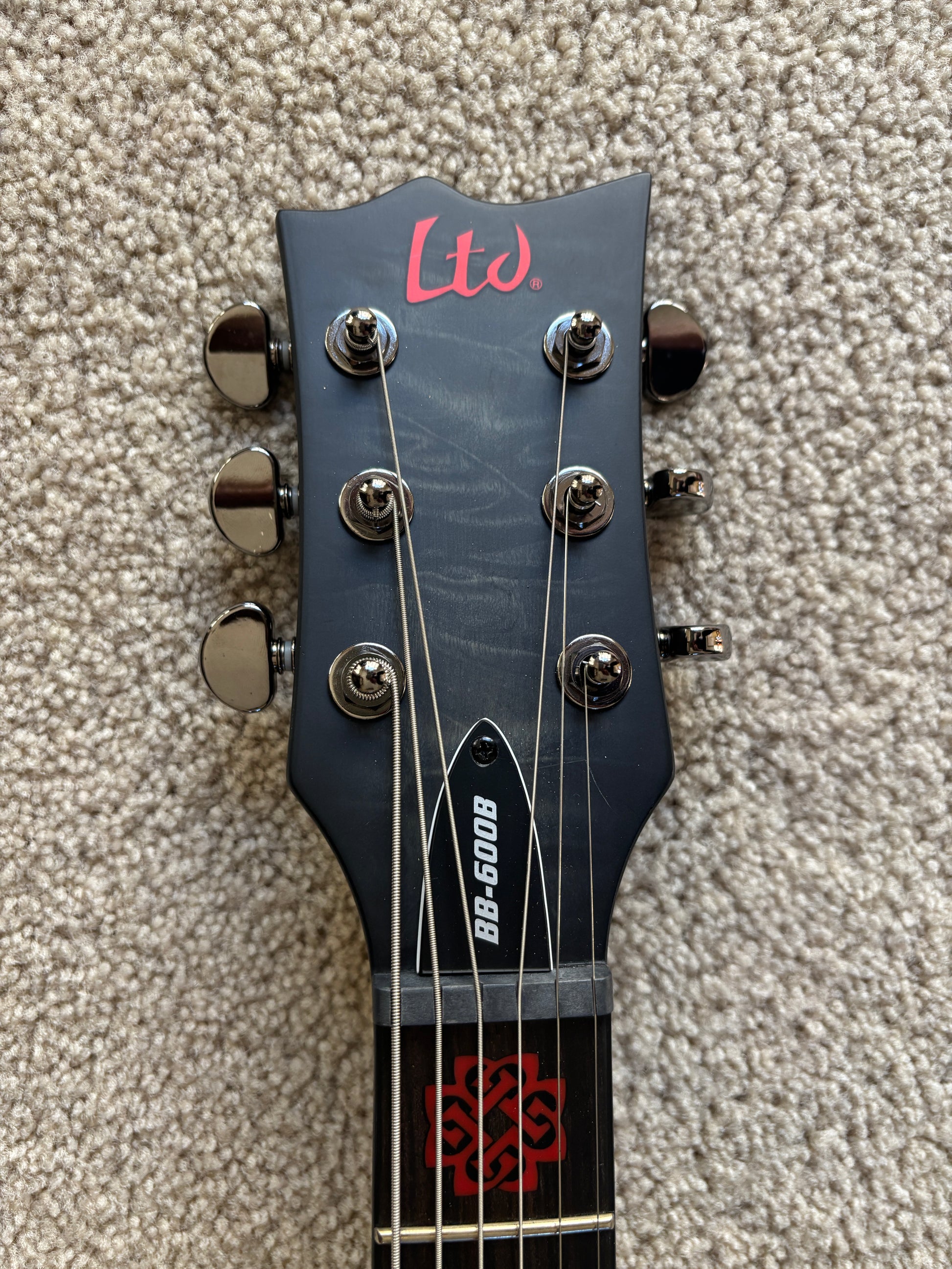 Ben Burnley is the founder of the eponymously-named rock/alt-metal band Breaking Benjamin, and his LTD Signature Series guitar, the BB-600 Baritone, is the driving force for this frontman's musical creations. The BB-600B is one of the most versatile signature models ever made by ESP. It includes two distinct pickup types: a pair of high-quality magnetic pickups (with a set comprised of Seymour Duncan '59 and JB), as well as a Graph Tech Ghost-Loaded Resomax NV bridge and tailpiece that offers an integrated piezo pickup. The BB-600B also includes two output jacks, allowing you to route the signal from the standard magnetic pickups to one amplifier and the piezo pickup to another for incredible flexibility onstage or in studios. More than just sonically flexible, the BB-600B is an incredible instrument in other ways as well. A single-cutaway Eclipse body style with set-thru construction, the BB-600B is a baritone guitar at 27" scale, allowing for downtuning without sacrificing ideal string tension. Its mahogany body is topped with quilted maple in an amazing See Thru Black Sunburst Satin finish. It offers a thin U-shaped three-piece maple neck for a comfortable playing feel. The aesthetic of this guitar is complemented with custom red pickup covers, red fingerboard inlays with the Breaking Benjamin symbol, and a red LTD logo.