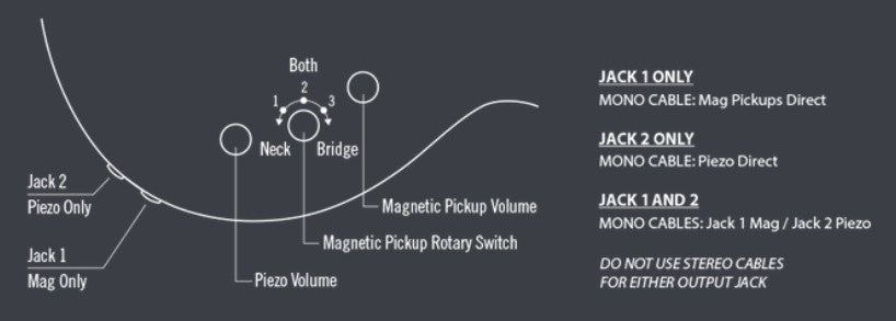 - Electronics Layout Volume(Mag)/3-Way Rotary Switch(Magnetic)/Active Volume(Piezo), 2 Output Jacks