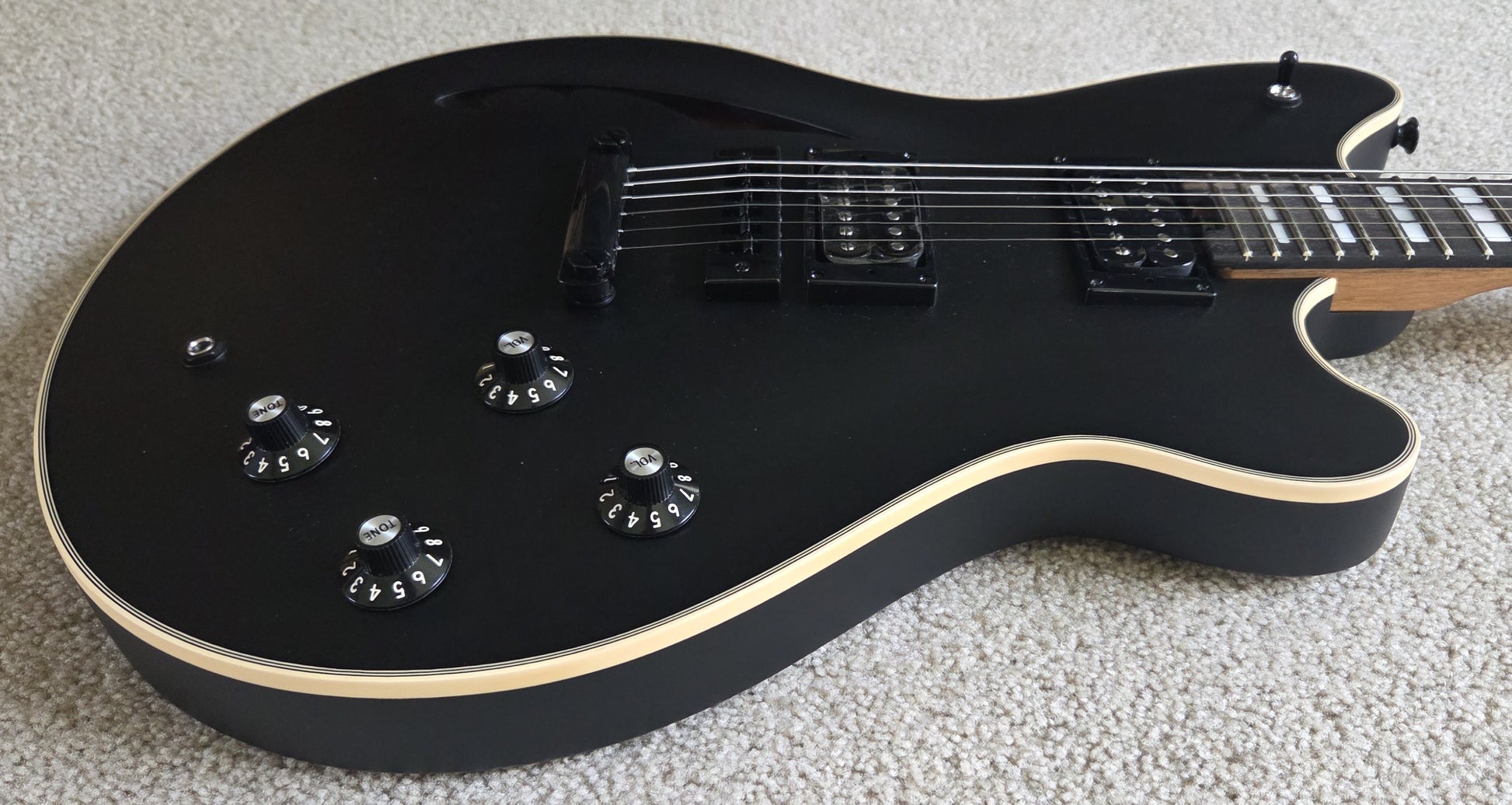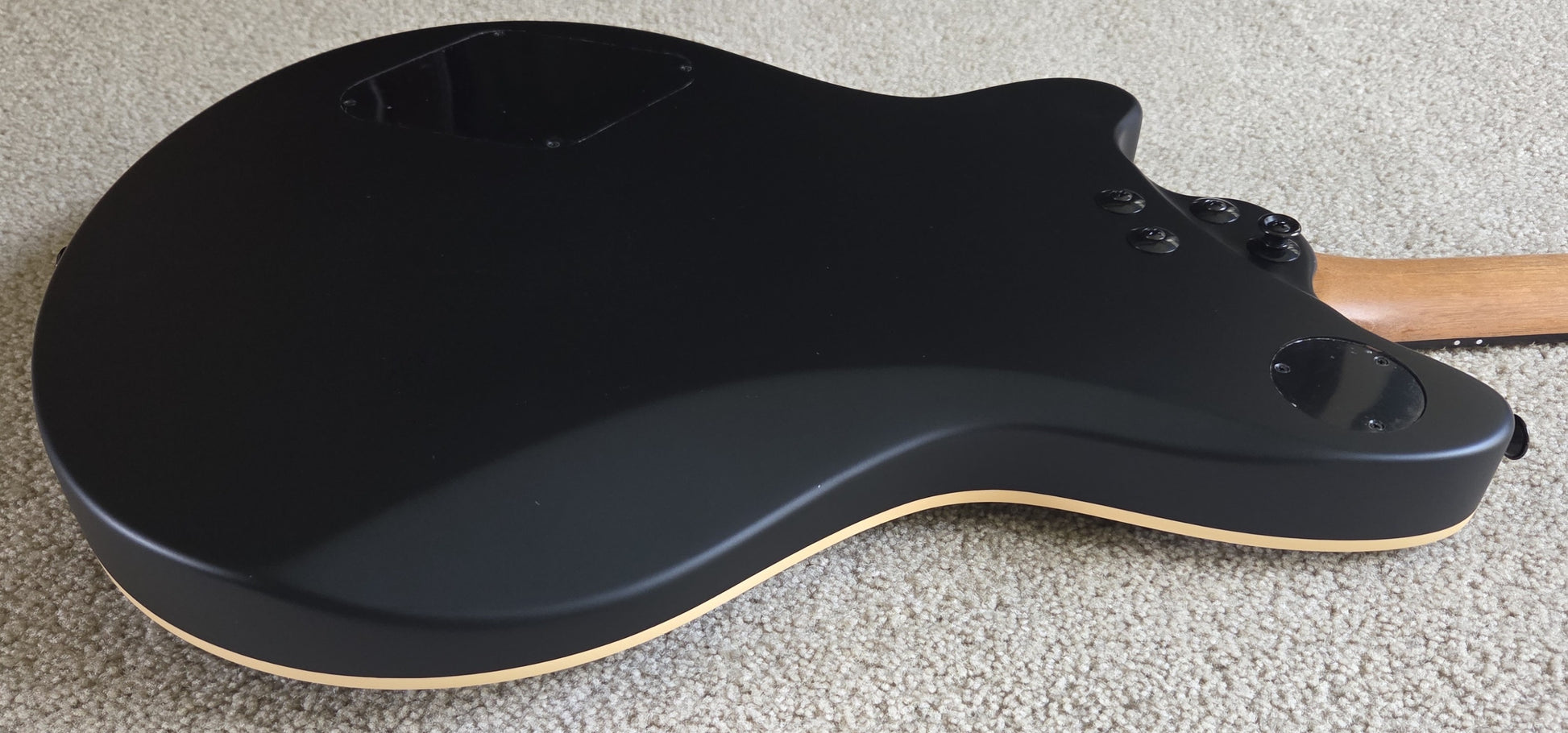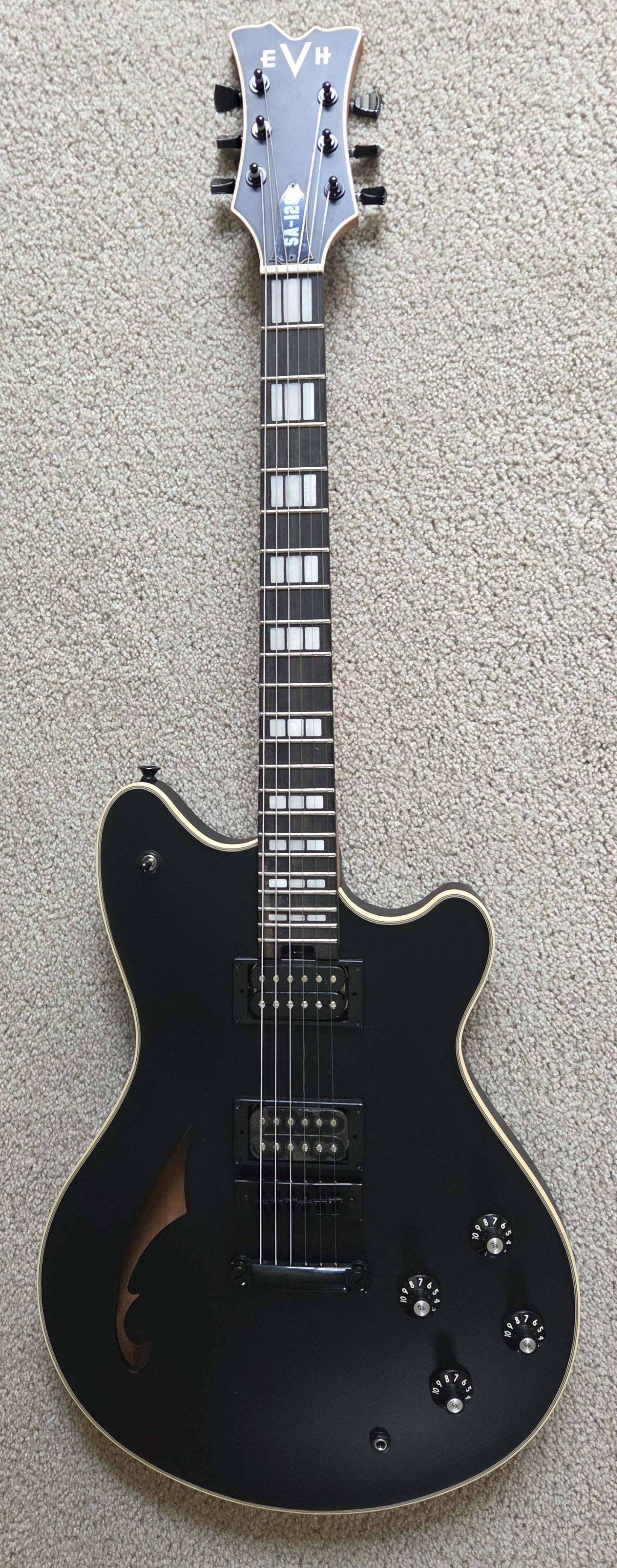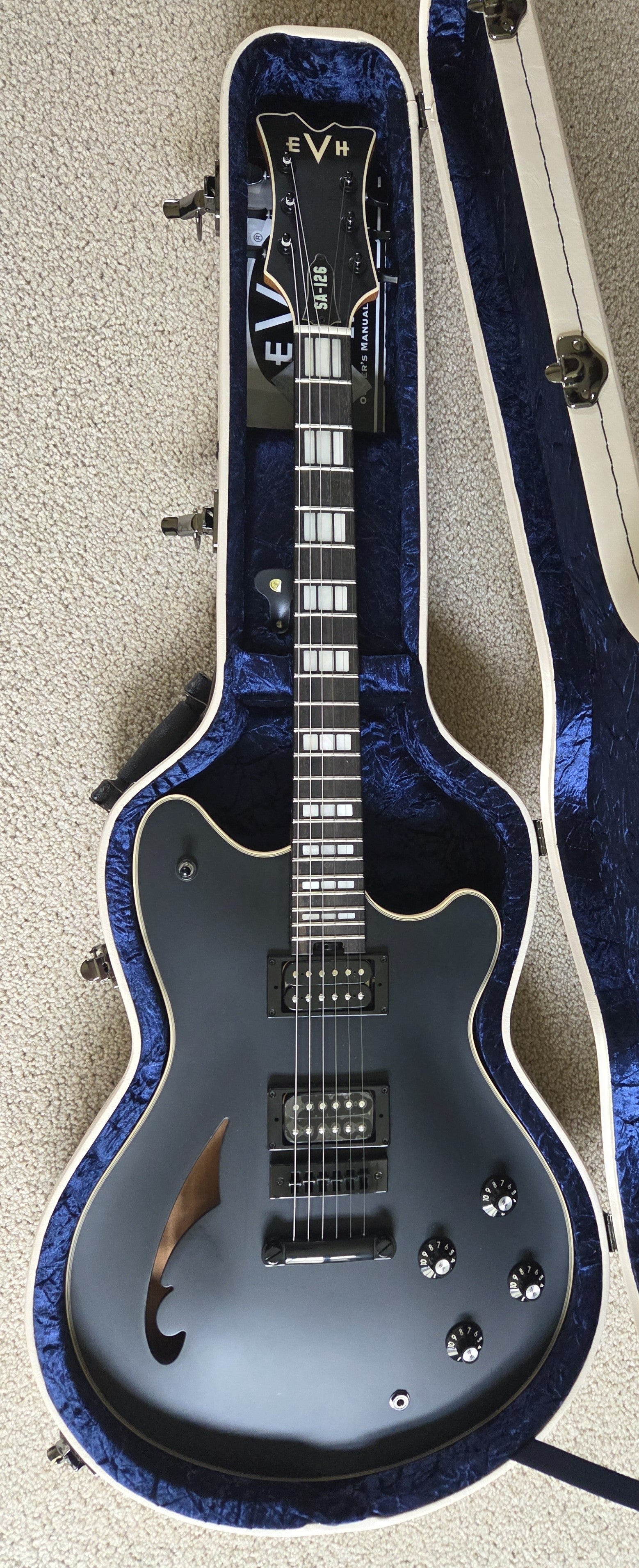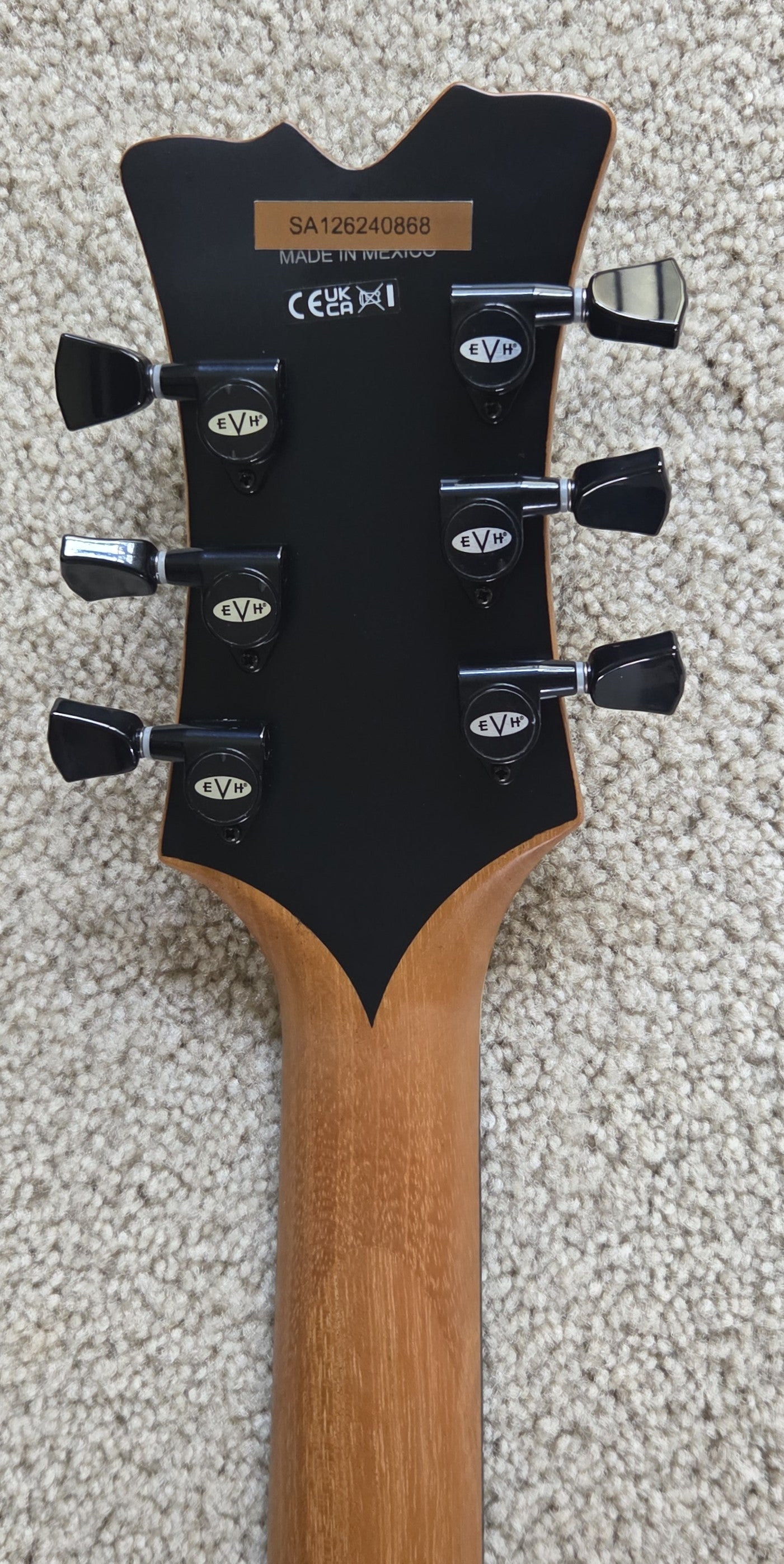 This EXCELLENT guitar went from EVH to their authorized refurbisher MIRC, where it received a full multi-point inspection and expert setup - it is ready to play! There is one small area near the sound hole where the Black finish is slightly shinier than the rest of the guitar. Otherwise, no visible repairs were necessary, and no modifications were made except the original serial number was replaced/covered with a new one.