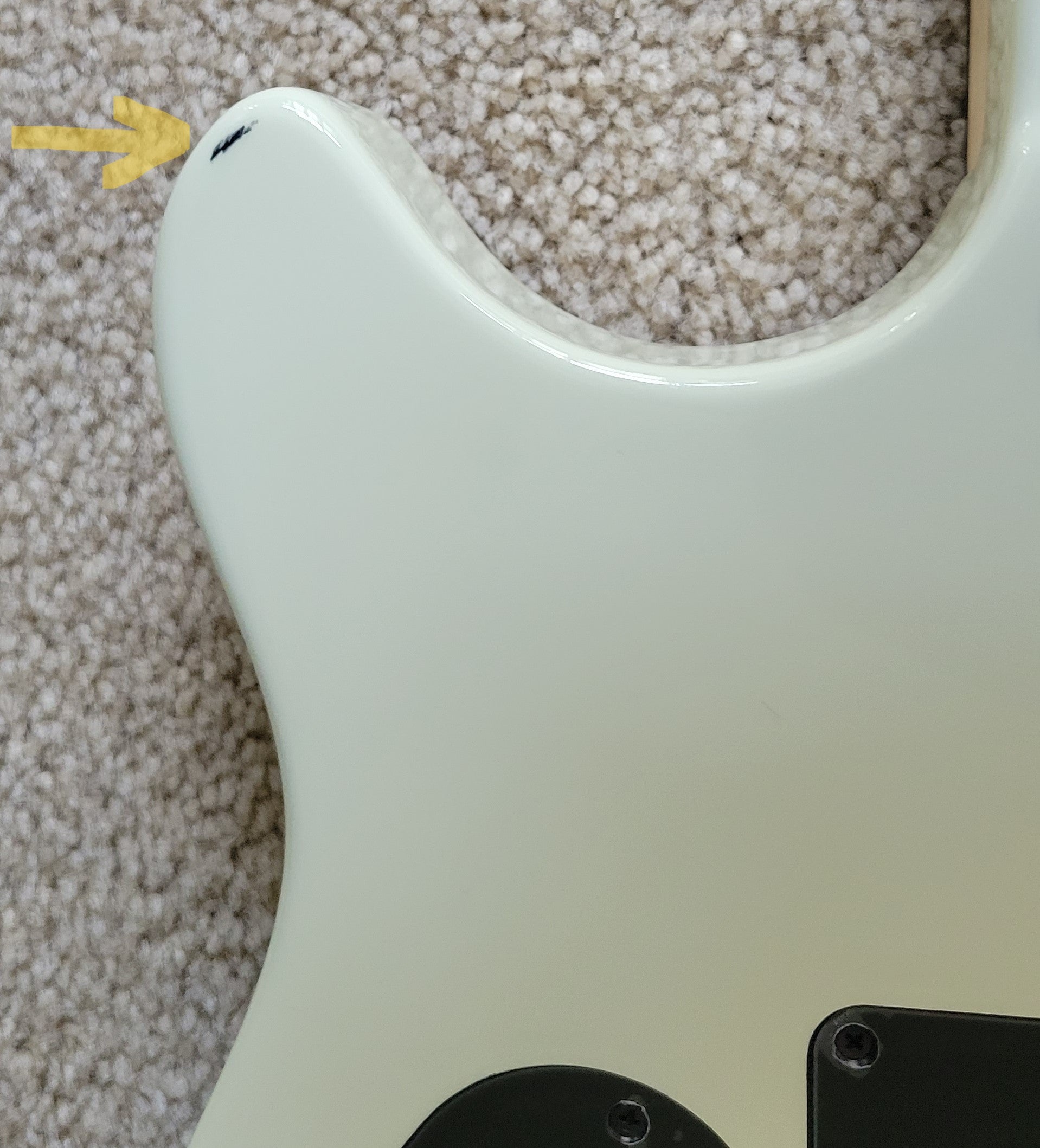 This LIKE NEW guitar went from the factory to their authorized refurbisher, where it received a full multi-point inspection and expert setup - it is ready to play! I notice this guitar has a tiny paint flaw on the back side - see the photos. However, this is sealed, clear-coated, and smooth. No other visible repairs were necessary, and no modifications were made except the back of the headstock was stamped USED and the original serial number was replaced with a new one.