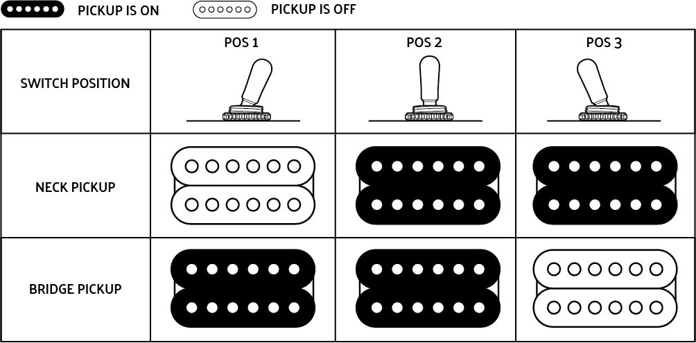 Pickup Switching 3-Position Toggle: Position 1. Bridge Pickup, Position 2. Bridge and Neck Pickups, Position 3. Neck Pickup