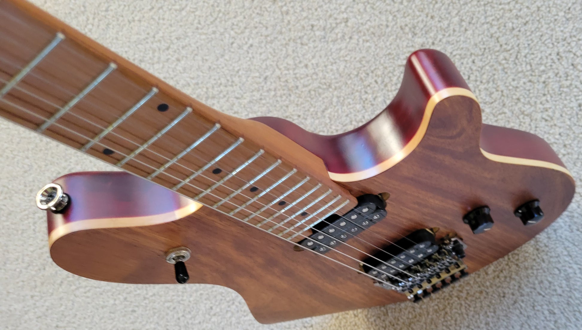 Designed for comfortable playability and speed, this stylish axe also features an oiled finish on the back of the neck and a 12"-16" compound radius baked maple fingerboard with rolled edges, 22 jumbo frets and black dot inlays.