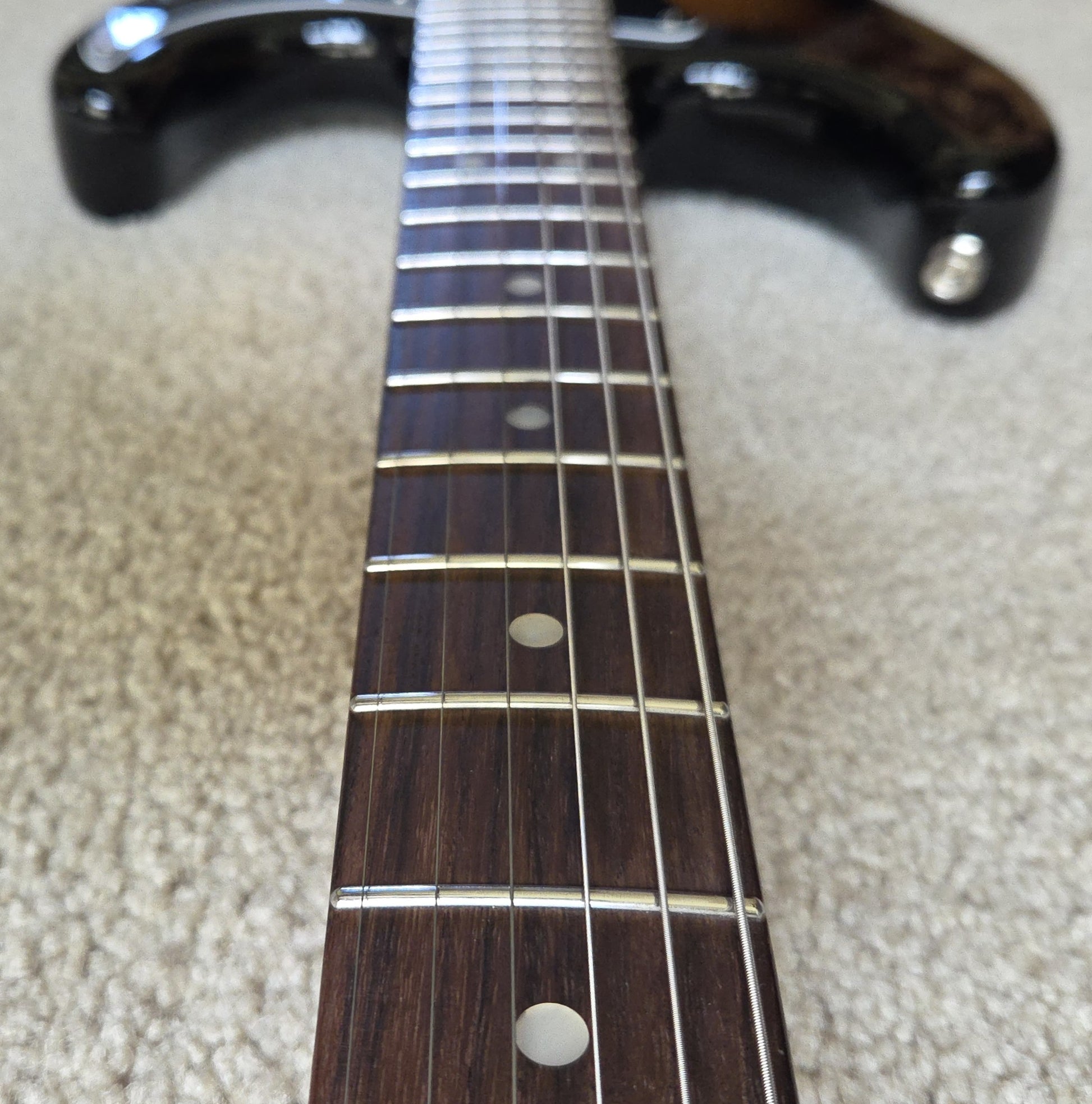 Stainless steel frets are significantly harder and smoother than traditional nickel-silver, giving them extreme durability and a glassy playing feel that makes bending easy.