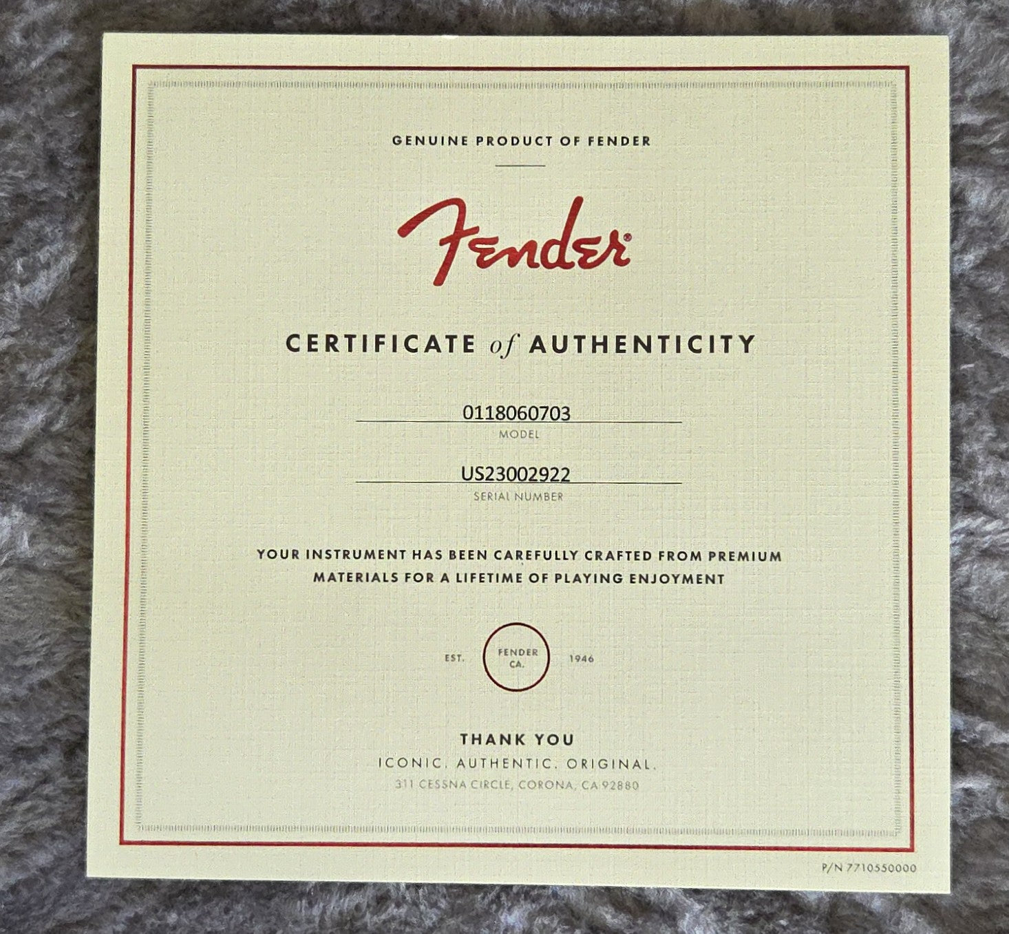 This EXCELLENT guitar went from Fender to their authorized refurbisher MIRC, where it received a full multi-point inspection and expert setup - it is ready to play! No visible repairs were needed, and no modifications were made except the back of the headstock was gently stamped USED, and the original serial number was replaced/covered by a new one. I notice some normal light pick scratches on the pickguard due to some normal playing, but these are hard to see except at the right angle. No other scratches, dings, dents, or damage of any kind.