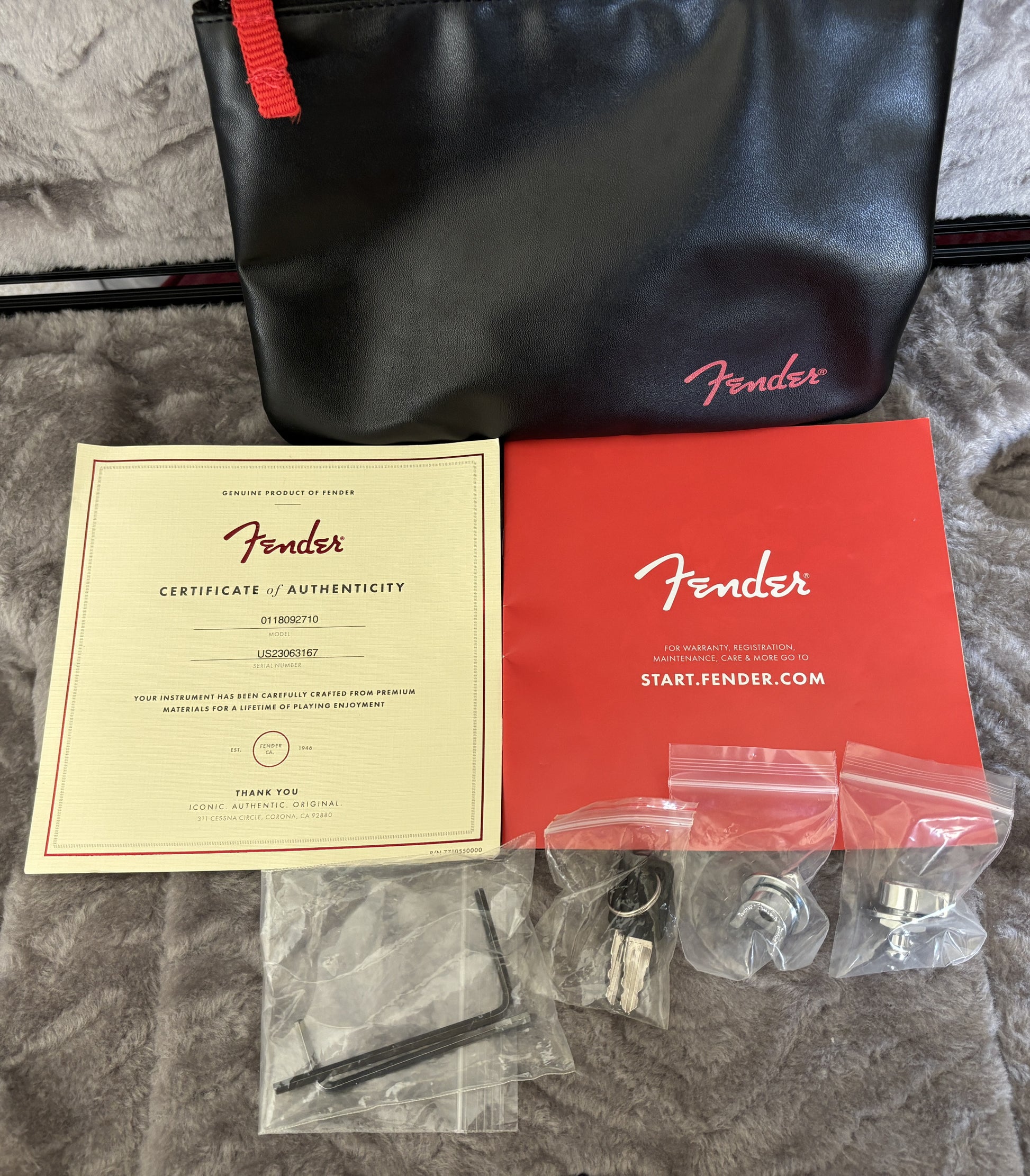 This EXCELLENT guitar went from Fender to their authorized refurbisher MIRC, where it received a full multi-point inspection and expert setup - it is ready to play! No visible repairs were necessary, and no modifications were made except the back of the headstock was stamped USED and the original serial number was replaced/covered with a new one. This guitar has some very fine pick marks and swirls on the pickguard, and a tiny finish flaw on the back edge - this mark is sealed, solid, and smooth.