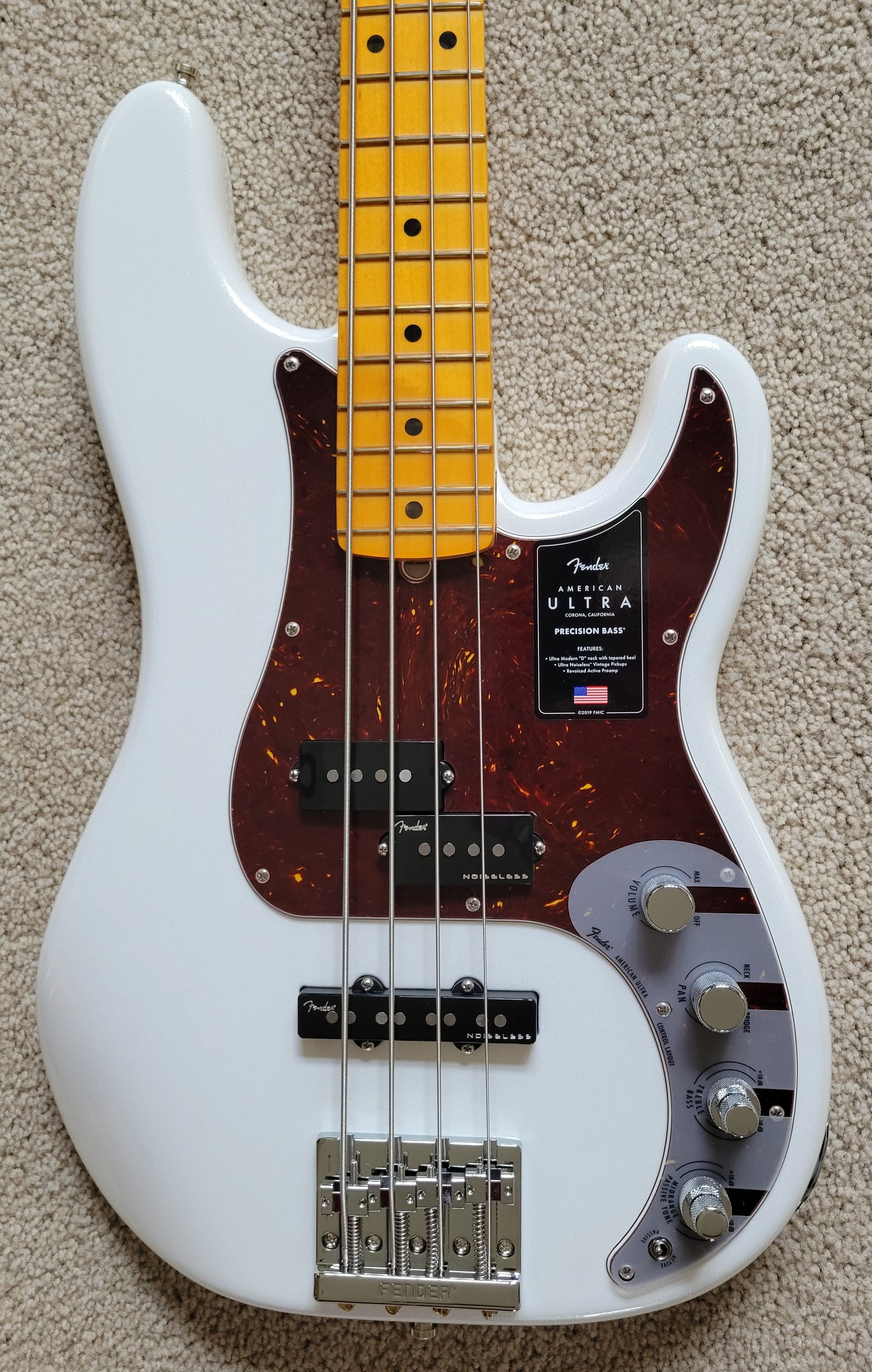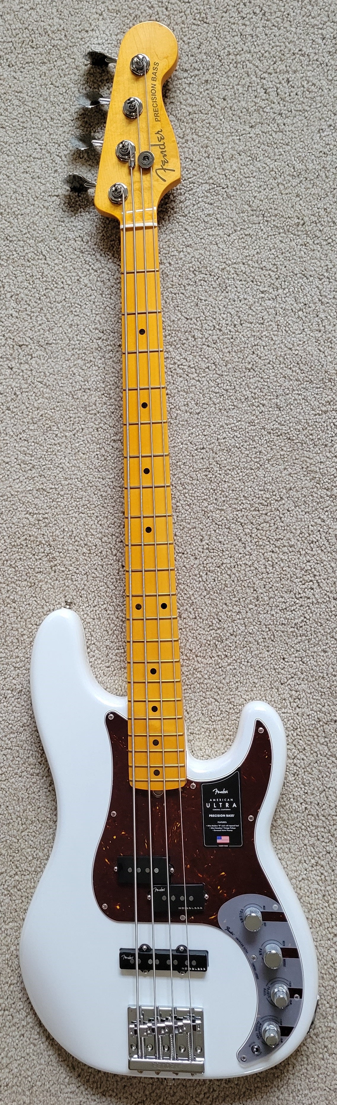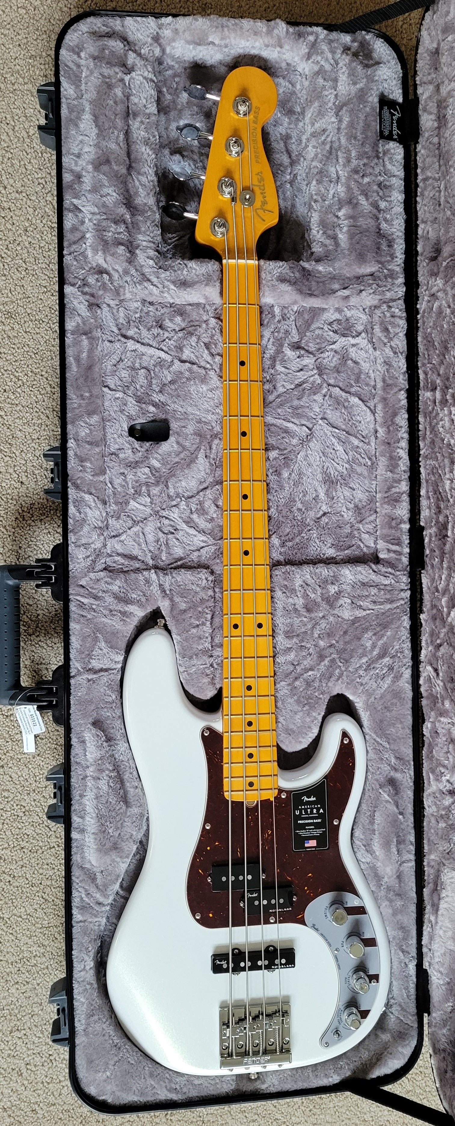 Fender American Ultra Precision Bass Guitar, Arctic Pearl, Premium Molded Hard Shell Case