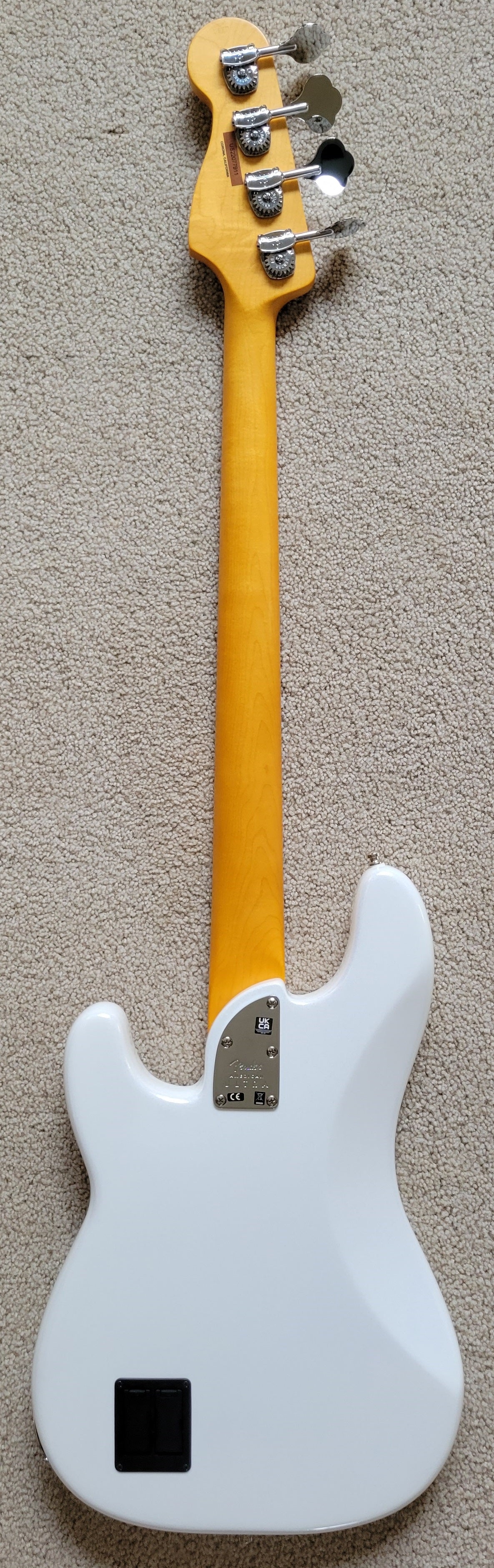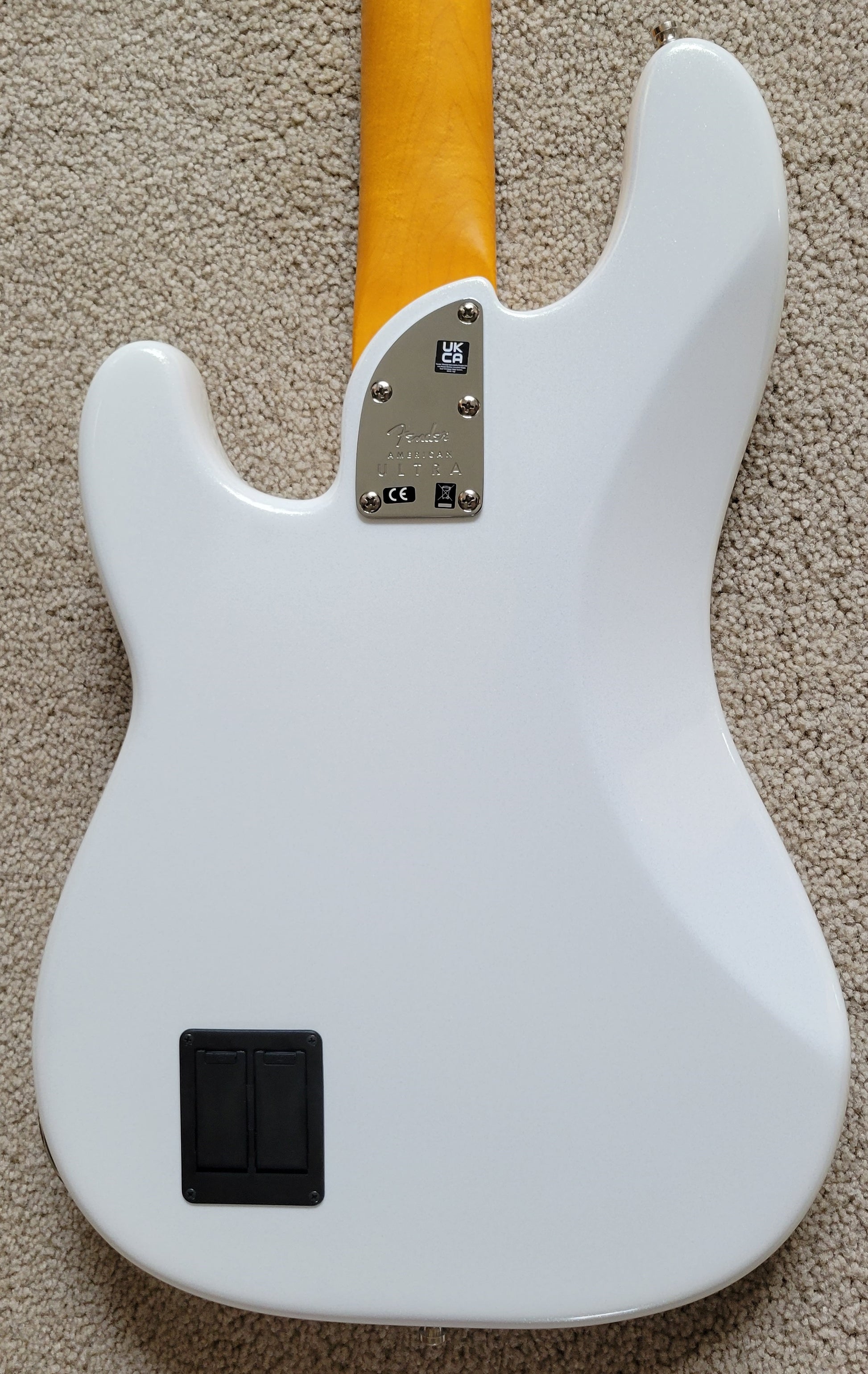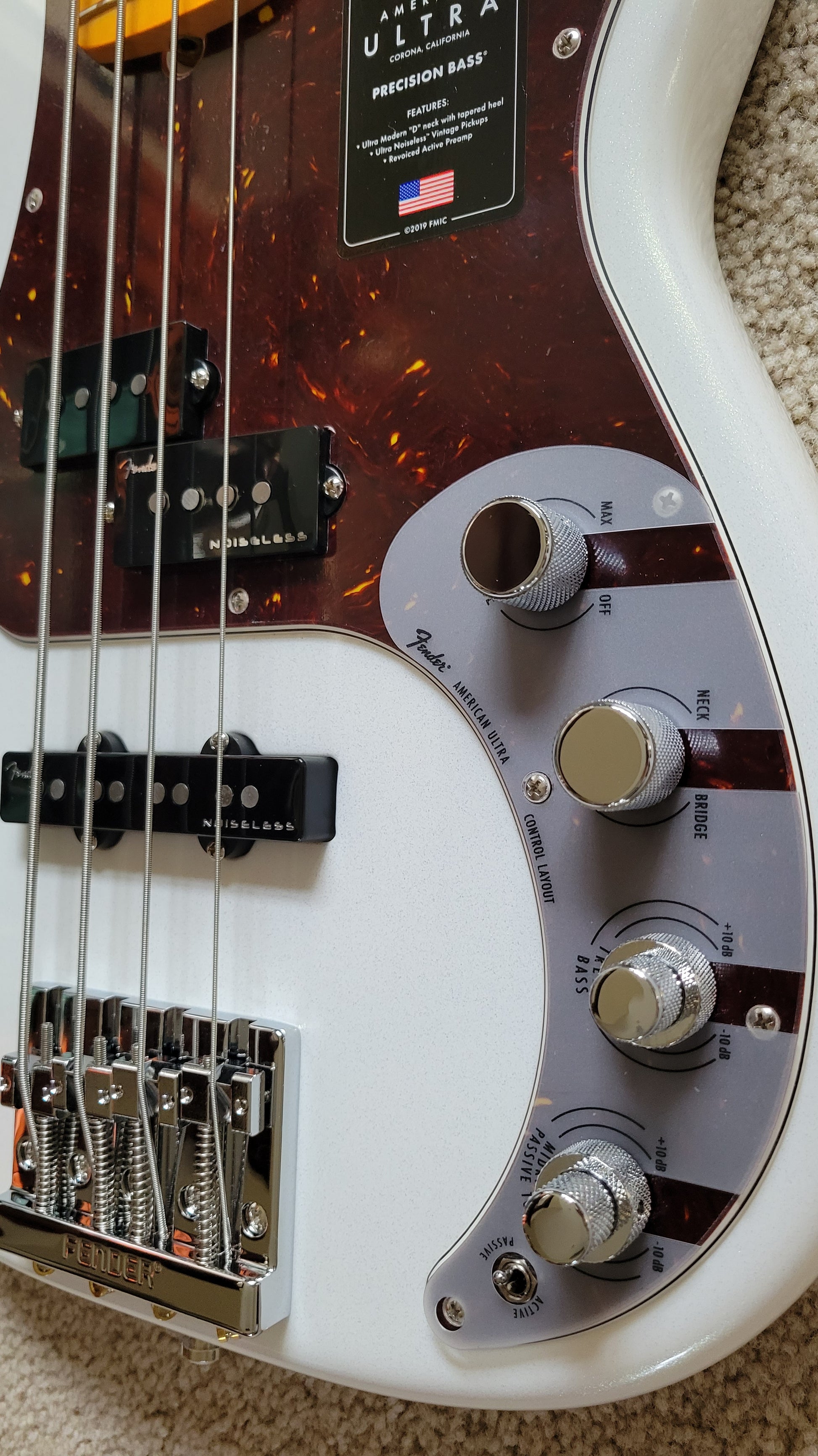 Fender American Ultra Precision Bass Guitar, Arctic Pearl, Premium Molded Hard Shell Case