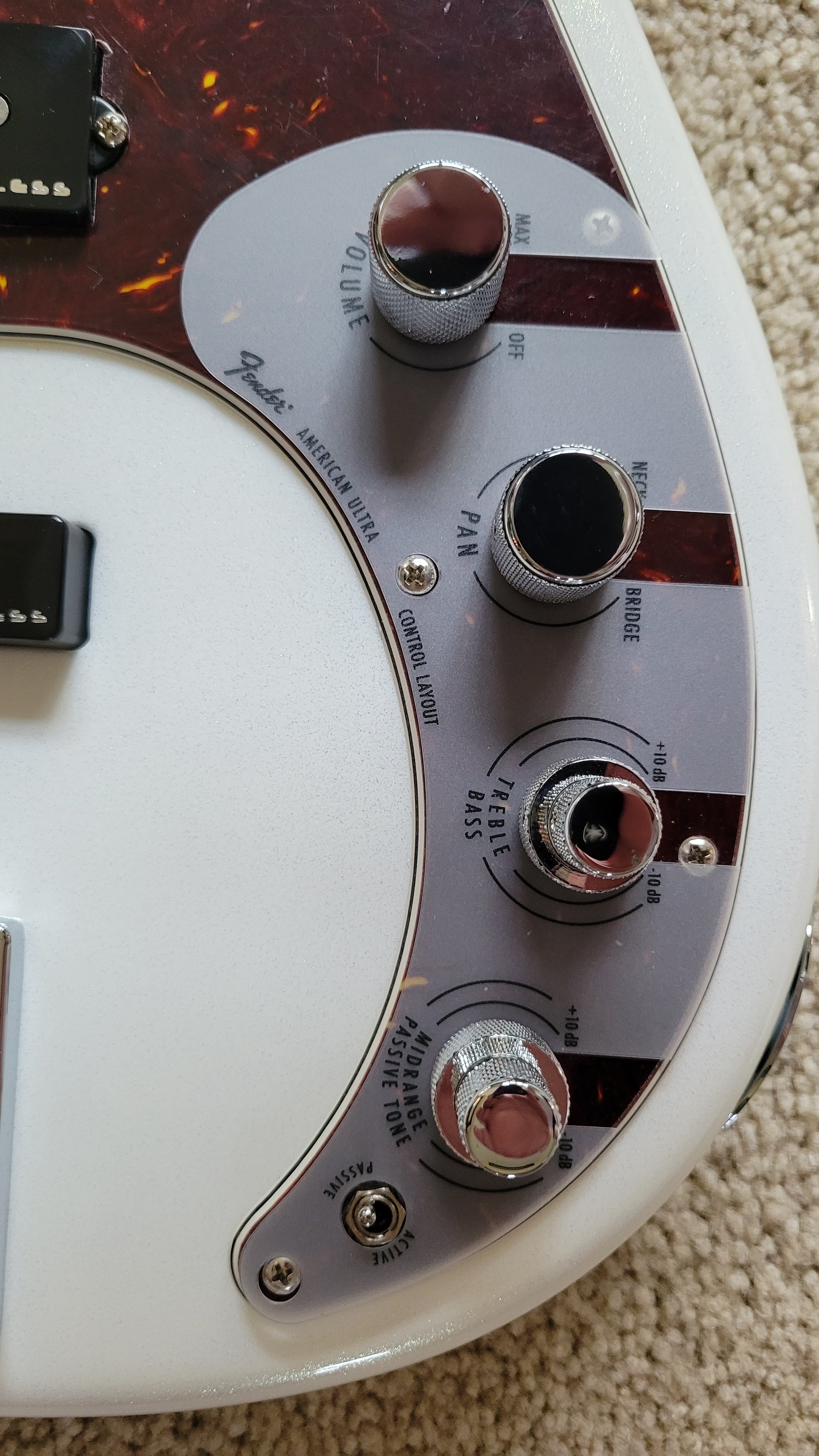 Controls Master Volume, Pan Pot (Pickup Selector), Treble Boost/Cut, Midrange Boost/Cut, Bass Boost/Cut, Passive Tone, Active/Passive Mini Toggle