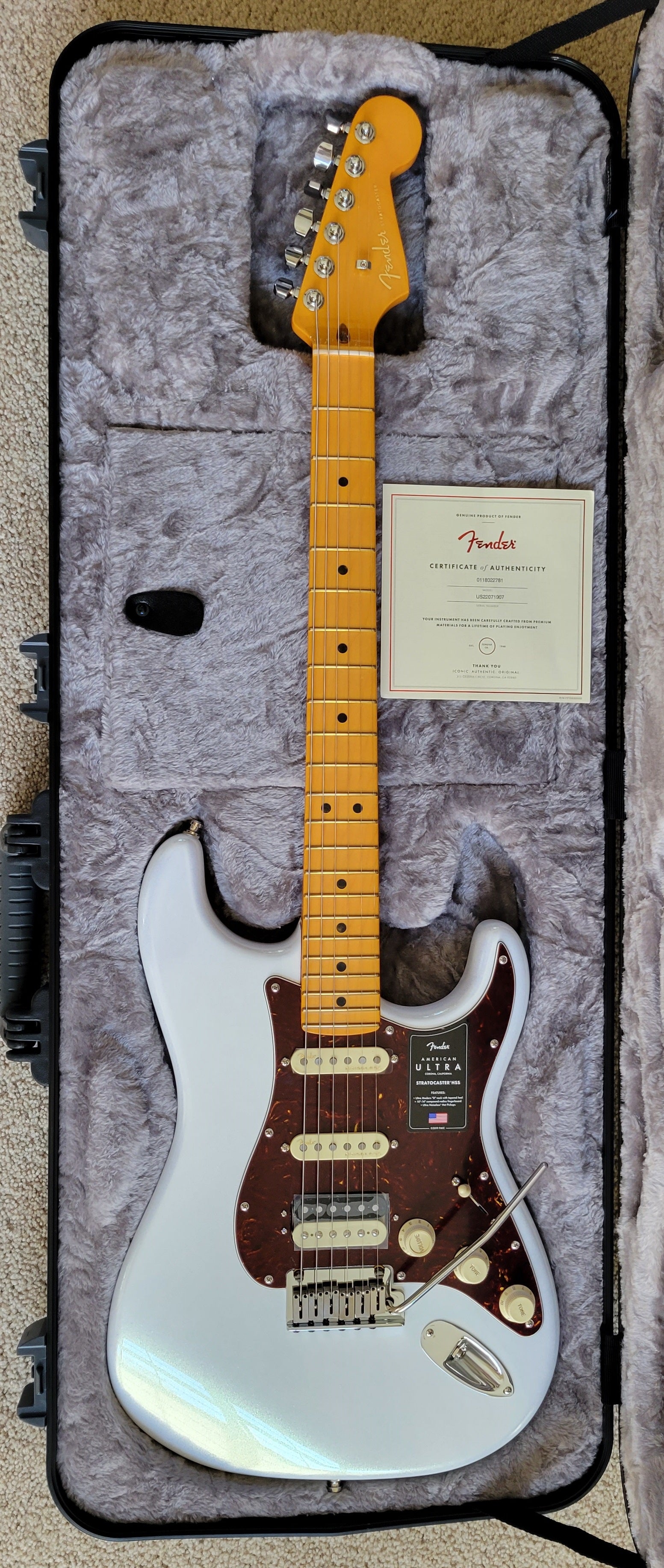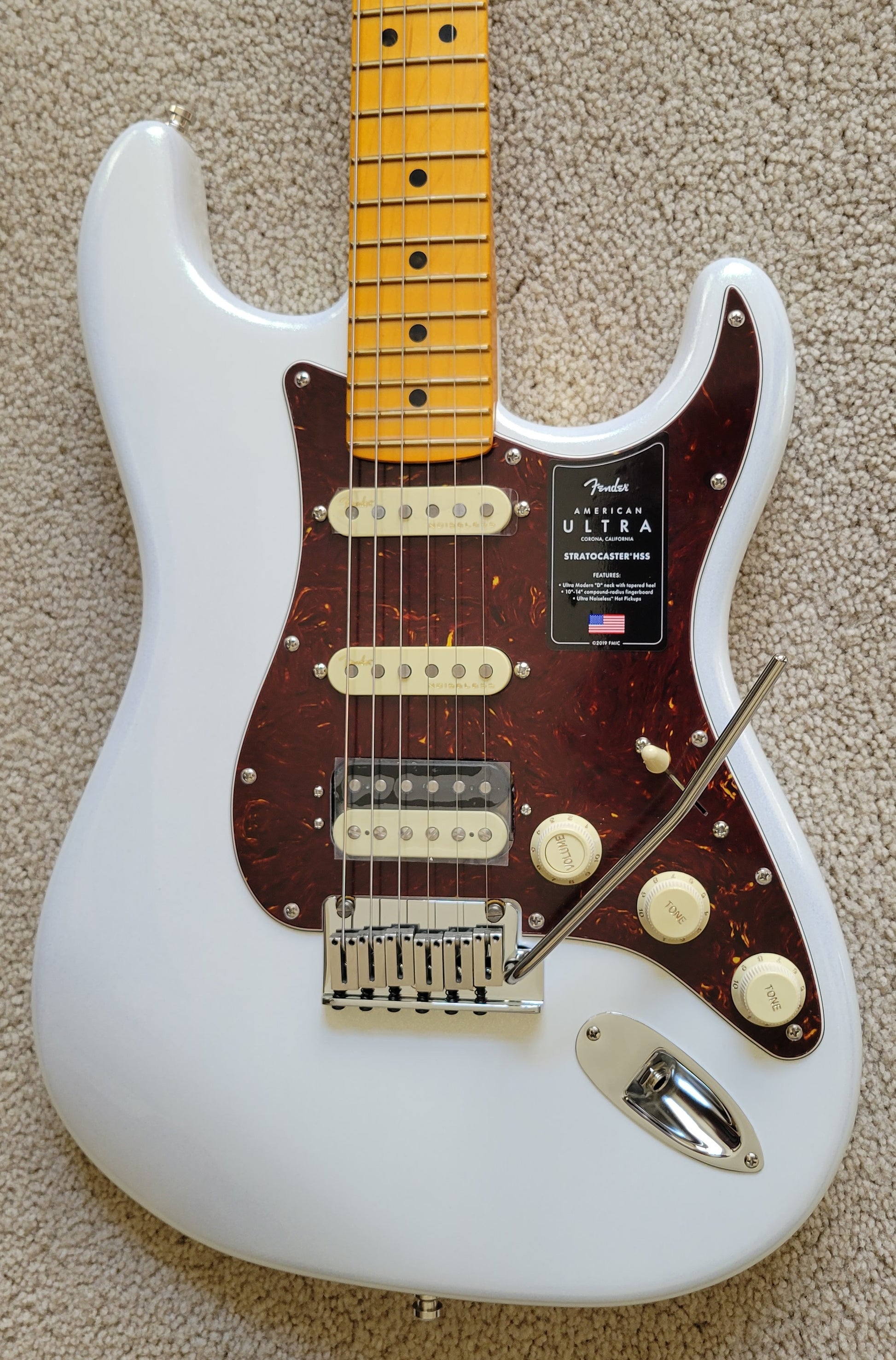 Fender American Ultra Stratocaster HSS Electric Guitar, Arctic Pearl, Premium Molded HSC