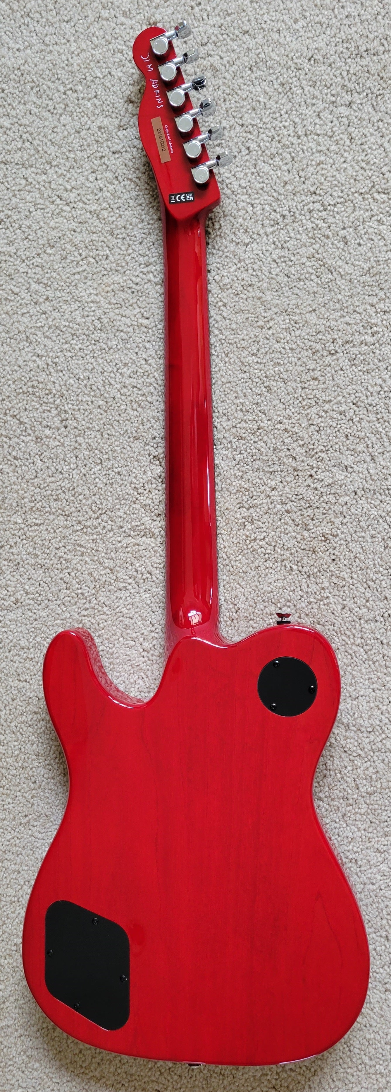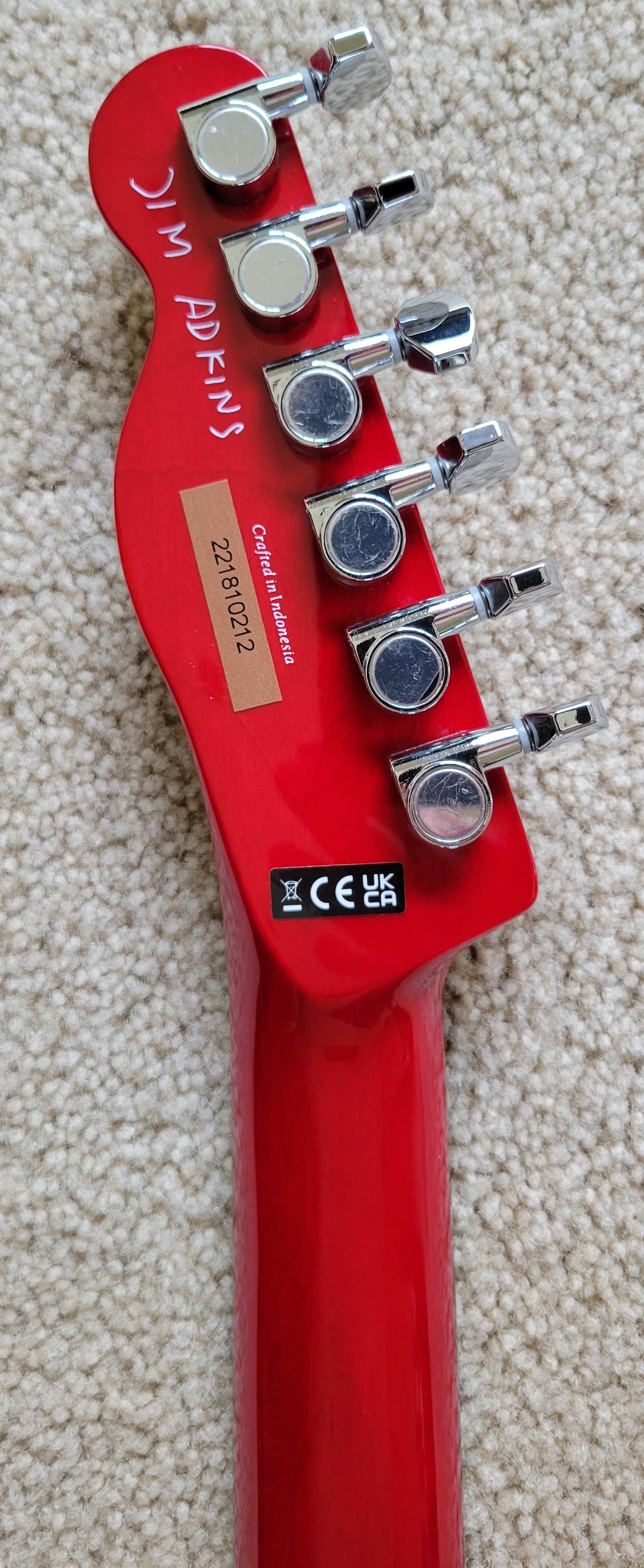 Other Features Matching Painted Headstock, Jim Adkins Signature on Back of Headstock, Black Plastic Parts, Knurled Dome Knobs, White Pearloid Dot Position Inlays, Graphite Nut, Oversized Strap Buttons
