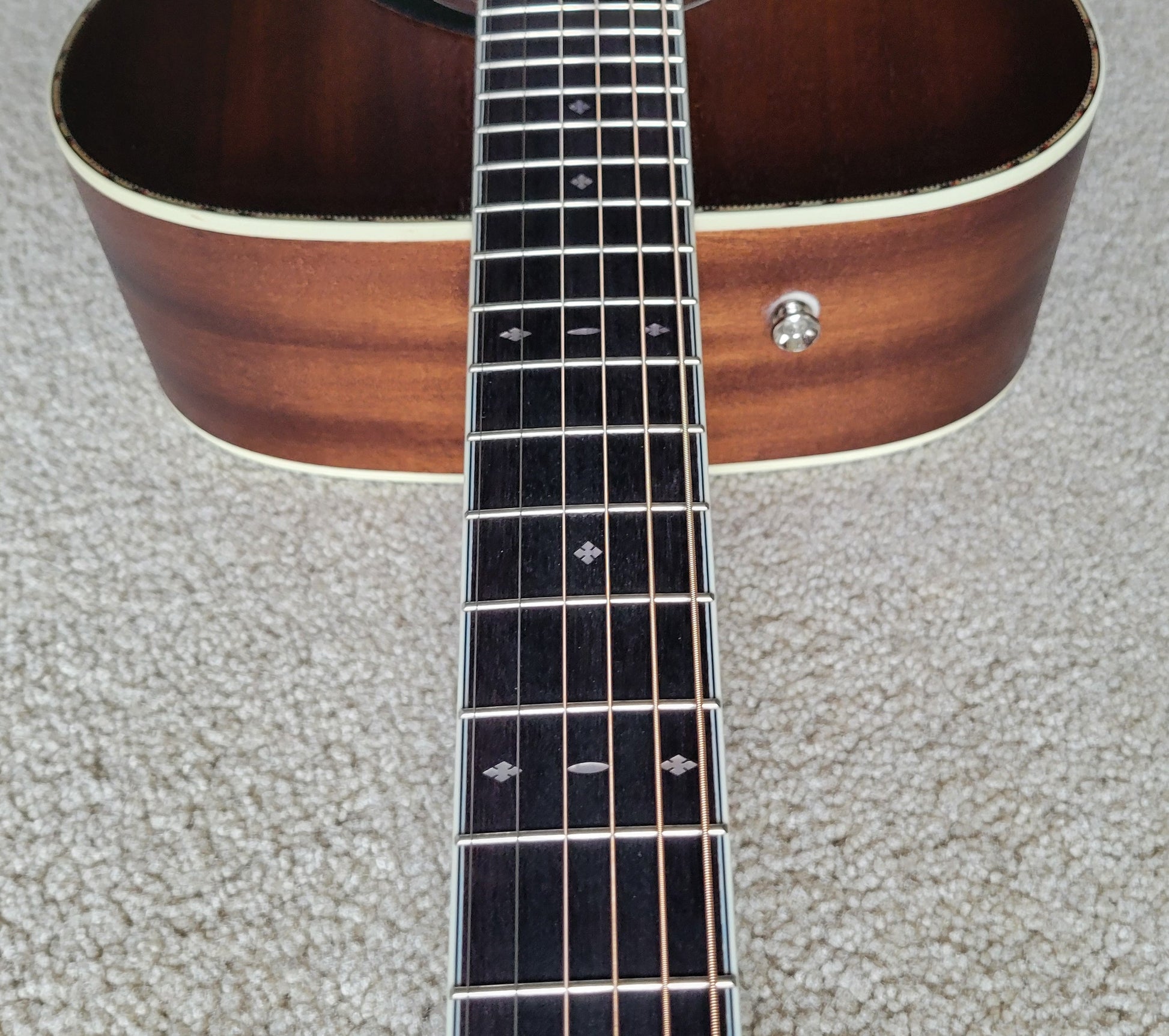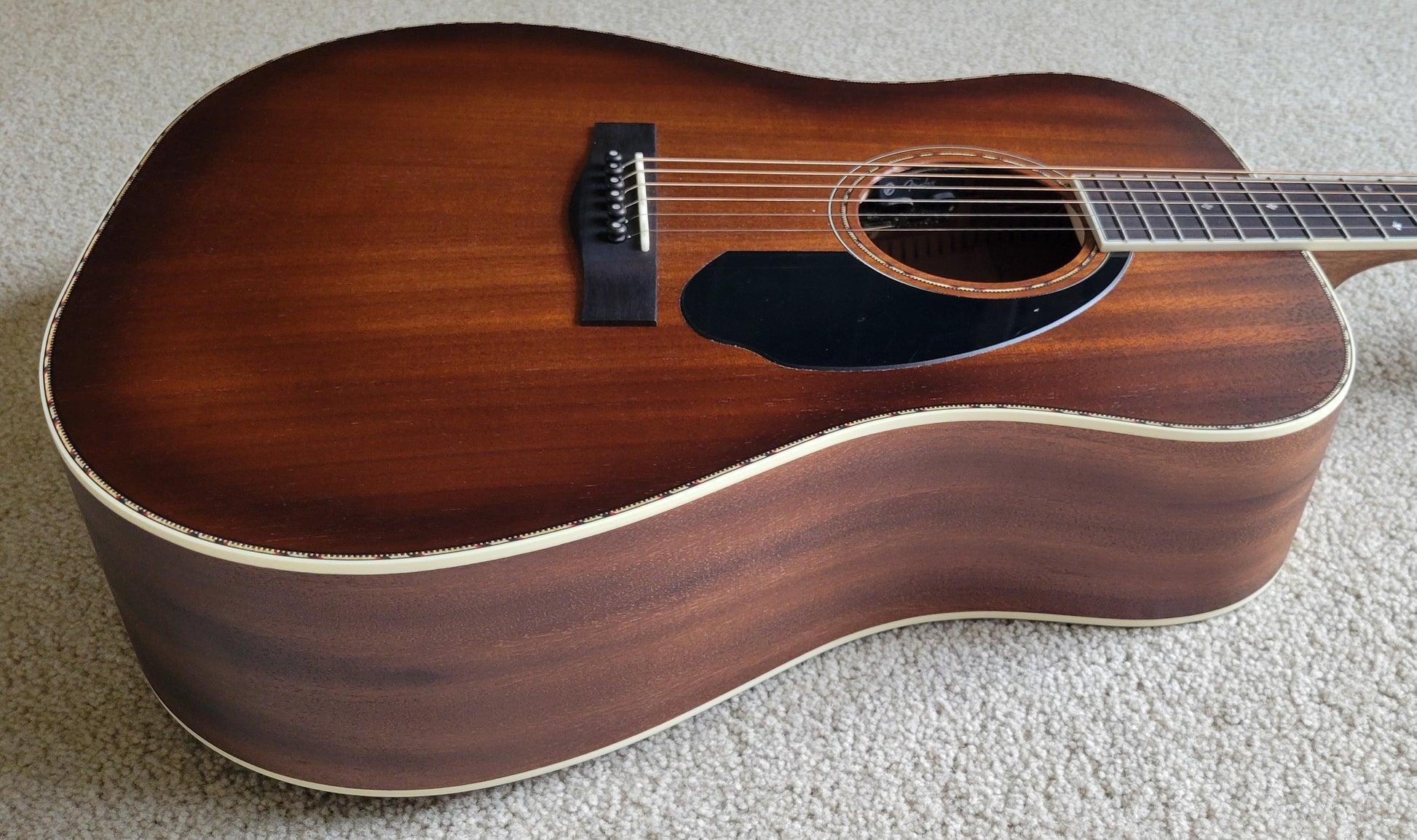 Updated cosmetics include snowflake-shaped pearloid fingerboard inlays, feathered purfling, rosette, and backstrip, and a Black or Tiger Stripe pickguard. The PD-220E also features an ovangkol bridge and fingerboard, slim-taper mahogany neck, bone nut and saddle, and comes with a hardshell case.