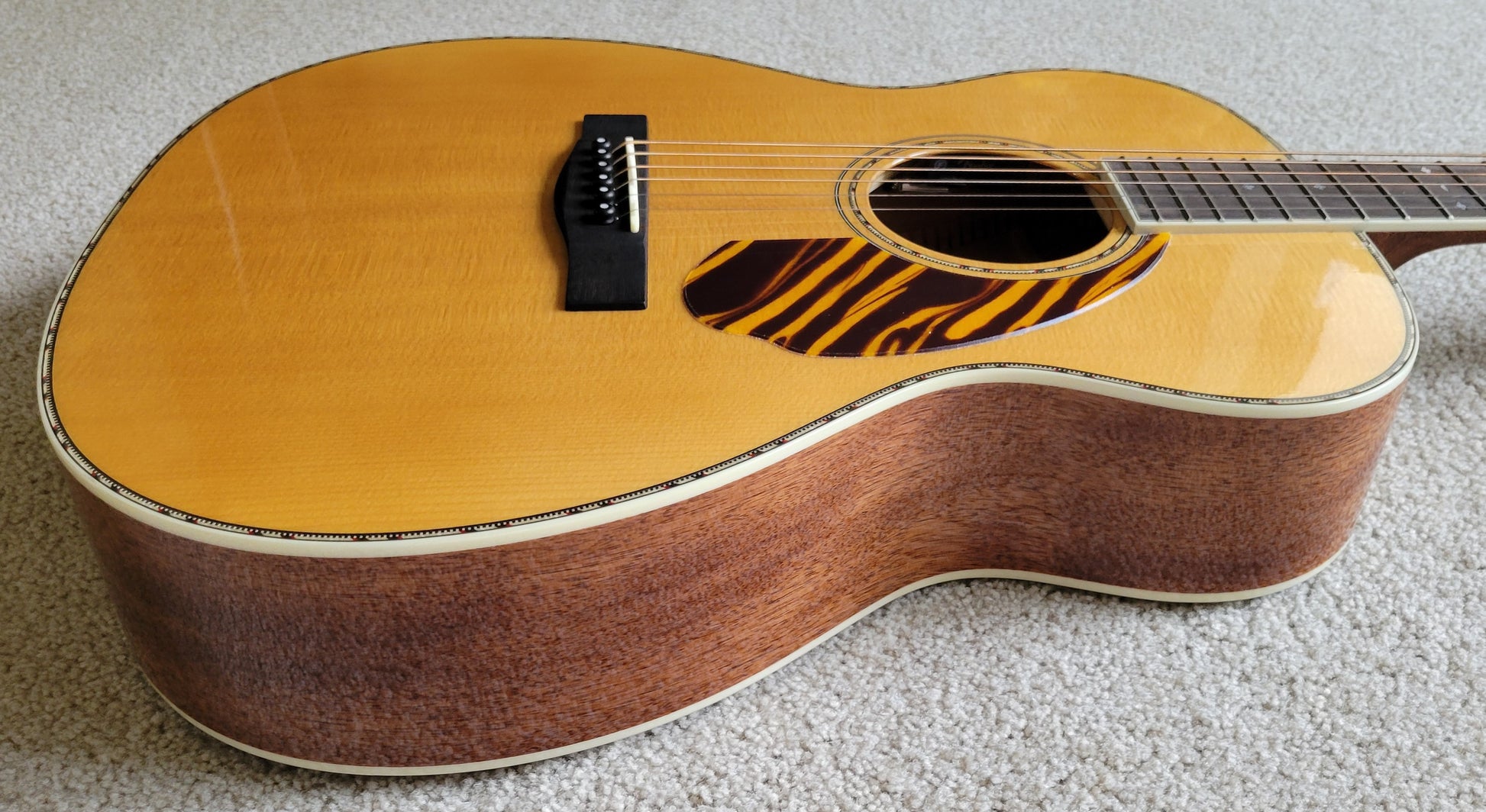 Updated cosmetics include snowflake-shaped pearloid fingerboard inlays, feathered purfling, rosette, and backstrip, and a Black or Tiger Stripe pickguard. The PO-220E also features an ovangkol bridge and fingerboard, slim-taper mahogany neck, bone nut and saddle, and comes with a hardshell case.