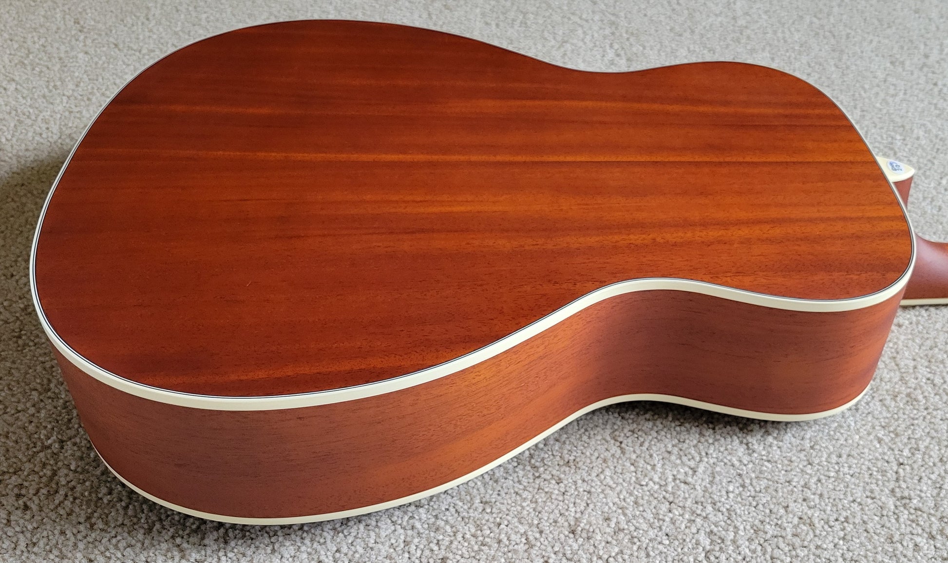 Other features include dual F-hole soundholes, a comfortable neck profile, ovangkol fingerboard with dot inlays, a genuine bone nut, and hardshell case.