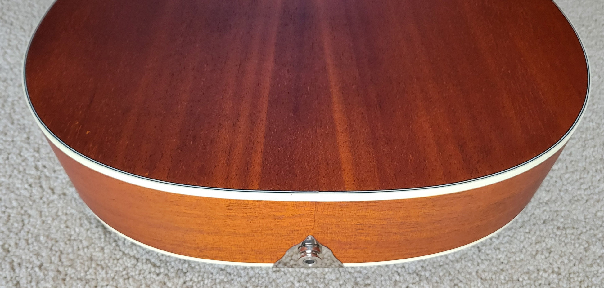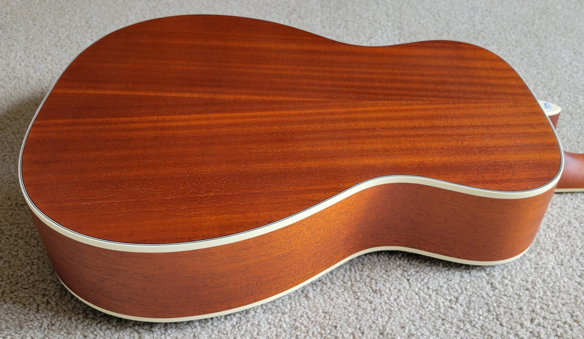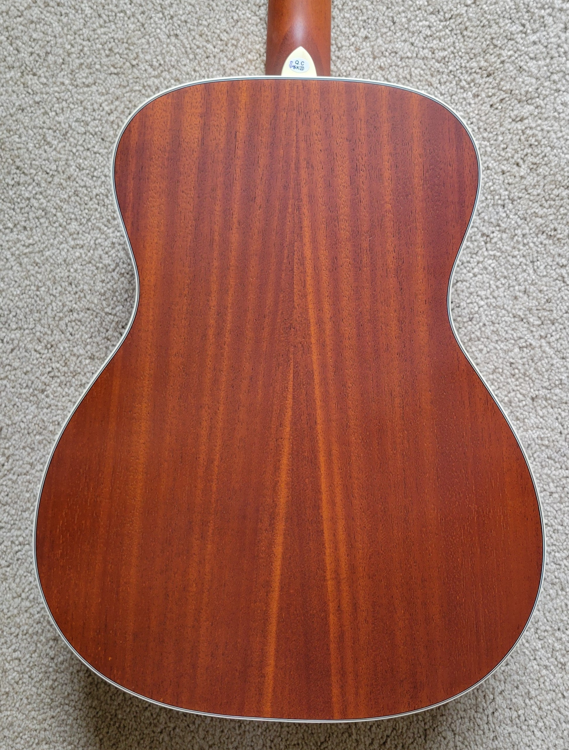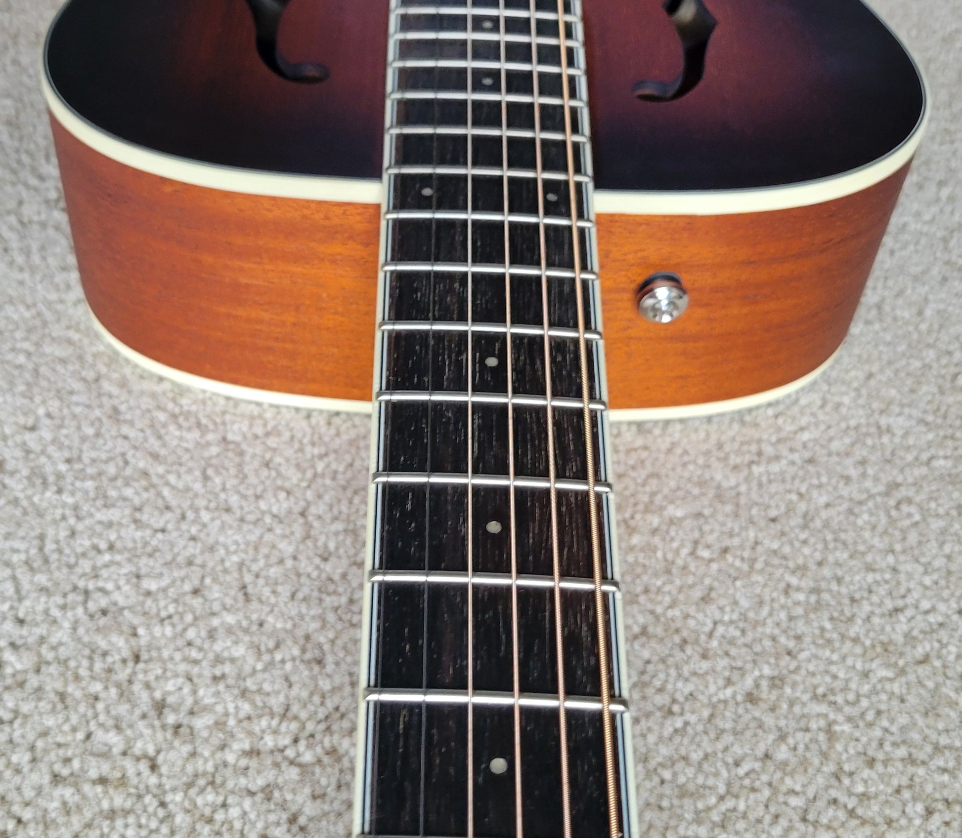 - Mahogany top with F-holes, mahogany back and sides