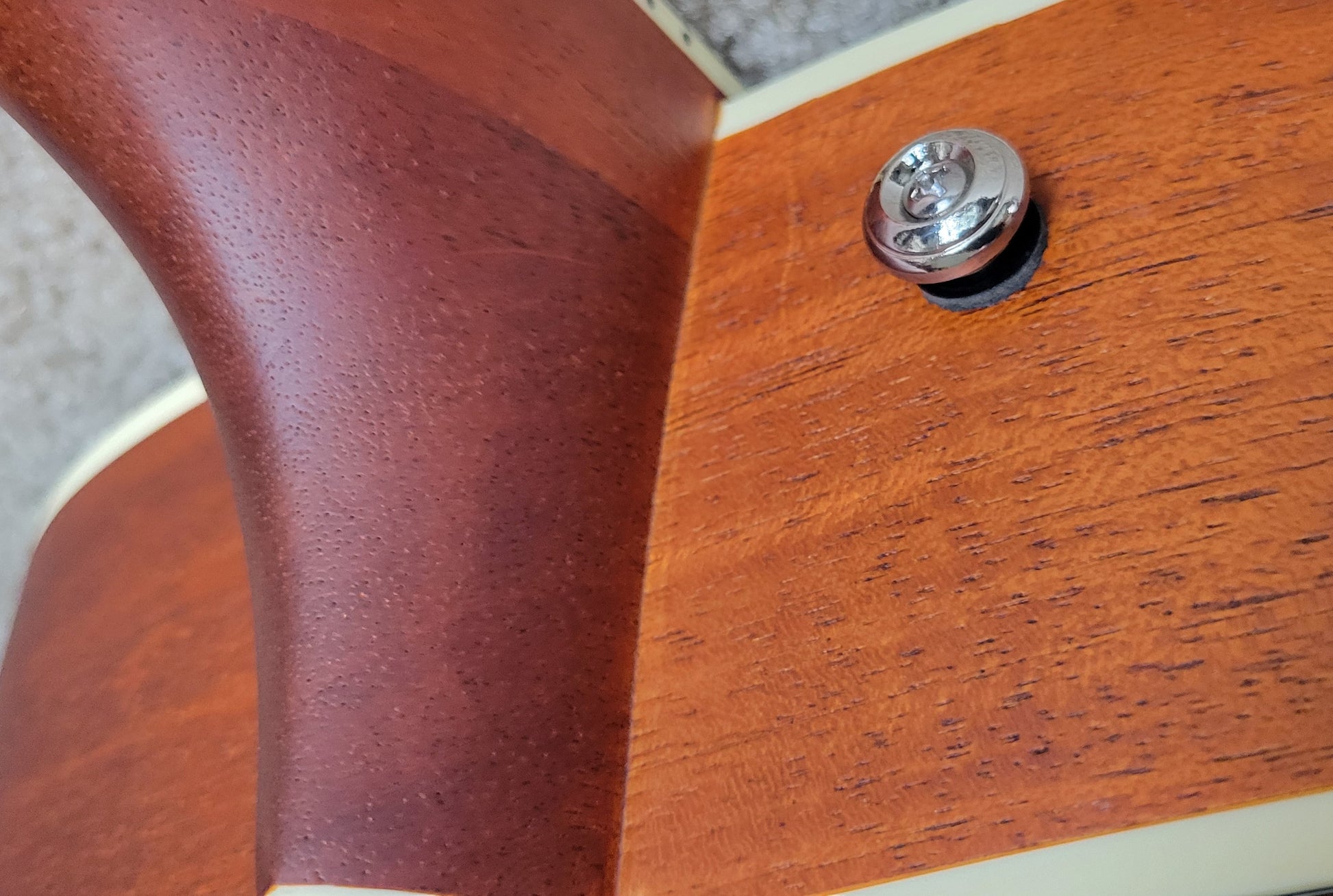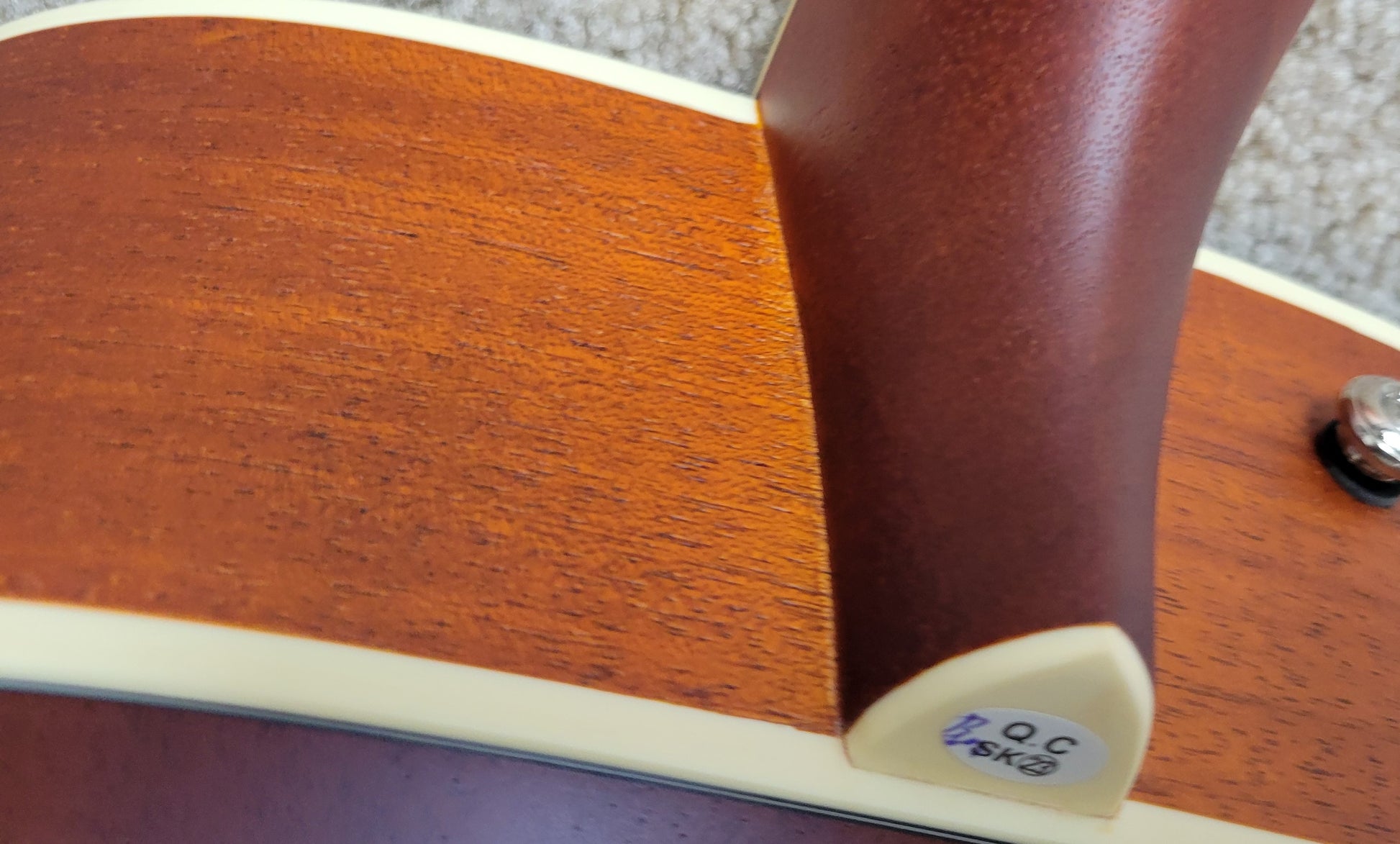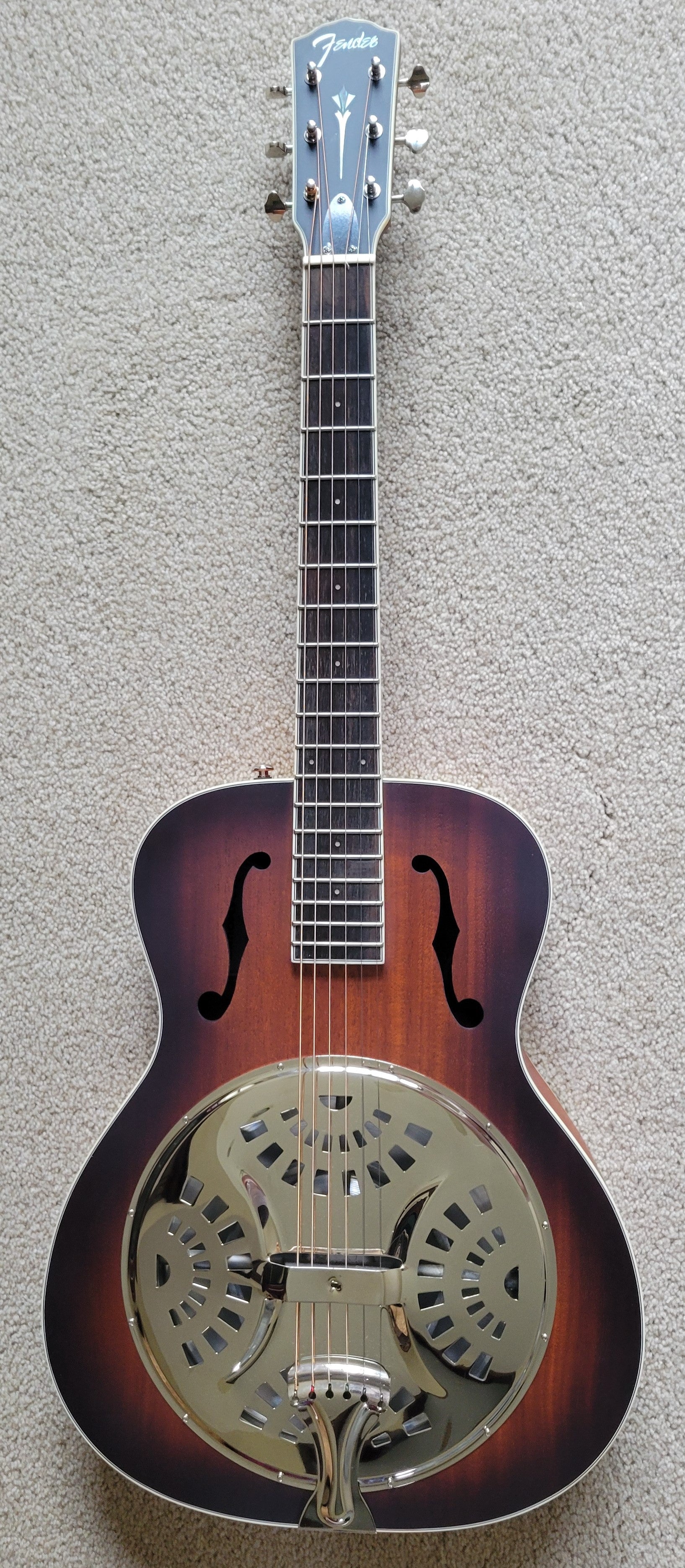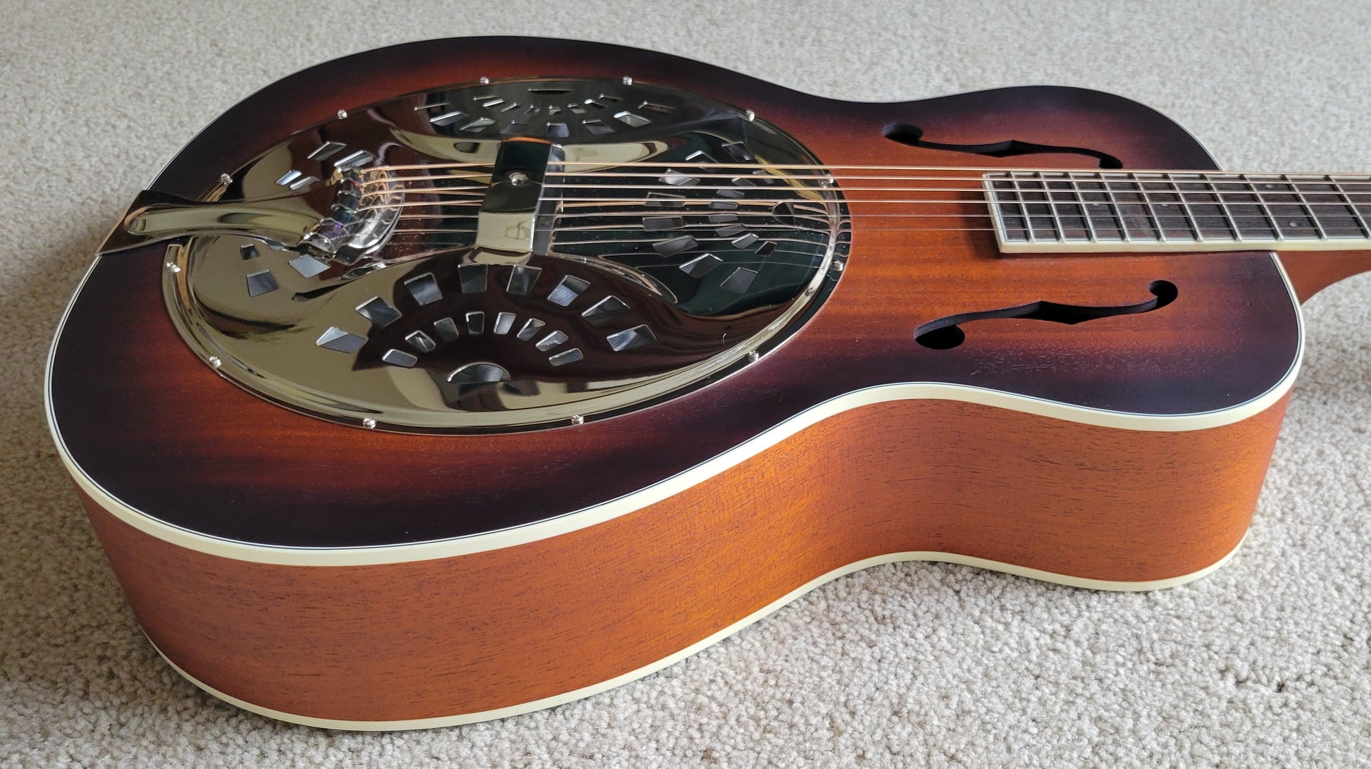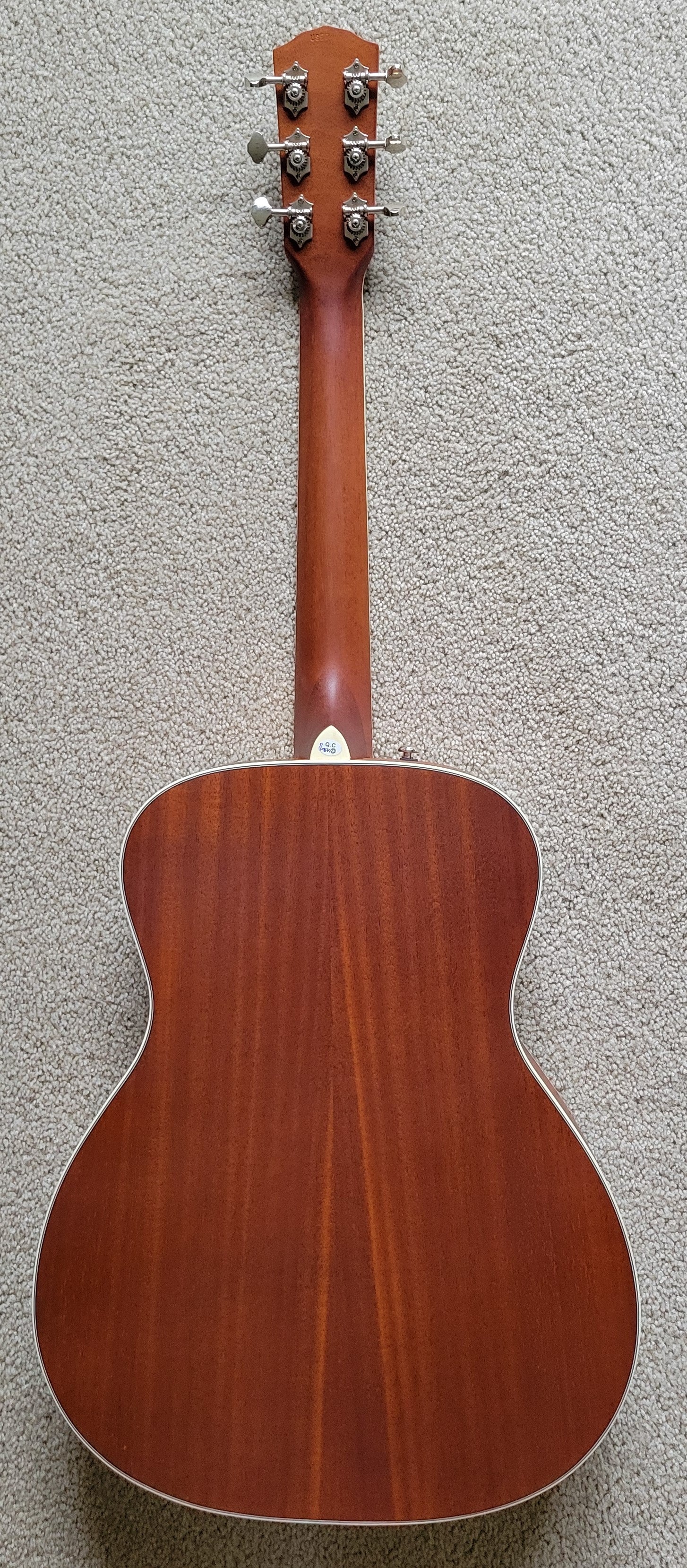 - Mahogany top with F-holes, mahogany back and sides