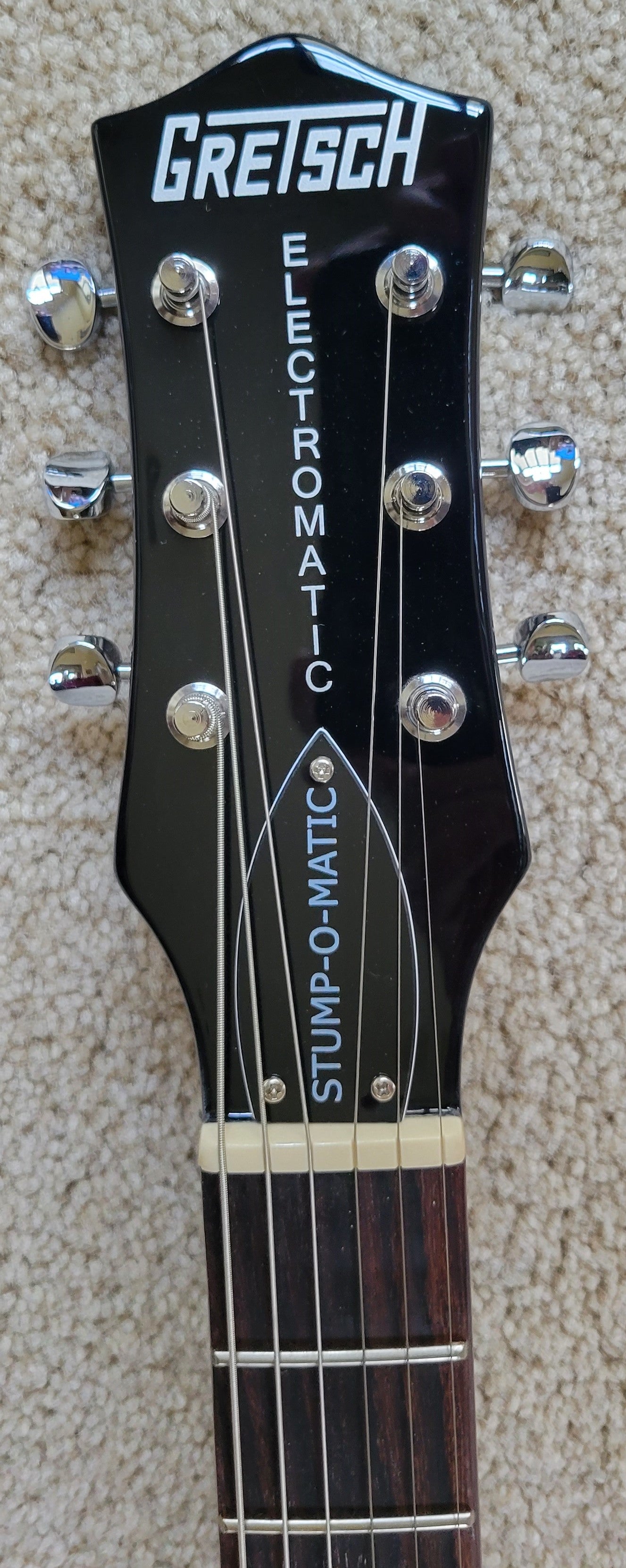 OTHER FEATURES White Color Scheme with Gray Competition Stripes, Patrick Stump 1-Ply White Pickguard, Aged White Dot Position Markers, G-Arrow Knobs, Stump-O-Matic on Truss Rod Cover, Side-Mounted Jack Plate, Knurled Strap Retainer Knobs, Adjustable Truss Rod