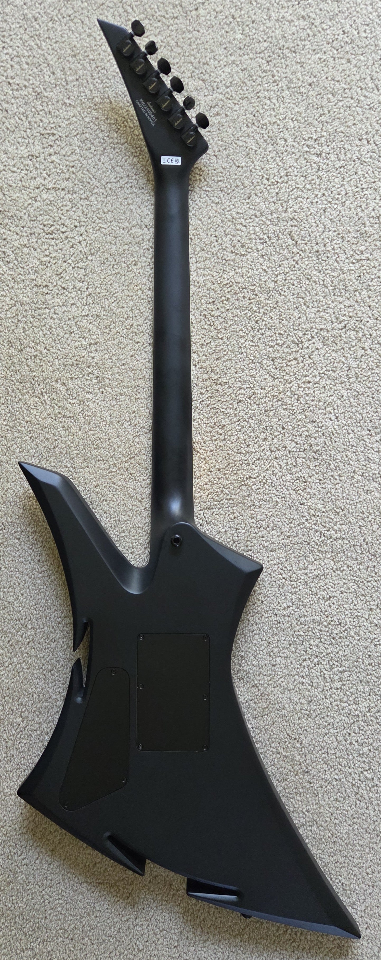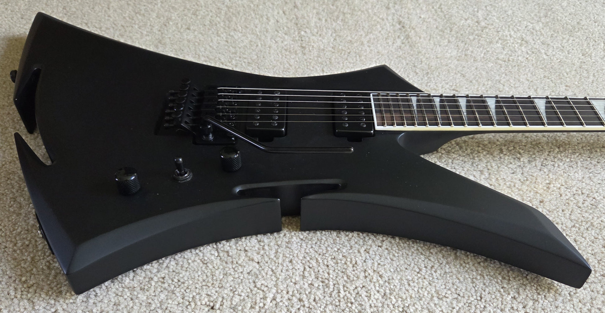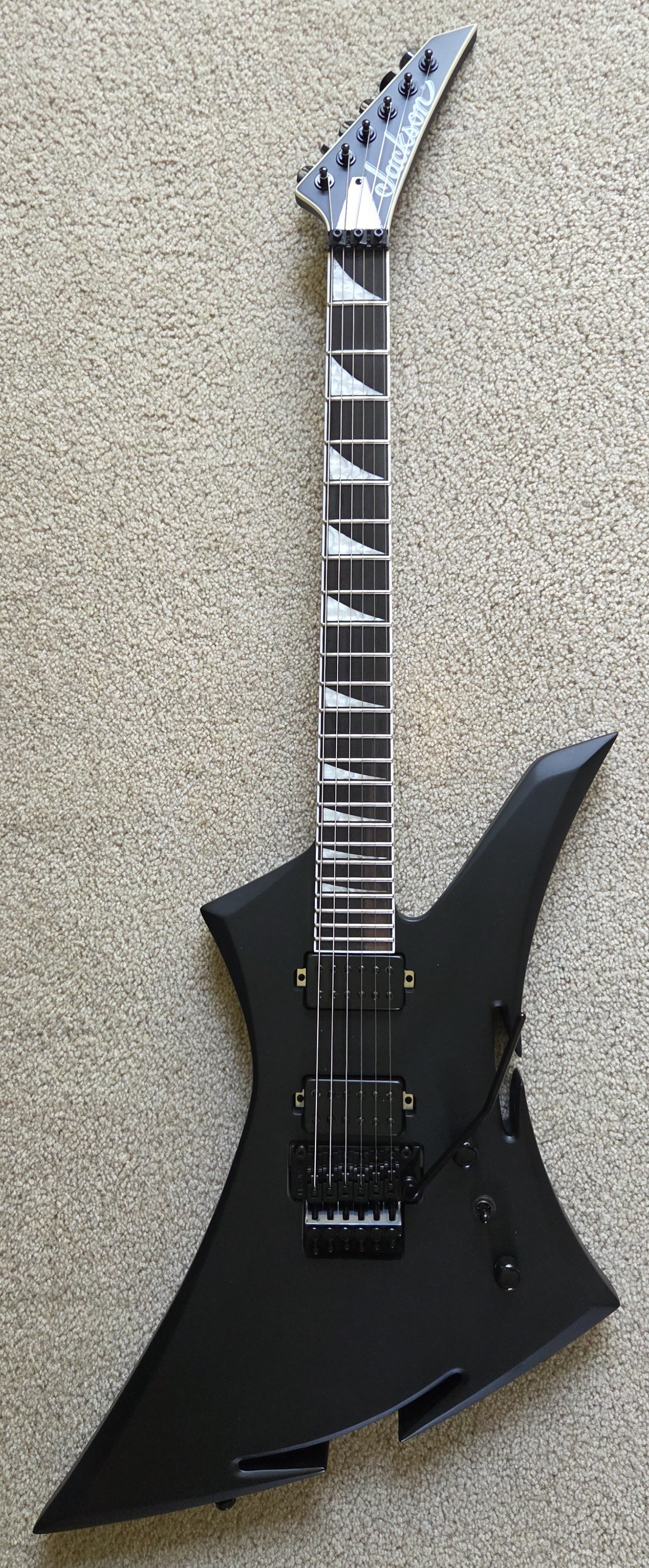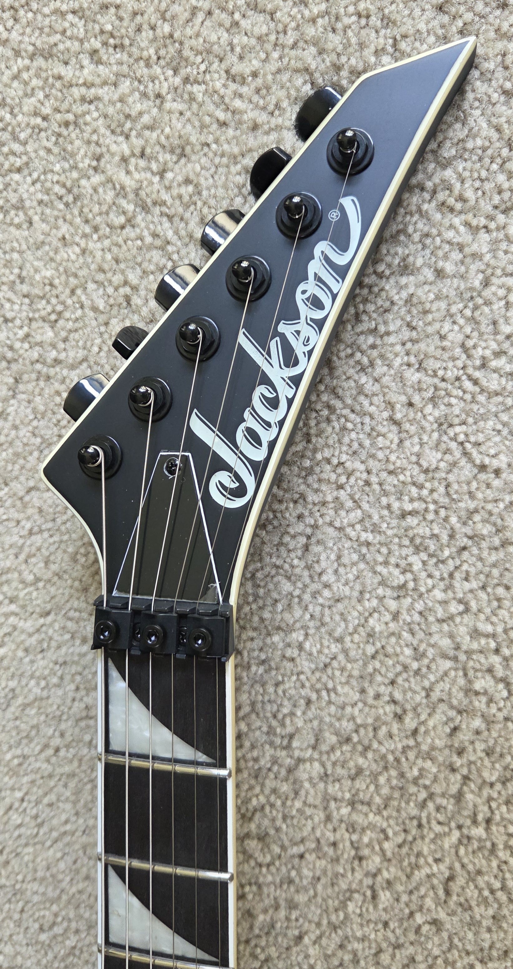 - Available in satin black Jackson pointed 6-in-line headstock and black hardware