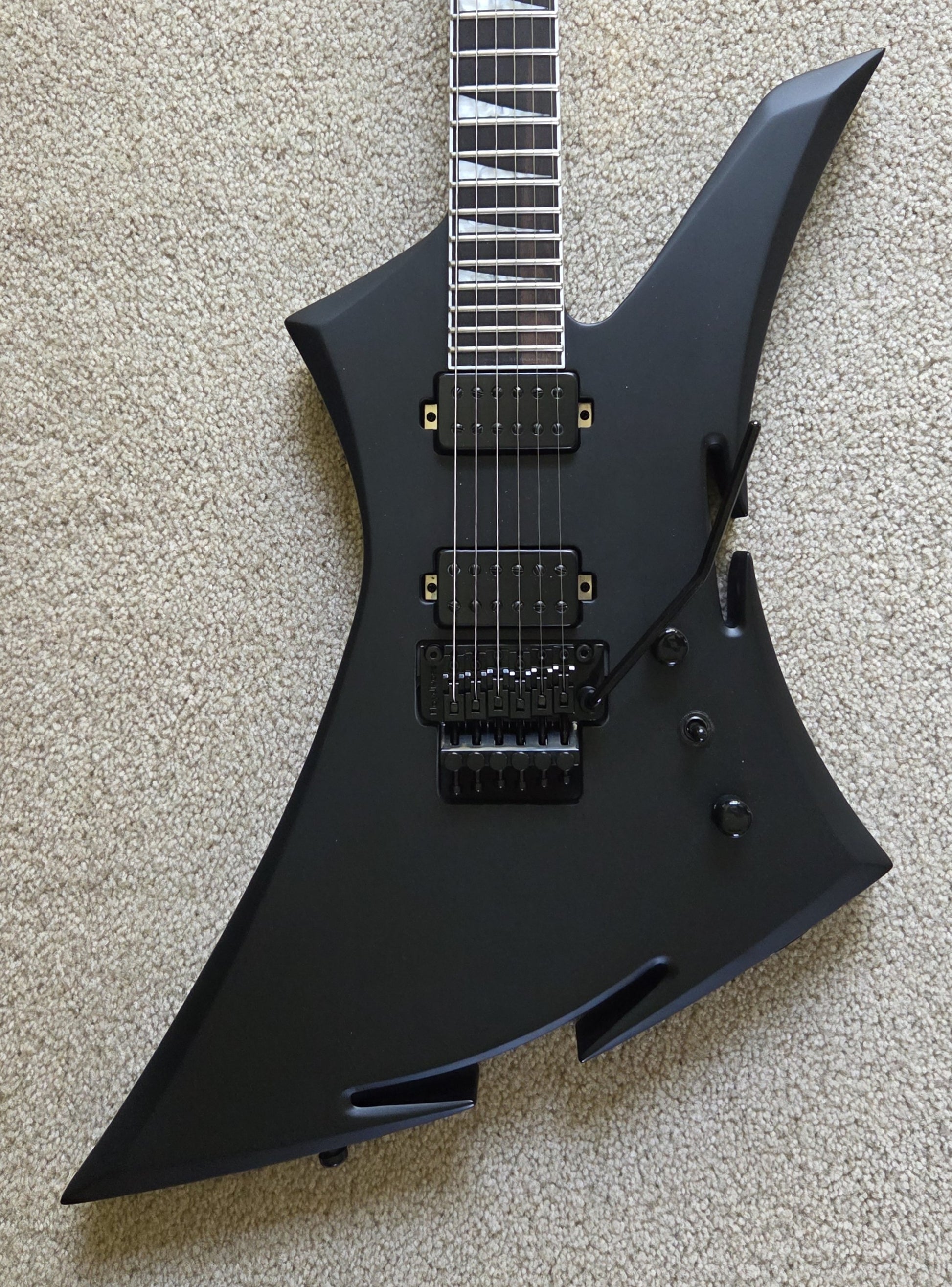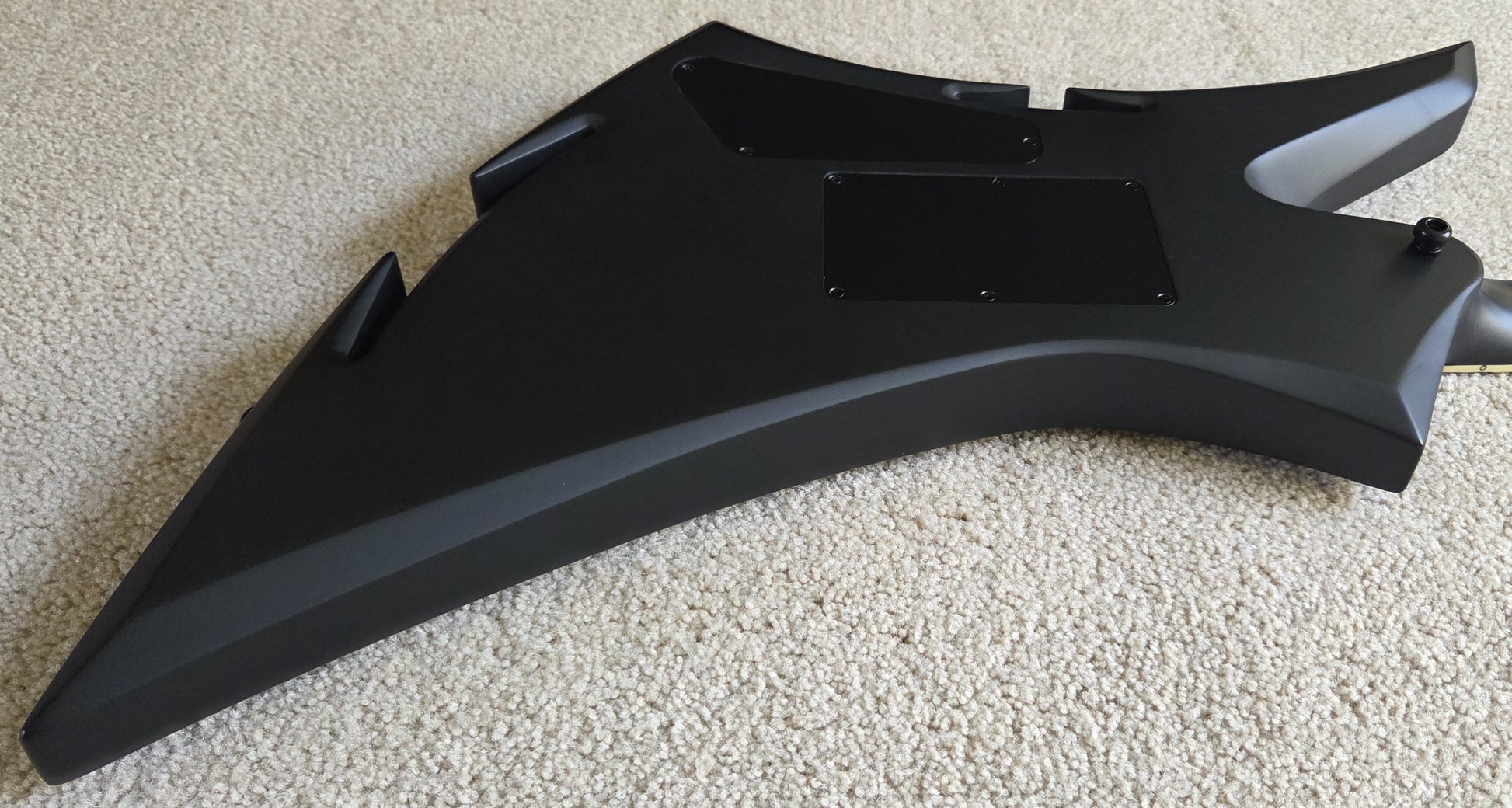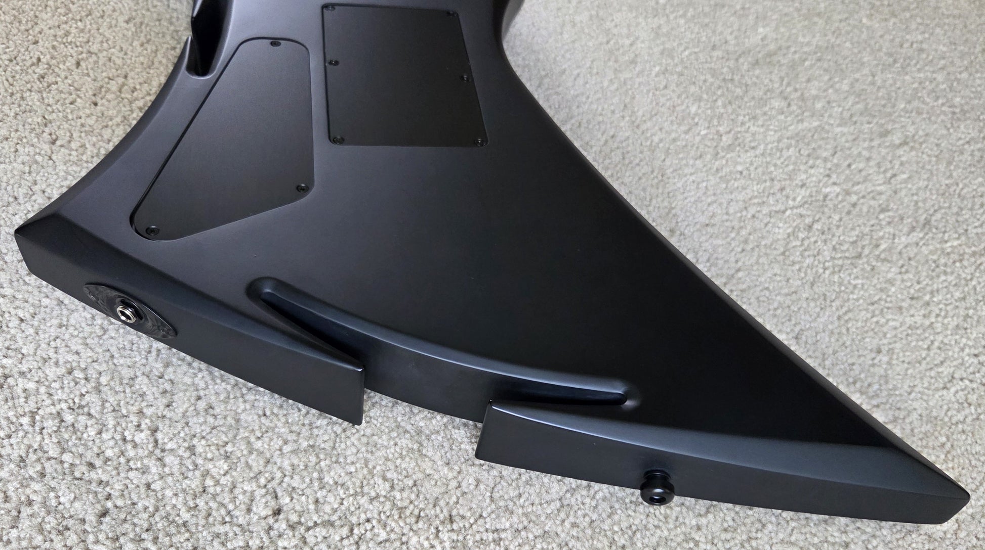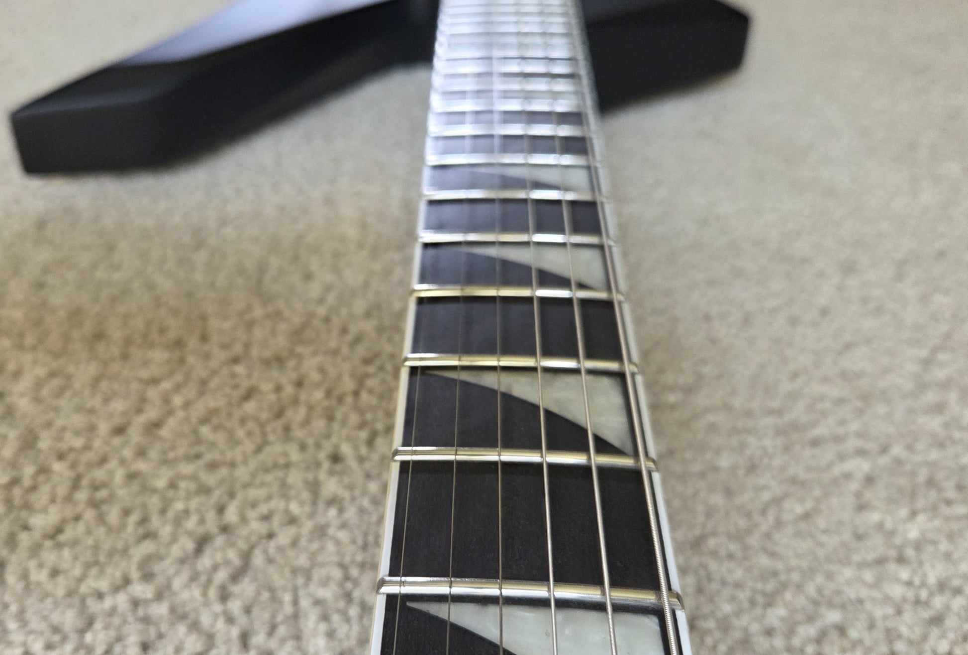 - Available in satin black Jackson pointed 6-in-line headstock and black hardware