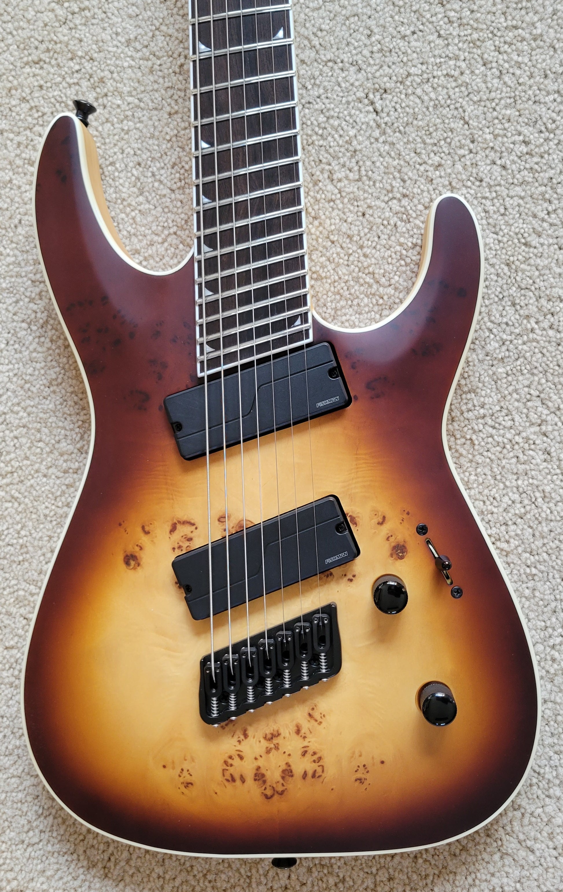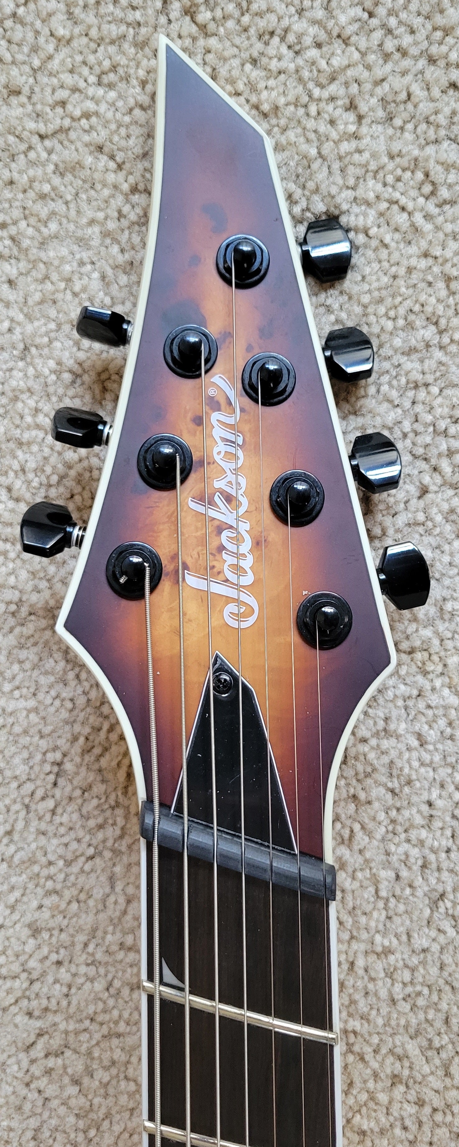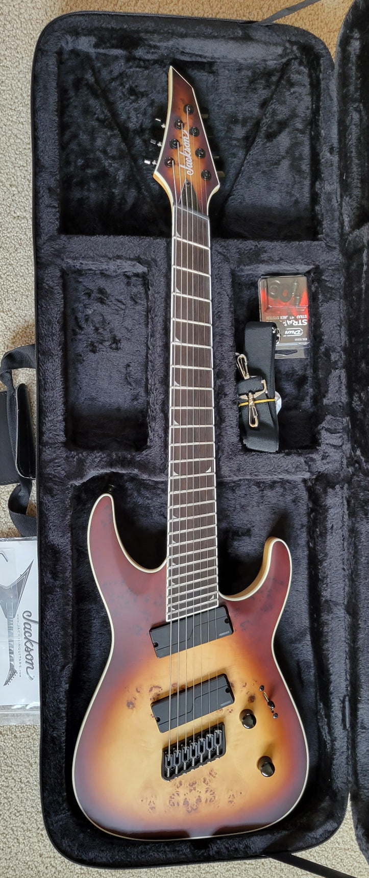 Swathed in sinister Jackson style, the Concept Series Soloist SLAT7P HT MS comes in Satin Bourbon Burst with all-black hardware including Gotoh tuners and Dunlop dual-locking strap buttons, Graph Tech TUSQ XL nut, distinctive pearloid piranha tooth inlays and color matched reverse Jackson AT-1 3x4 black headstock.