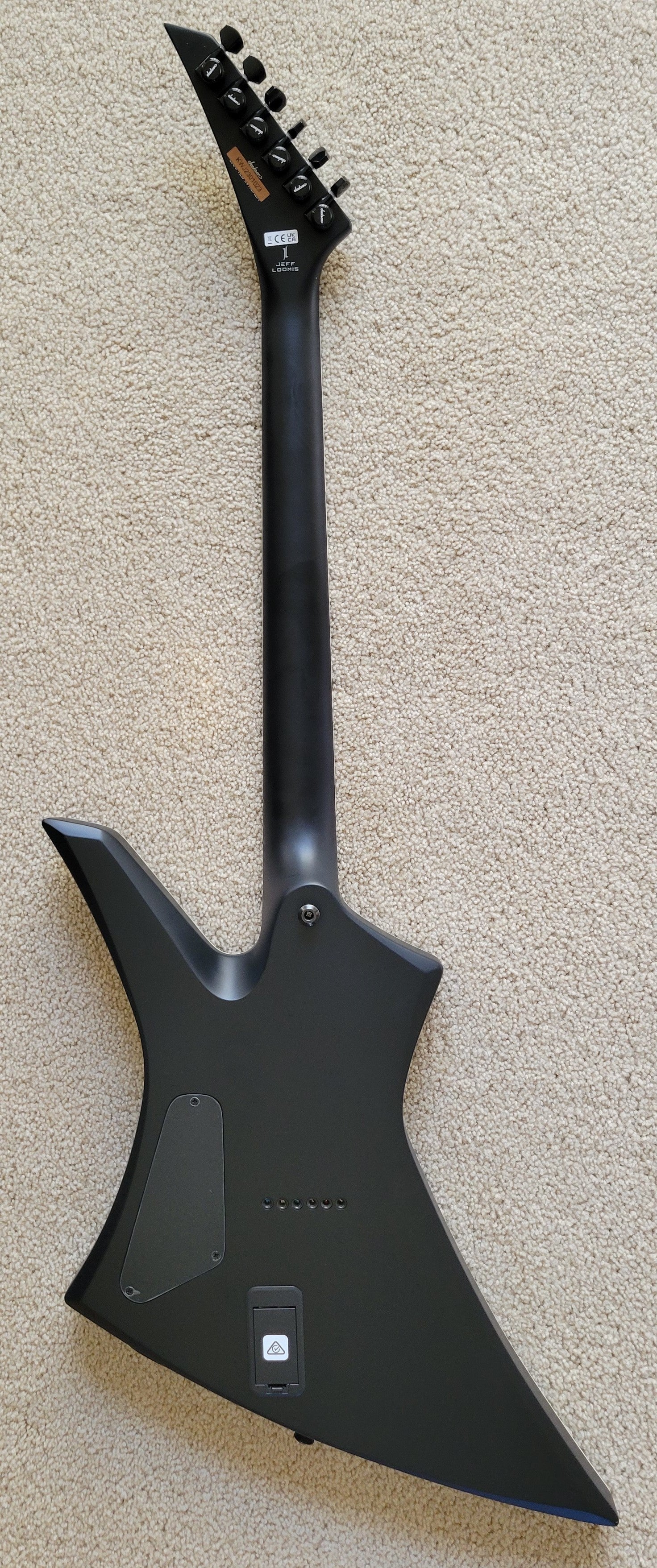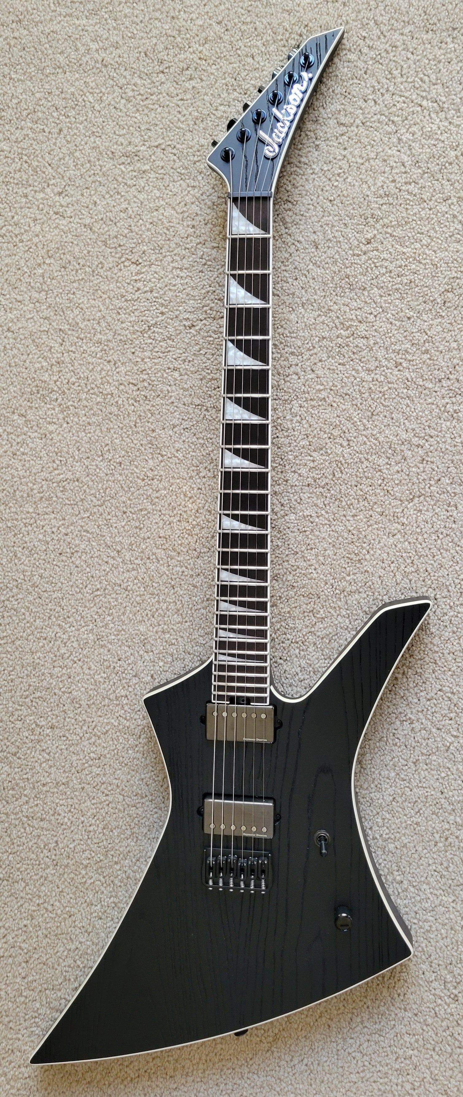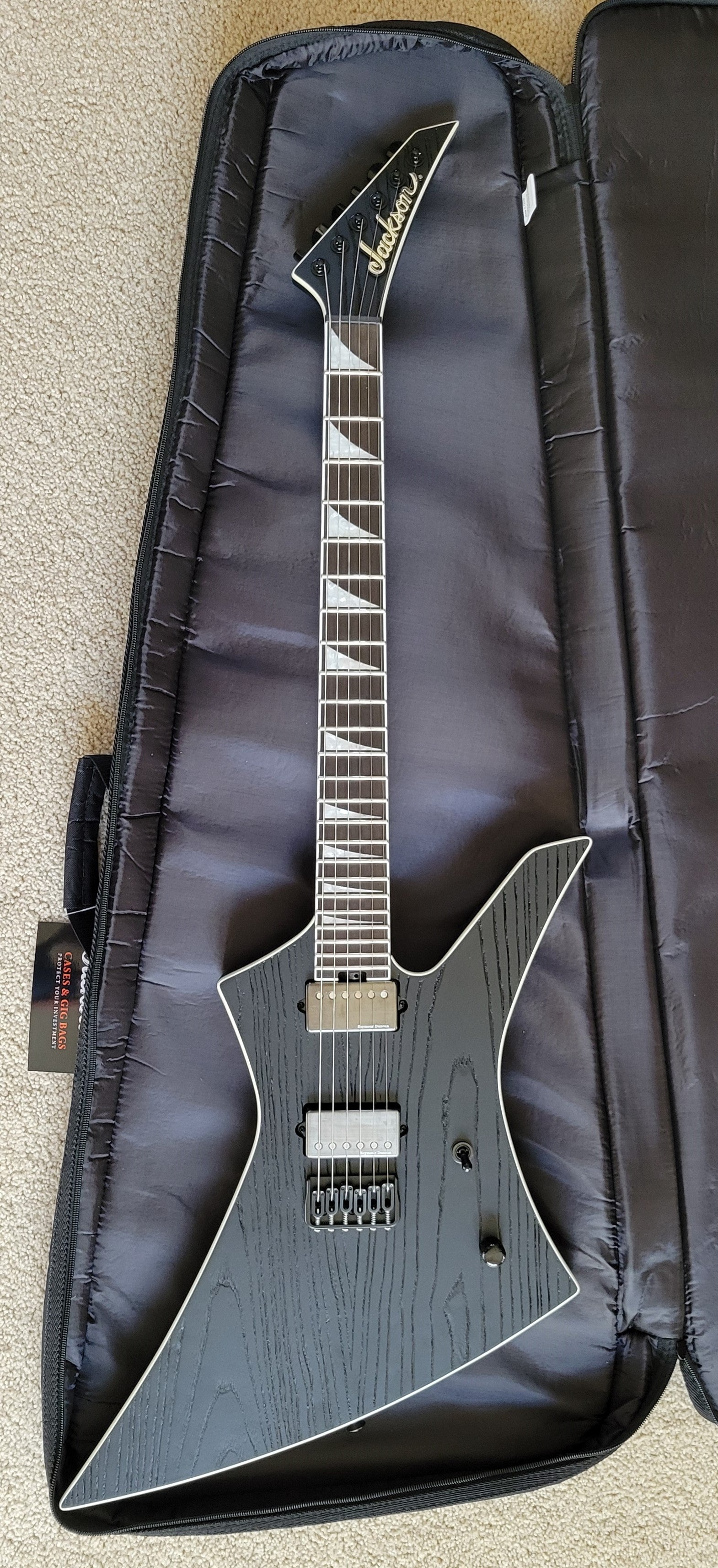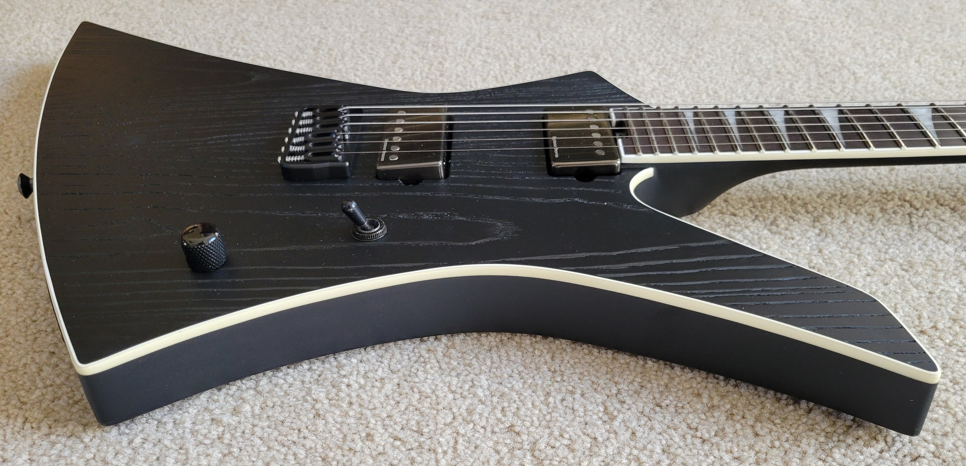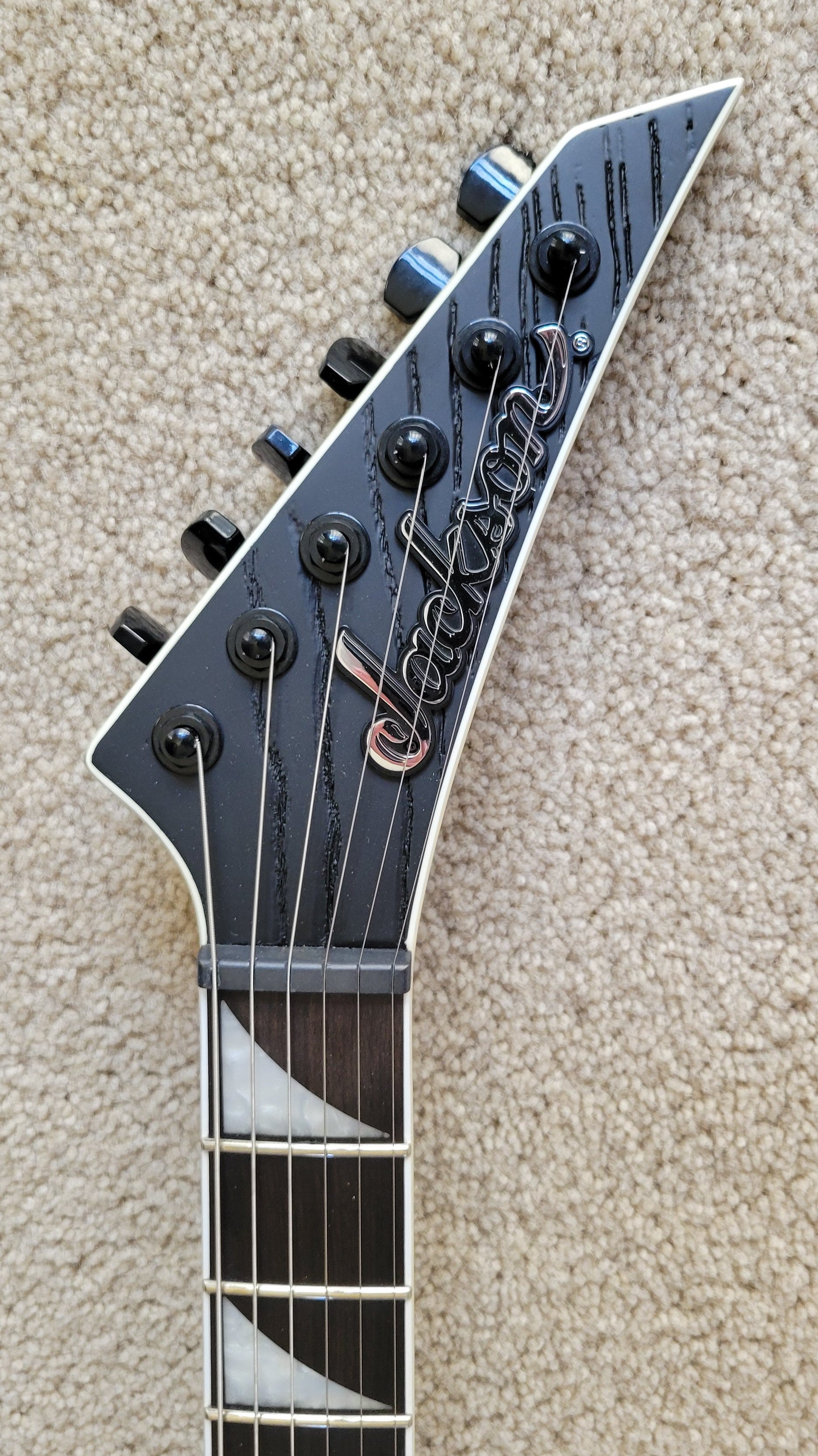 - Available in Black with a Jackson pointed 6-in-line matching headstock, white binding and black hardware
