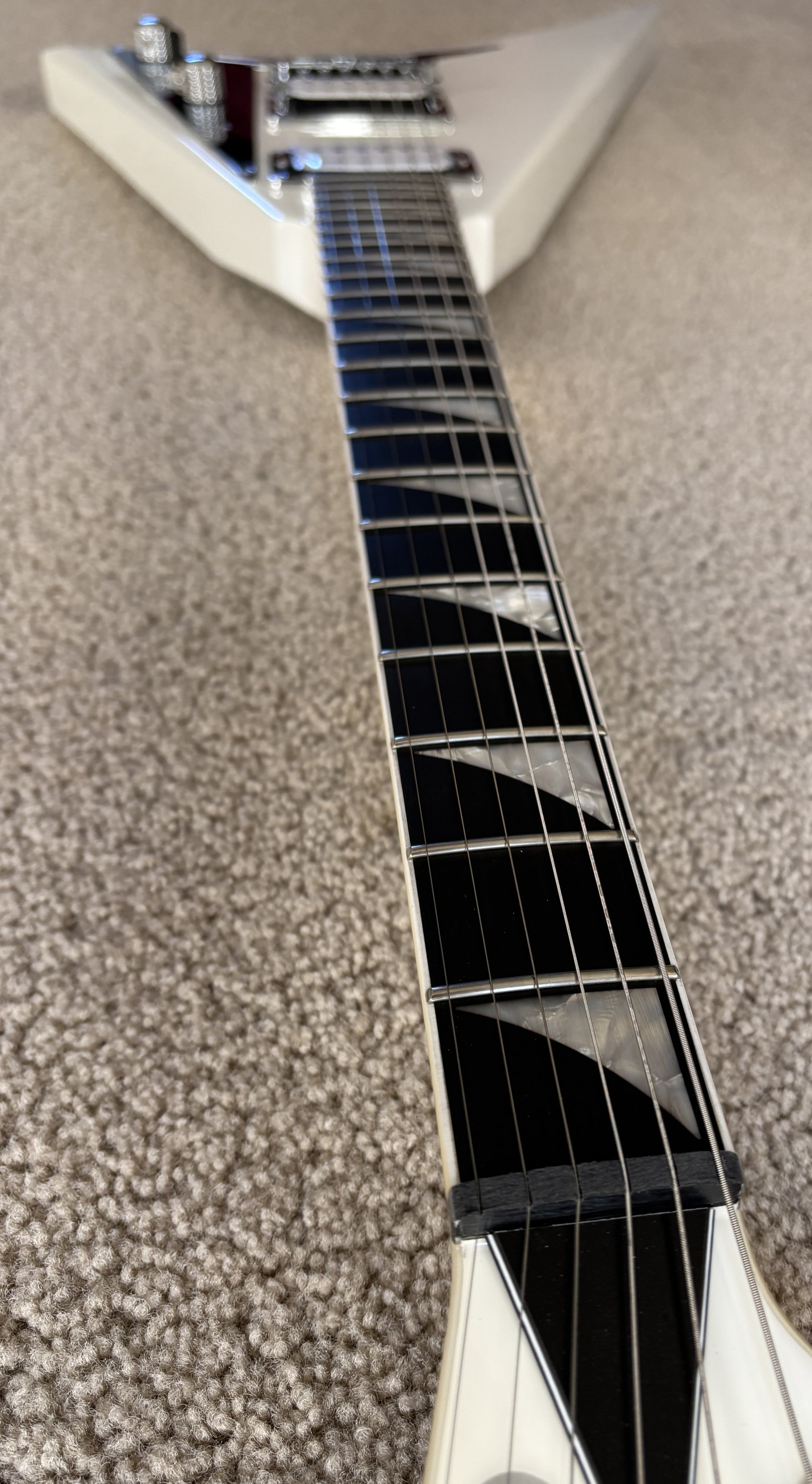 The MJ Series Rhoads RRT boasts classic metal style in a Snow White finish with white pointy headstock, chrome pickguard and chrome hardware.