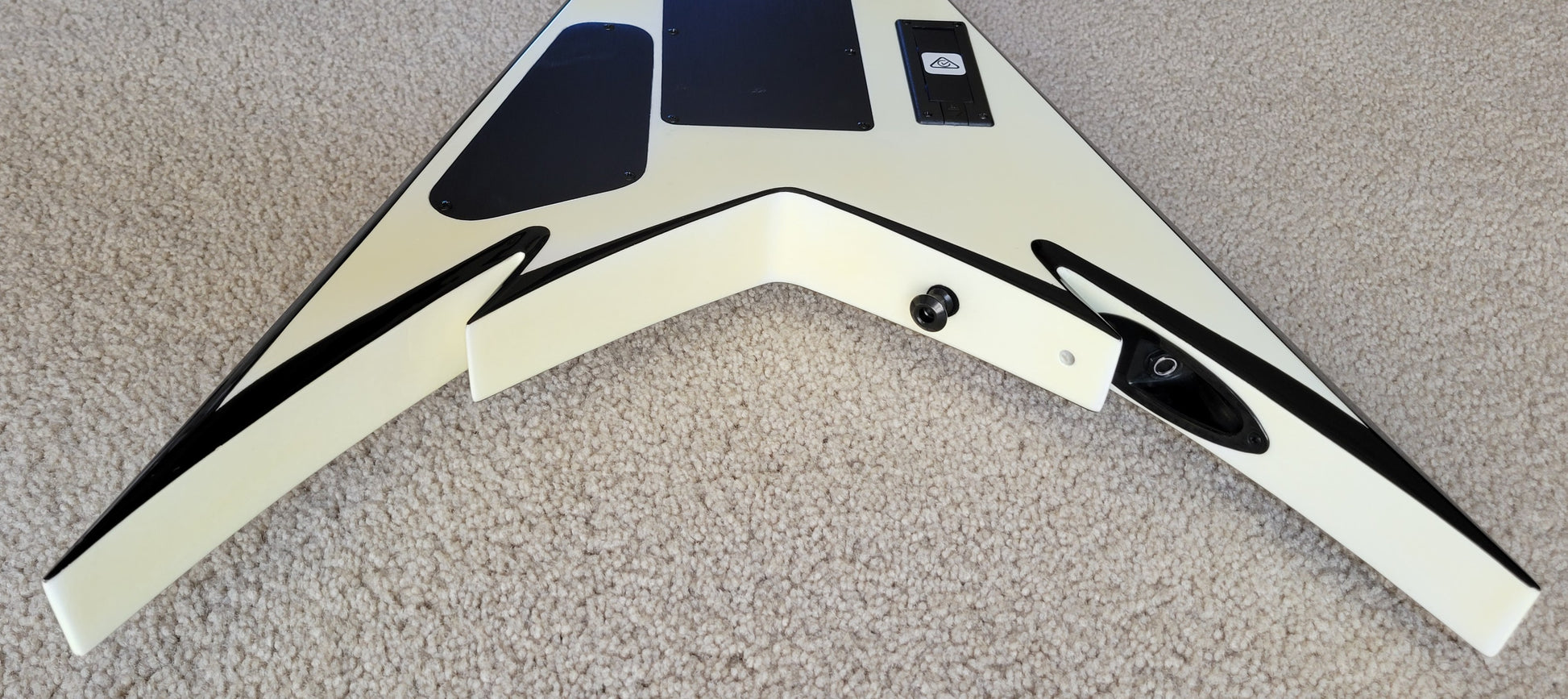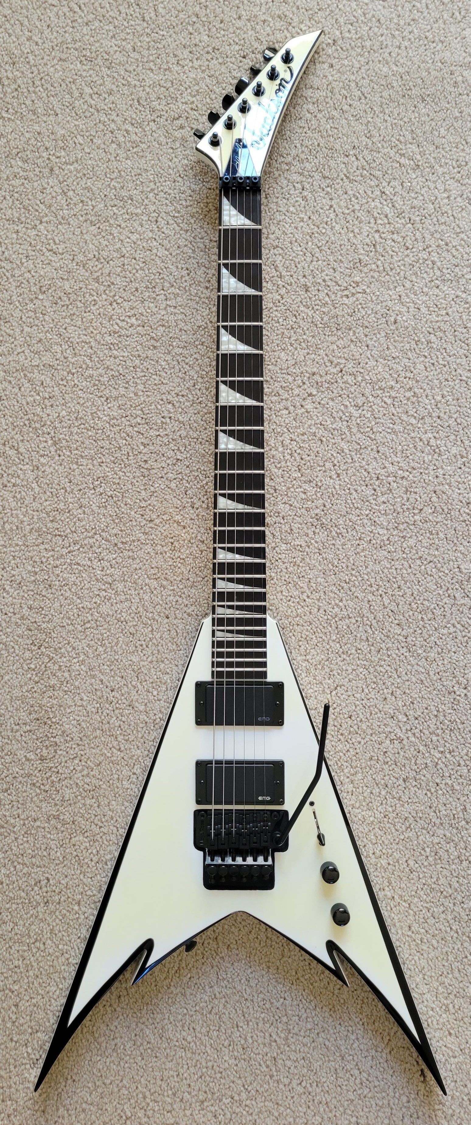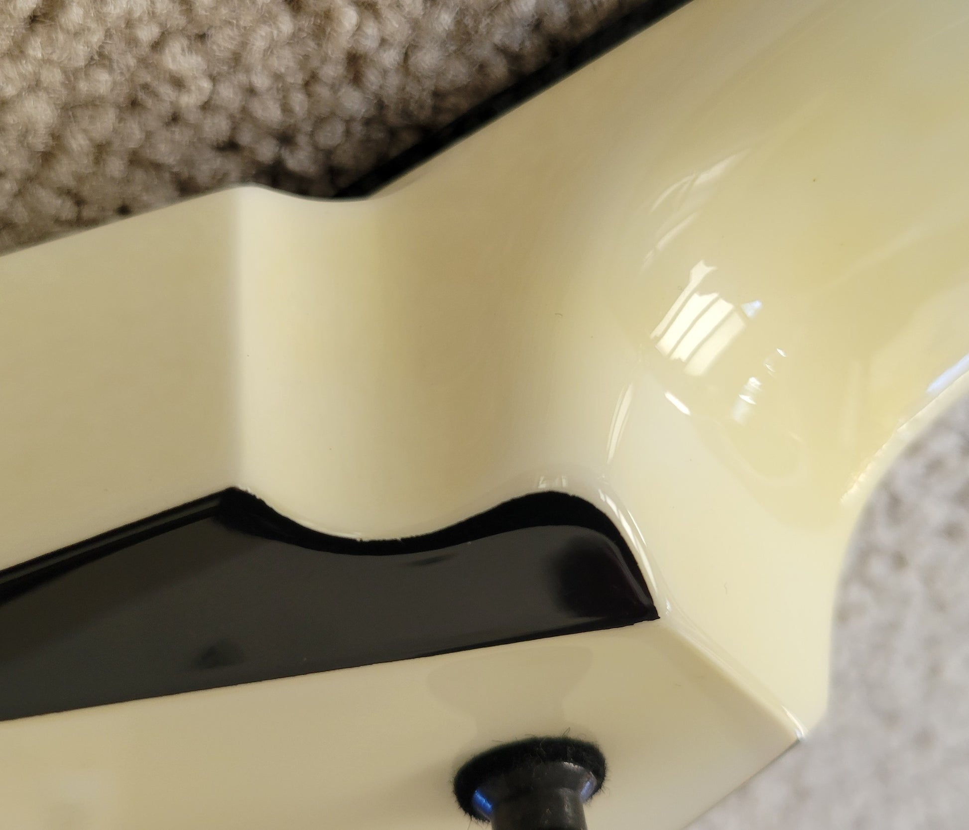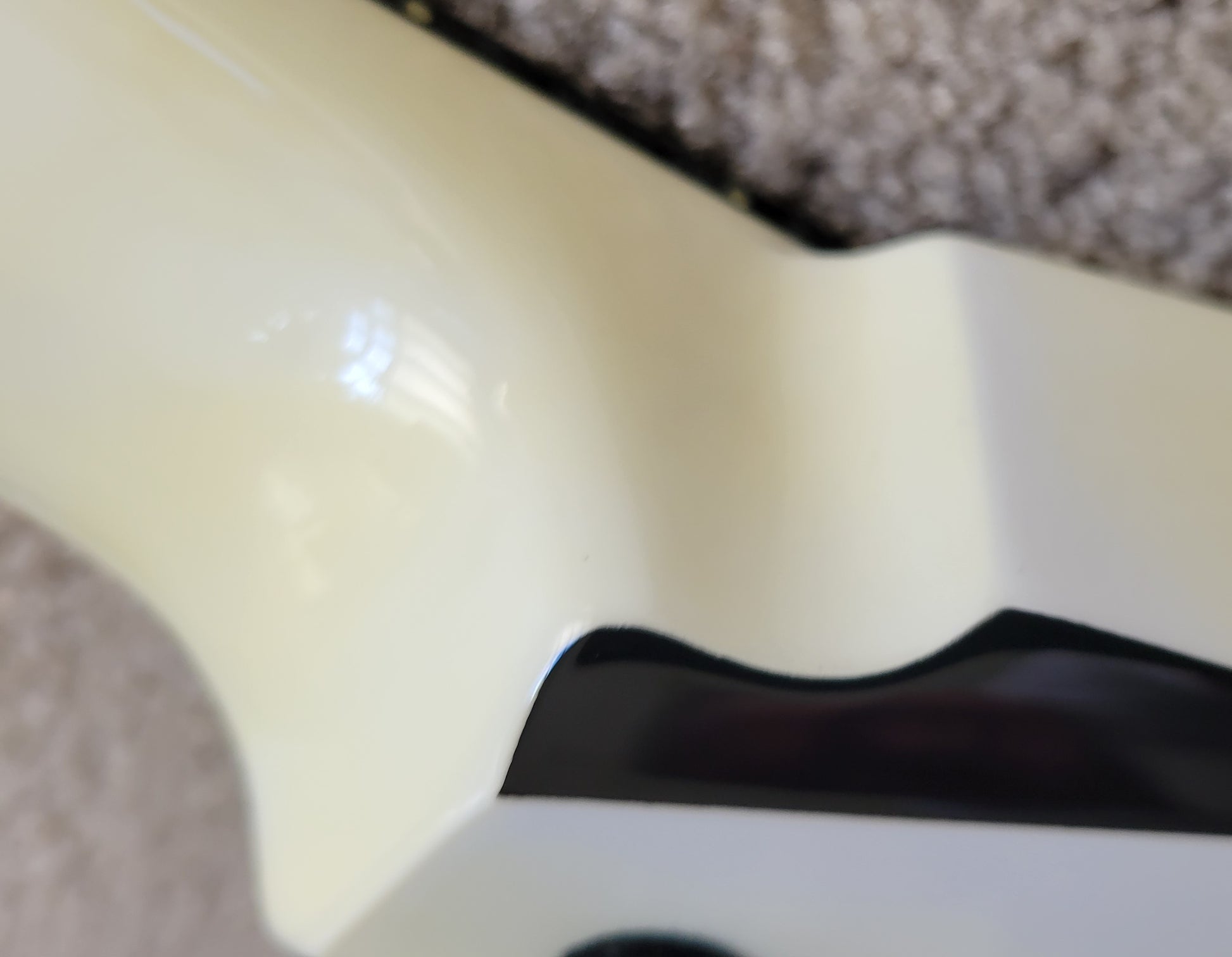 This EXCELLENT guitar went from Jackson to their authorized refurbisher MIRC, where it received a full multi-point inspection and expert setup - it is ready to play! I notice this guitar has a tiny ding on the rear bezel - see the close-up photo. Also, the paint color has a creamy tone variation instead of the pure white indicated by the model number. No other visible repairs were necessary, and no modifications were made except the back of the headstock was gently stamped USED, and the original serial number was replaced/covered with a new one.