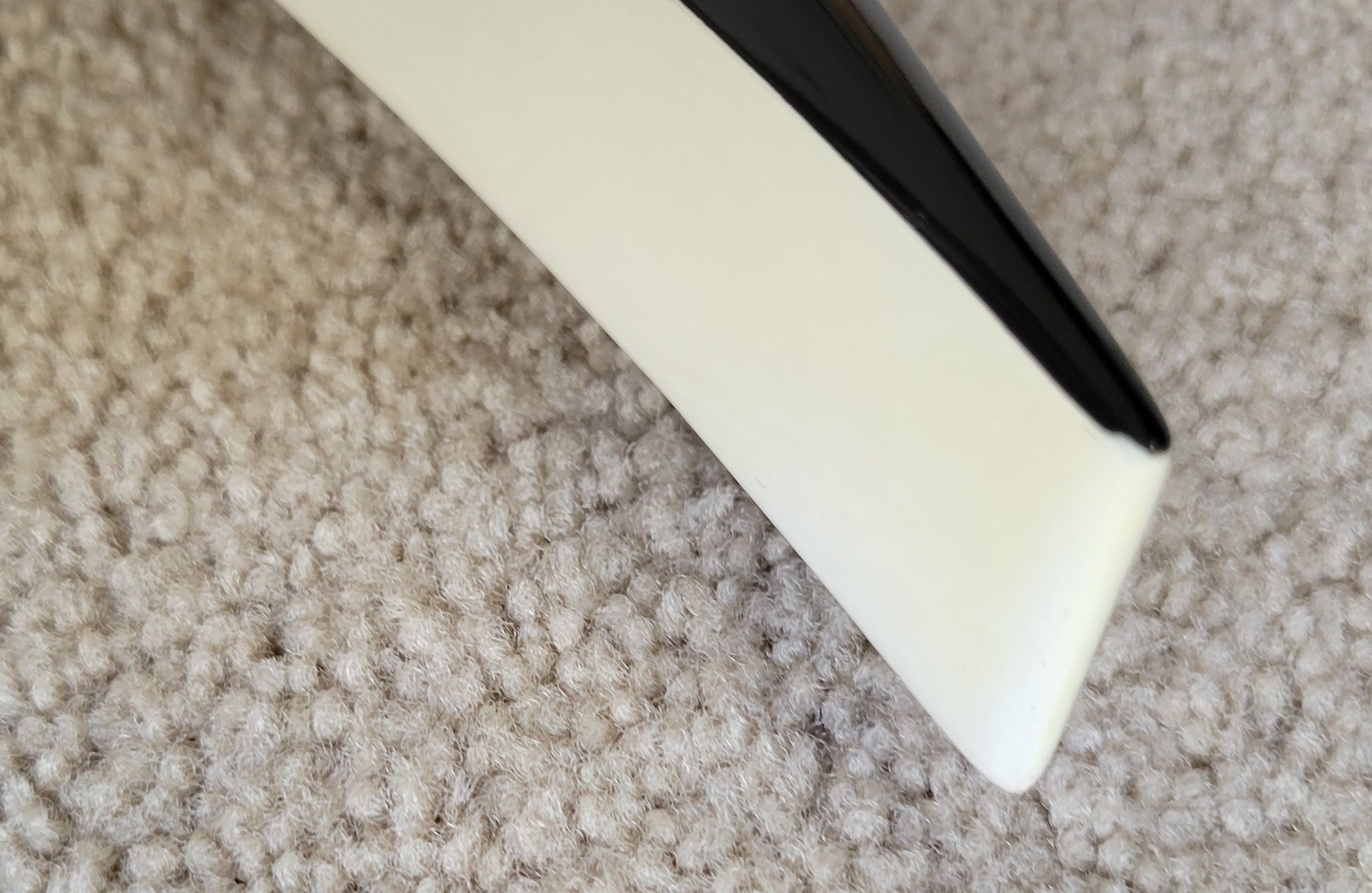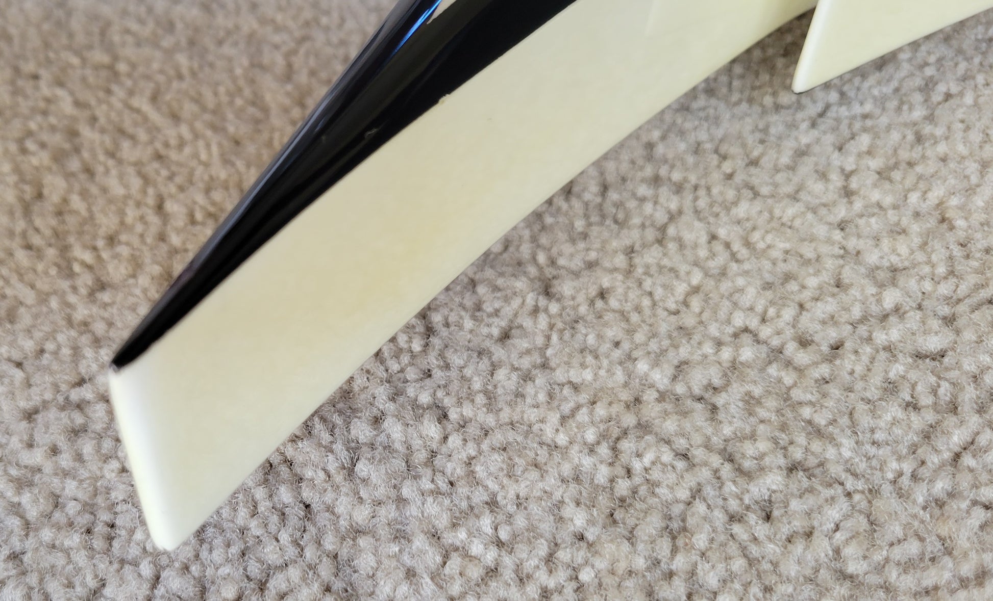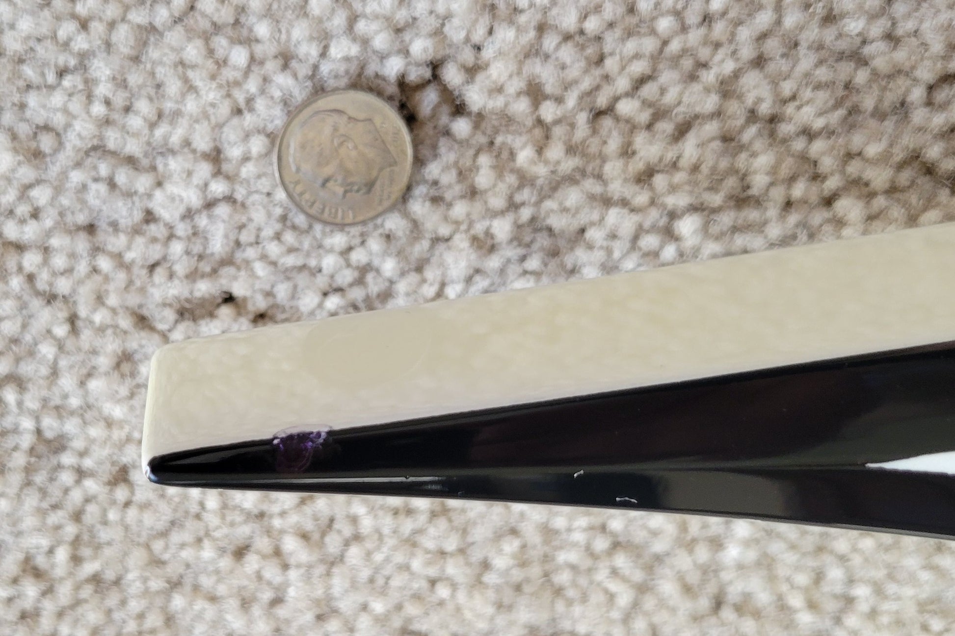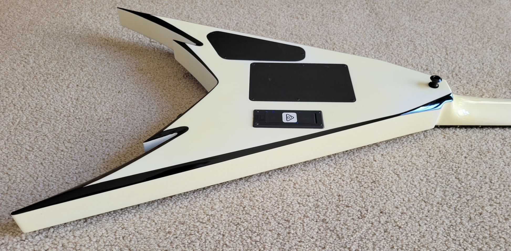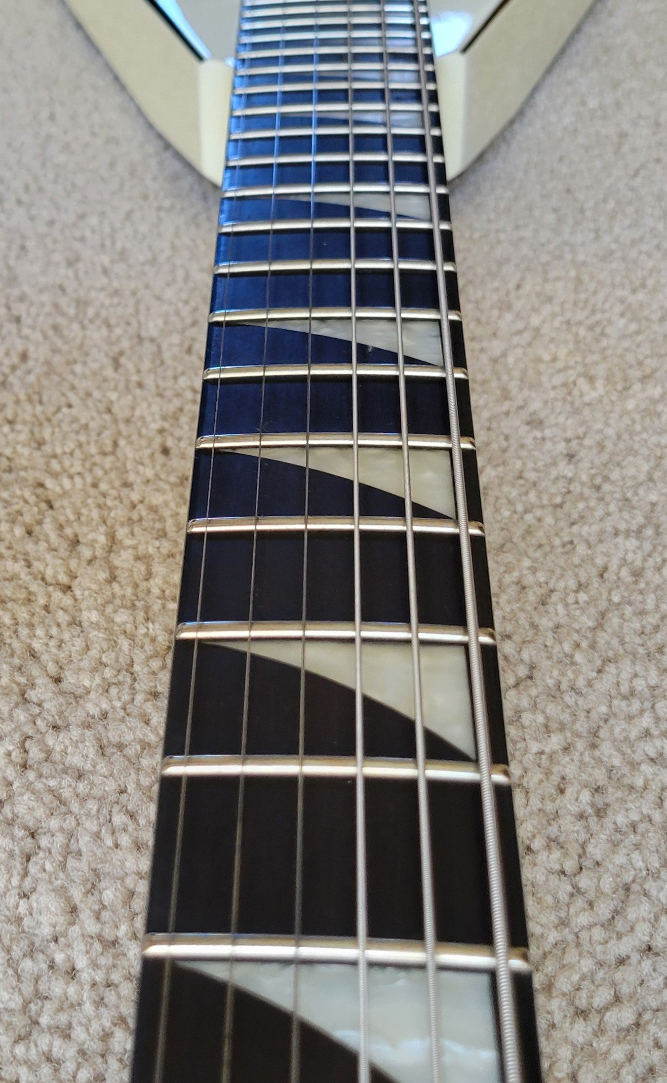 This EXCELLENT guitar went from Jackson to their authorized refurbisher MIRC, where it received a full multi-point inspection and expert setup - it is ready to play! I notice this guitar has a tiny ding on the rear bezel - see the close-up photo. Also, the paint color has a creamy tone variation instead of the pure white indicated by the model number. No other visible repairs were necessary, and no modifications were made except the back of the headstock was gently stamped USED, and the original serial number was replaced/covered with a new one.