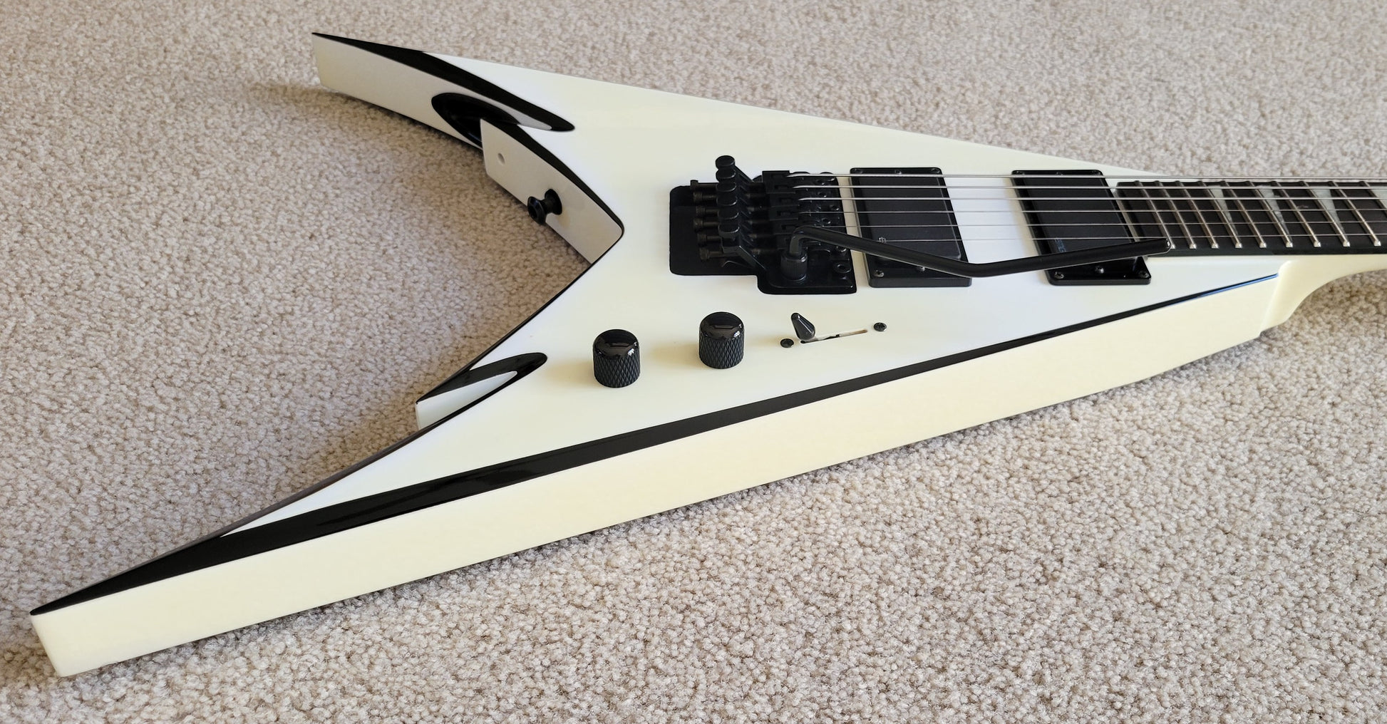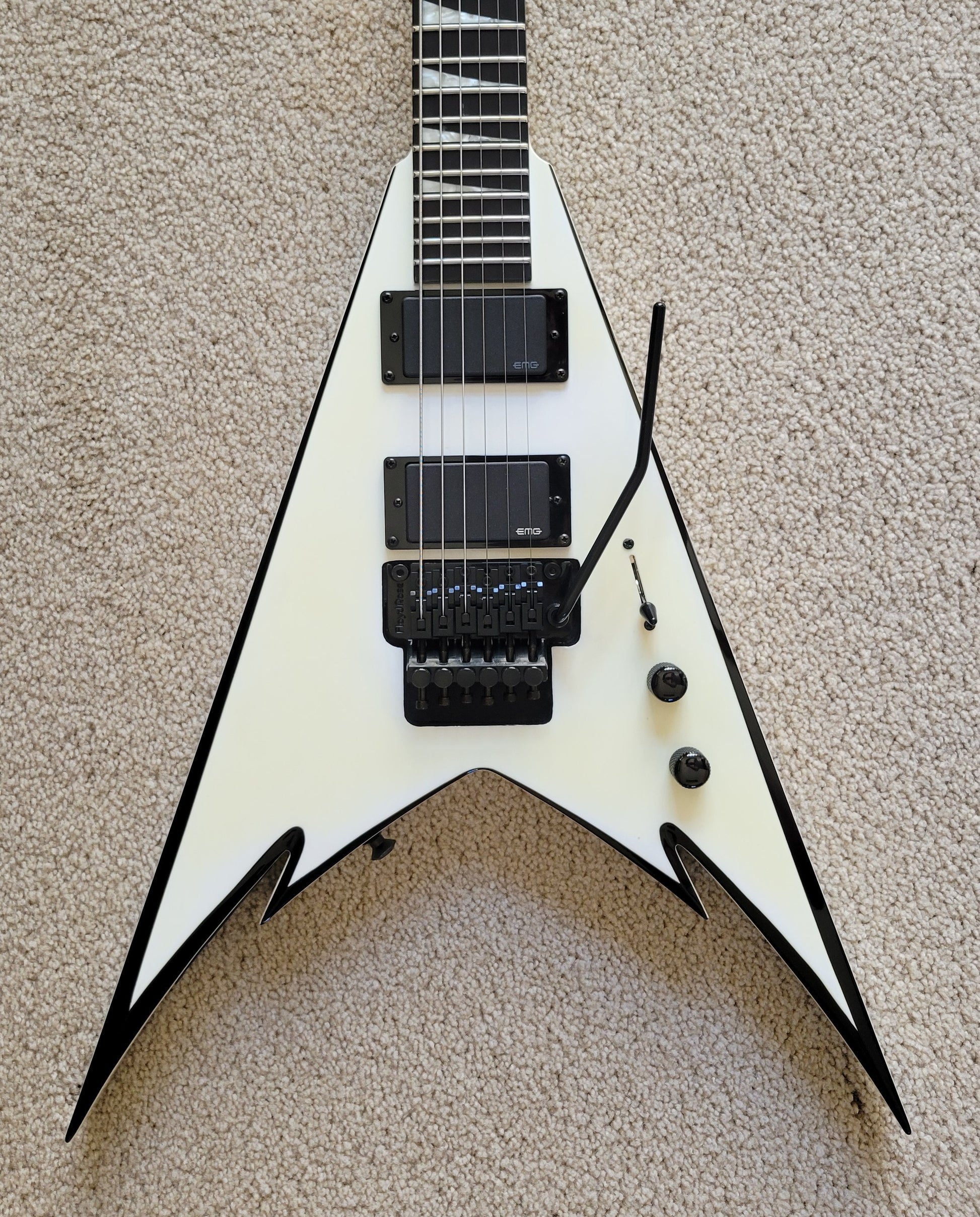 Jackson's Demmelition Pro model puts Machine Head guitarist Phil Demmel's devastating style and double-cut King V specs right in your hands, Features include a three-piece through-body maple neck with graphite reinforcement, compound-radius (12"-16") bound ebony fingerboard with 24 jumbo frets and pearloid piranha inlay at 12th fret, EMG 60 (neck) and 81 (bridge) humbucking pickups with three-way toggle switching, Floyd Rose locking nut and recessed double-locking tremolo, and black hardware.