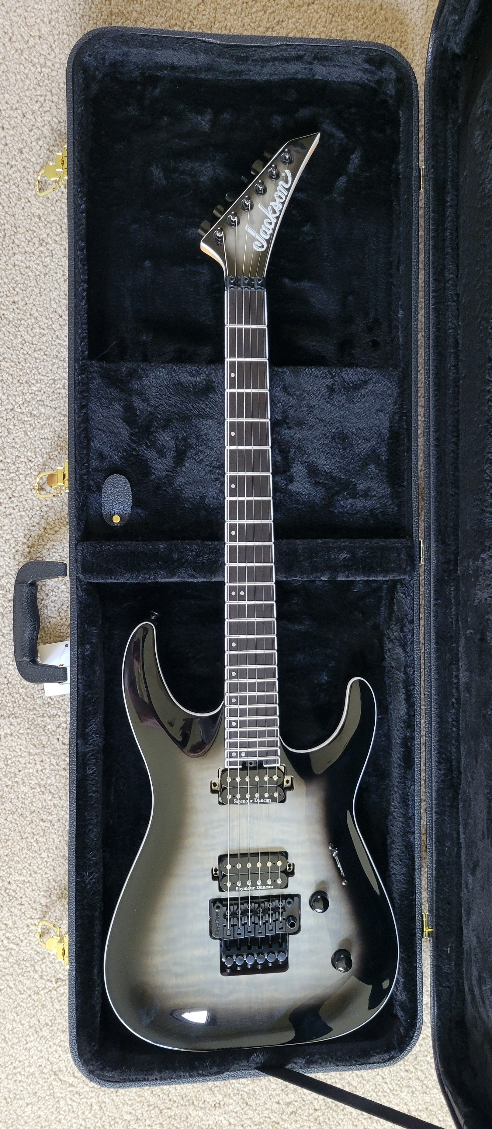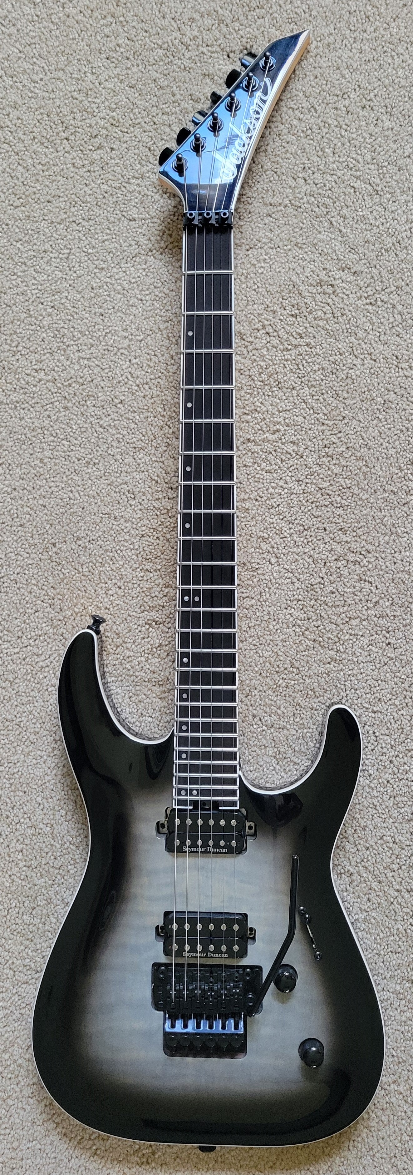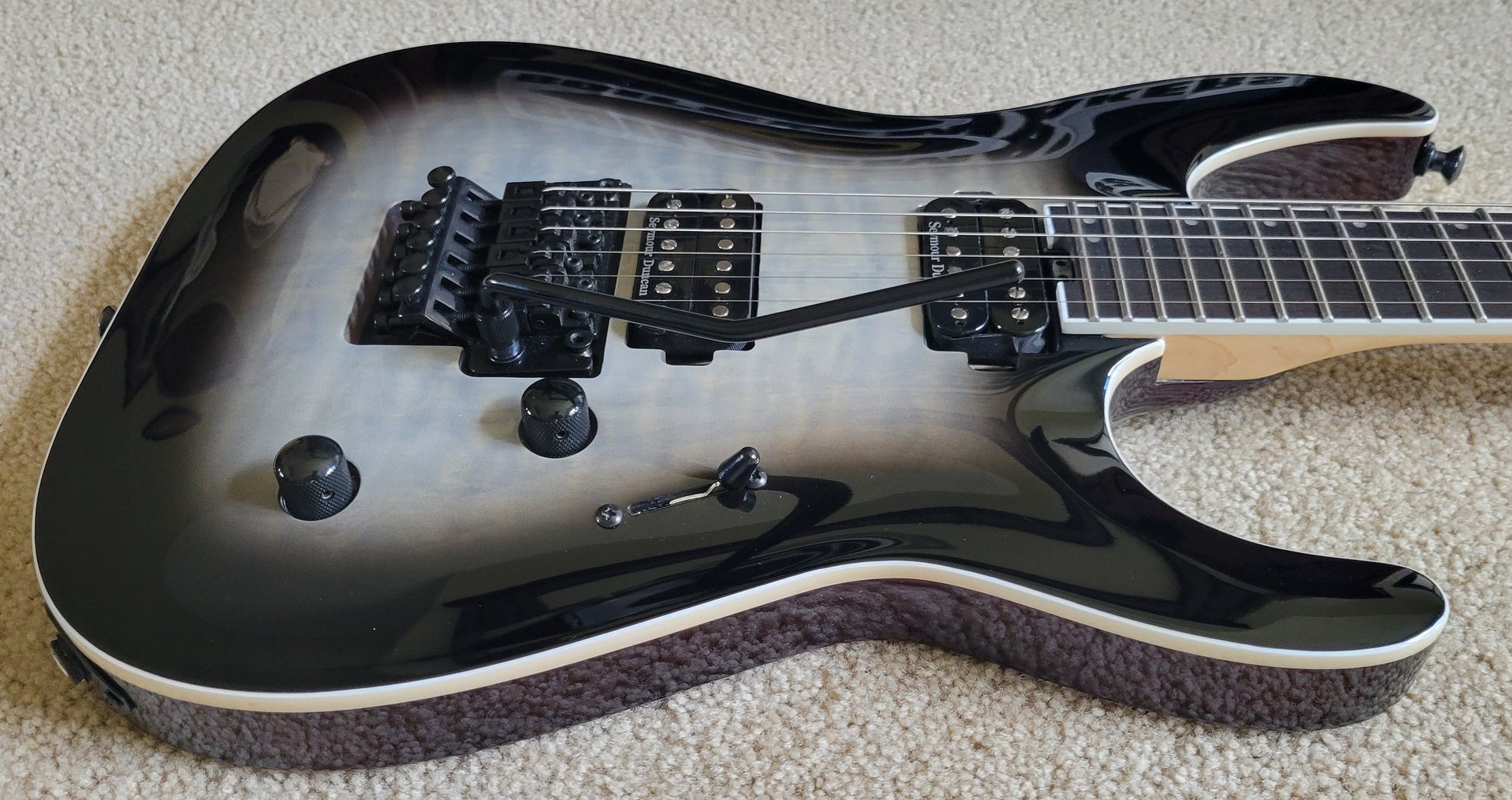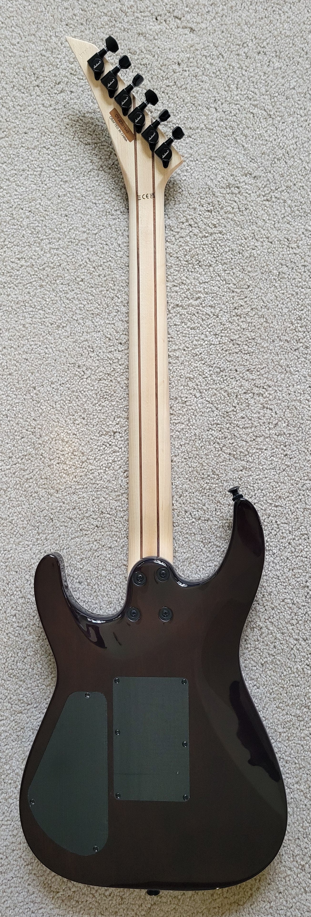 Boasting Jackson's distinctive style, the Pro Plus DKAQ is available in a variety of finishes with matching pointed 6-in-line headstock and all-black hardware, including sealed die-cast tuners and Jackson locking strap buttons.