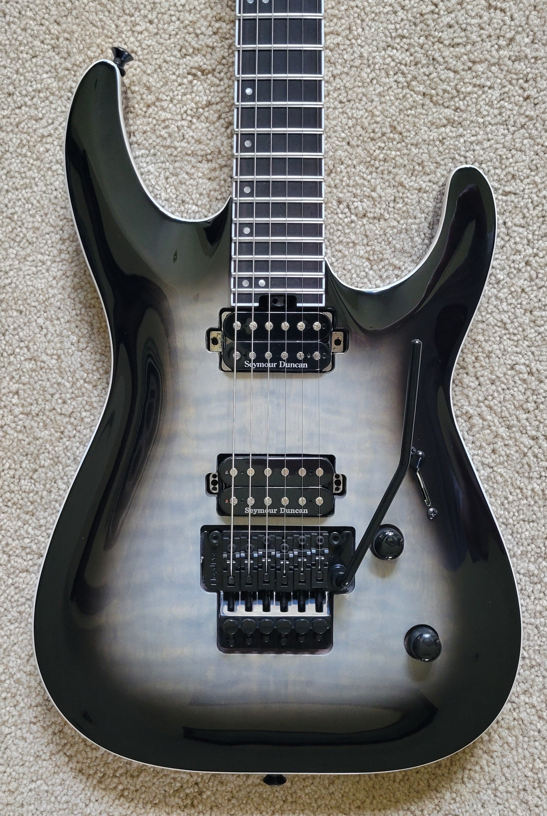 A pair of direct mount brawny Seymour Duncan humbucking pickups - JB (bridge) and '59 (neck) - power this axe, delivering powerful punch while retaining clarity with enhanced note definition, a critical component for modern metal. This instrument is also equipped with single volume and tone controls plus five-way blade switching to tweak and refine tone, and a recessed Floyd Rose 1000 Series double-locking tremolo bridge system for improved tuning stability. Luminlay side dots will guide your way along the fretboard even on the darkest of stages.