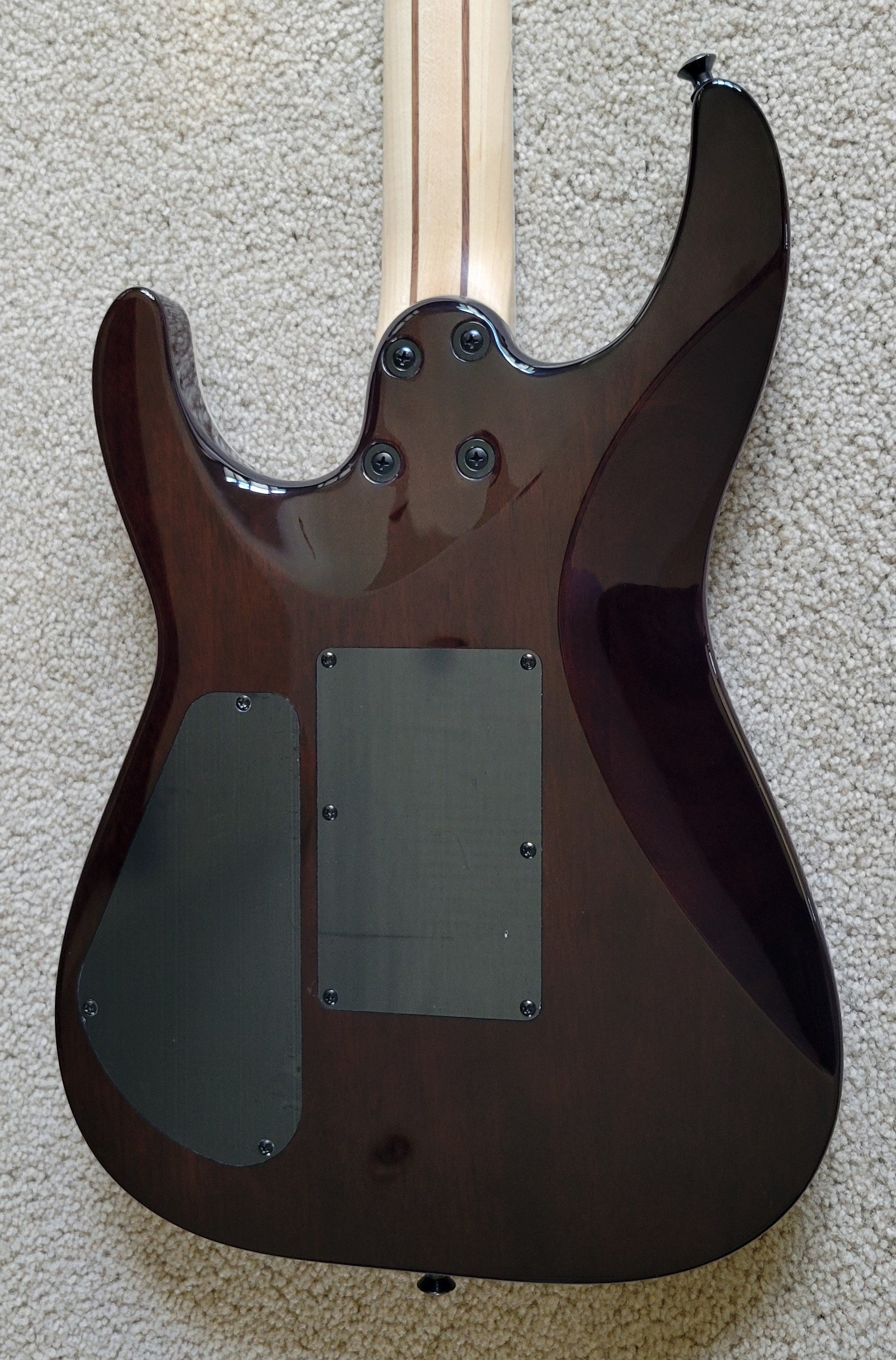 A modern metal machine, the Pro Plus DKAQ features a single ply bound okoume arched top body, draped in a gorgeous quilt maple top and a sturdy graphite-reinforced five-piece maple/walnut bolt-on neck with a sculpted shredder's cut heel for easier access to the upper frets. A hand-rubbed oil finish on the back of the neck provides great playing comfort, while a heel-mount truss rod adjustment wheel allows for quick and convenient neck relief tweaks. Featuring 24 jumbo stainless-steel frets and offset pearloid dot inlays, the 12"-16" compound radius ebony fingerboard is the ideal platform for heavy chording and fast, ripping solos.