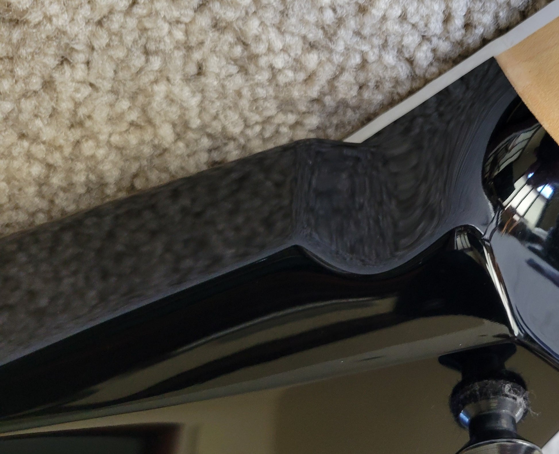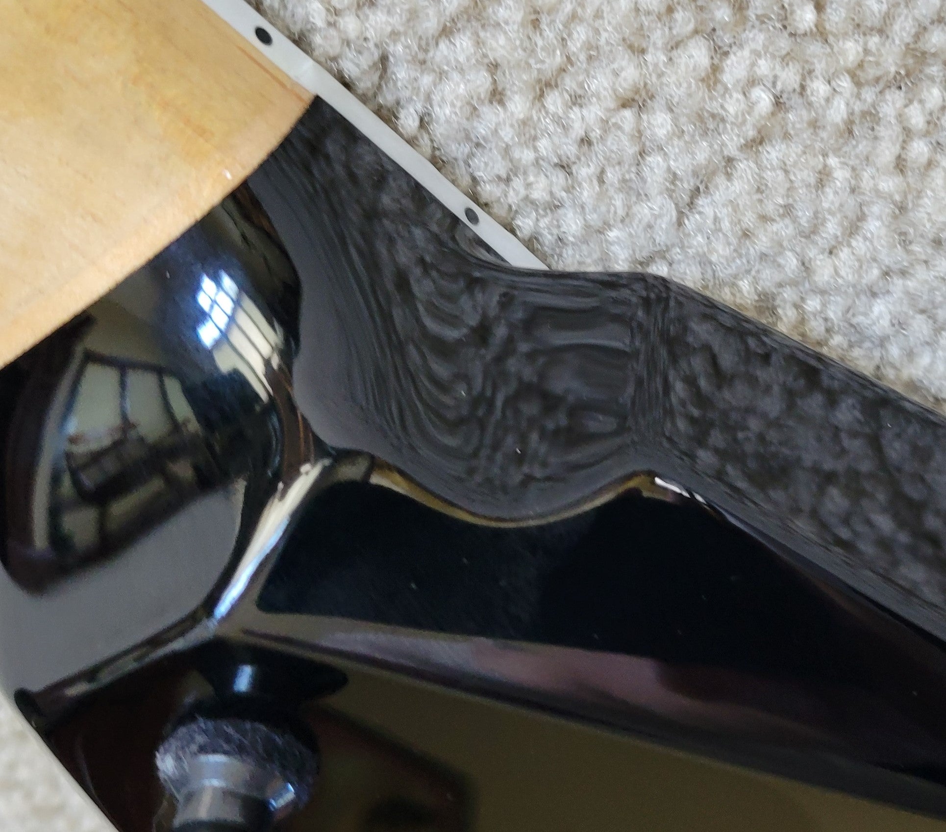 - Single-ply black neck and headstock binding on Ferrari Red model; single-ply white neck and headstock binding on Deep Black model