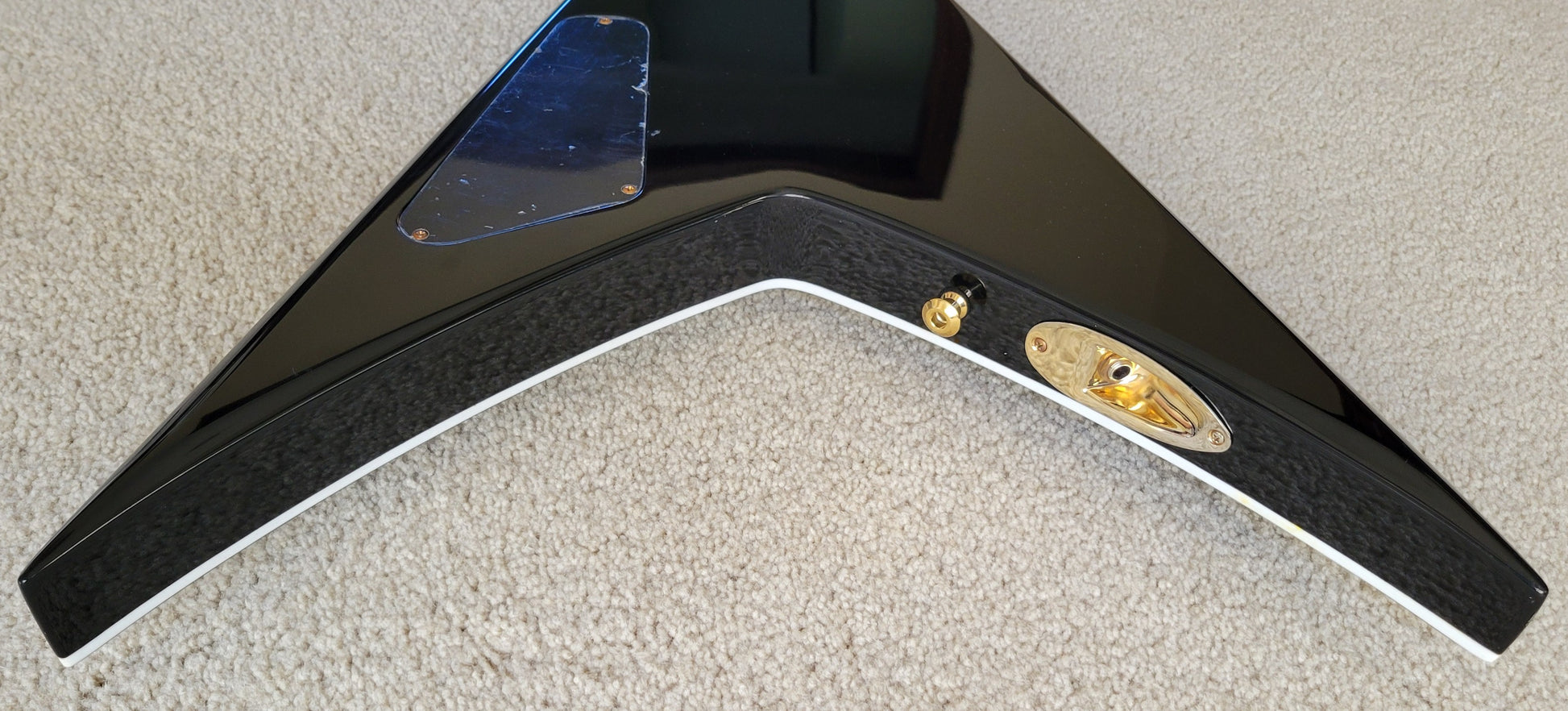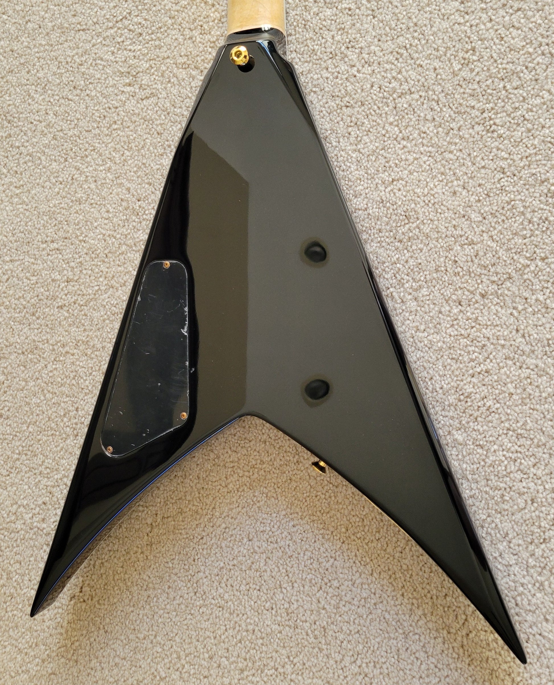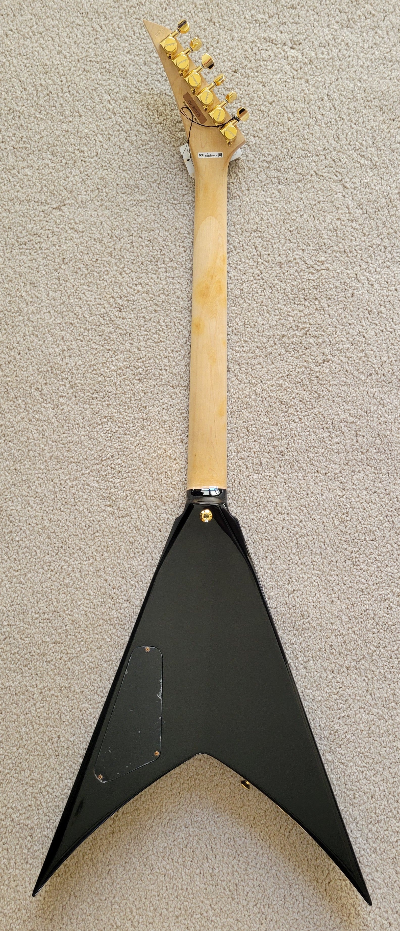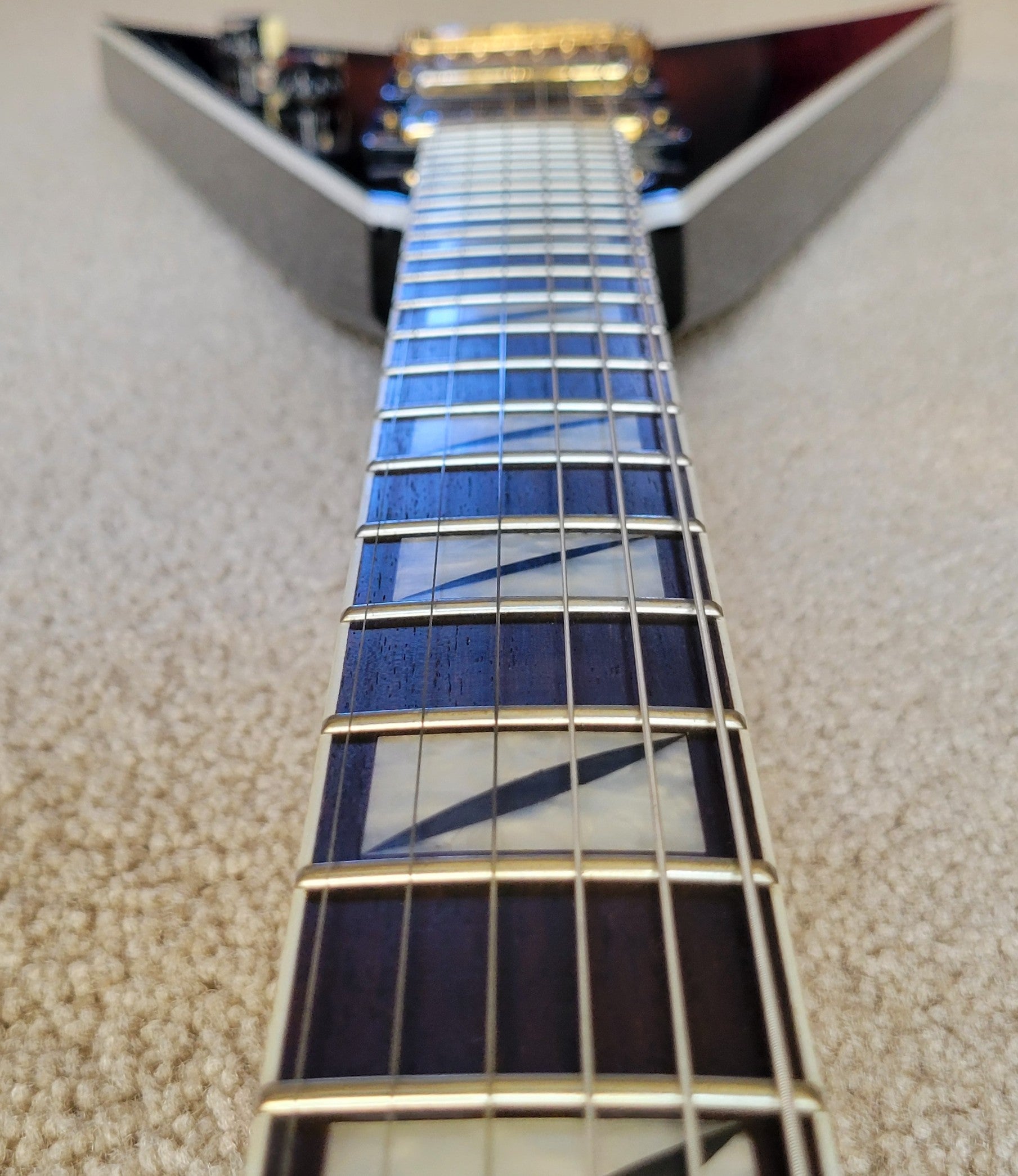 The Pro King V KVT offers premium features including a mahogany body, graphite-reinforced one-piece through-body maple neck with hand-rubbed oil finish and wrap-around heel, 12”-16” compound radius ebony fingerboard with 24 jumbo frets, shark eye block inlays and single-ply white binding around the body, neck and Jackson pointed 6-in-line headstock.