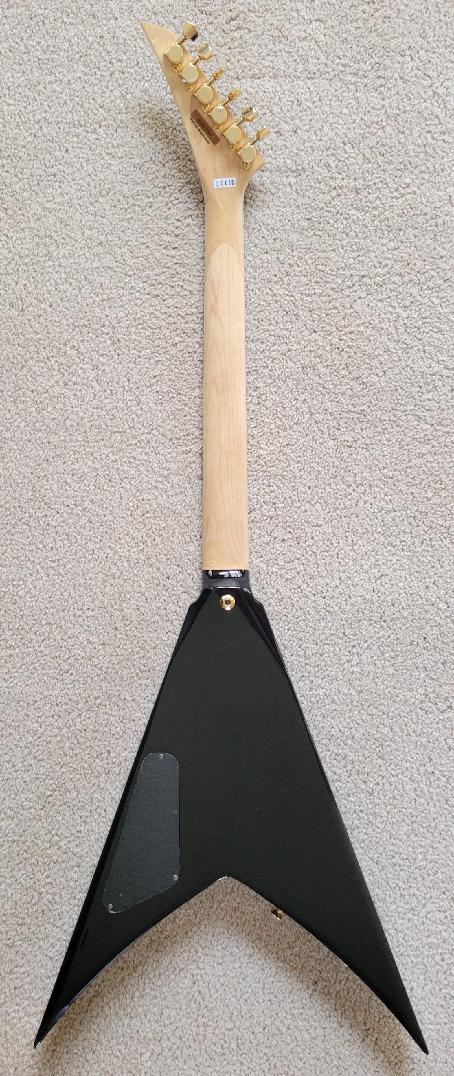 The Pro King V KVT offers premium features including a mahogany body, graphite-reinforced one-piece through-body maple neck with hand-rubbed oil finish and wrap-around heel, 12”-16” compound radius ebony fingerboard with 24 jumbo frets, shark eye block inlays and single-ply white binding around the body, neck and Jackson pointed 6-in-line headstock.