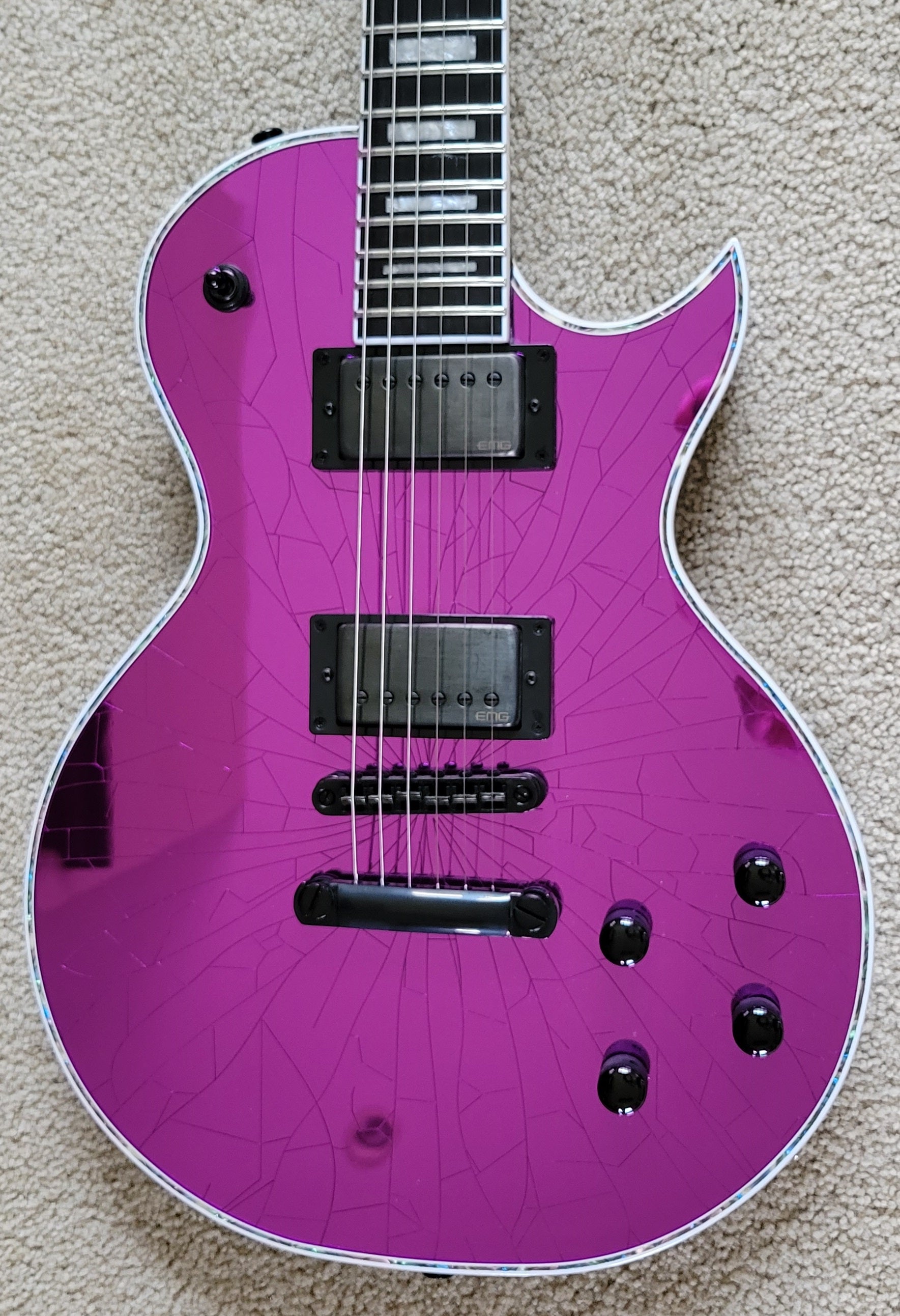 Never fear being upstaged with the all-new cracked Purple Mirror finish, complete with 3-ply white/abalone/white body binding, all-black hardware and reverse Jackson 3x3 (3 over, 3 under) AT-1 black headstock.