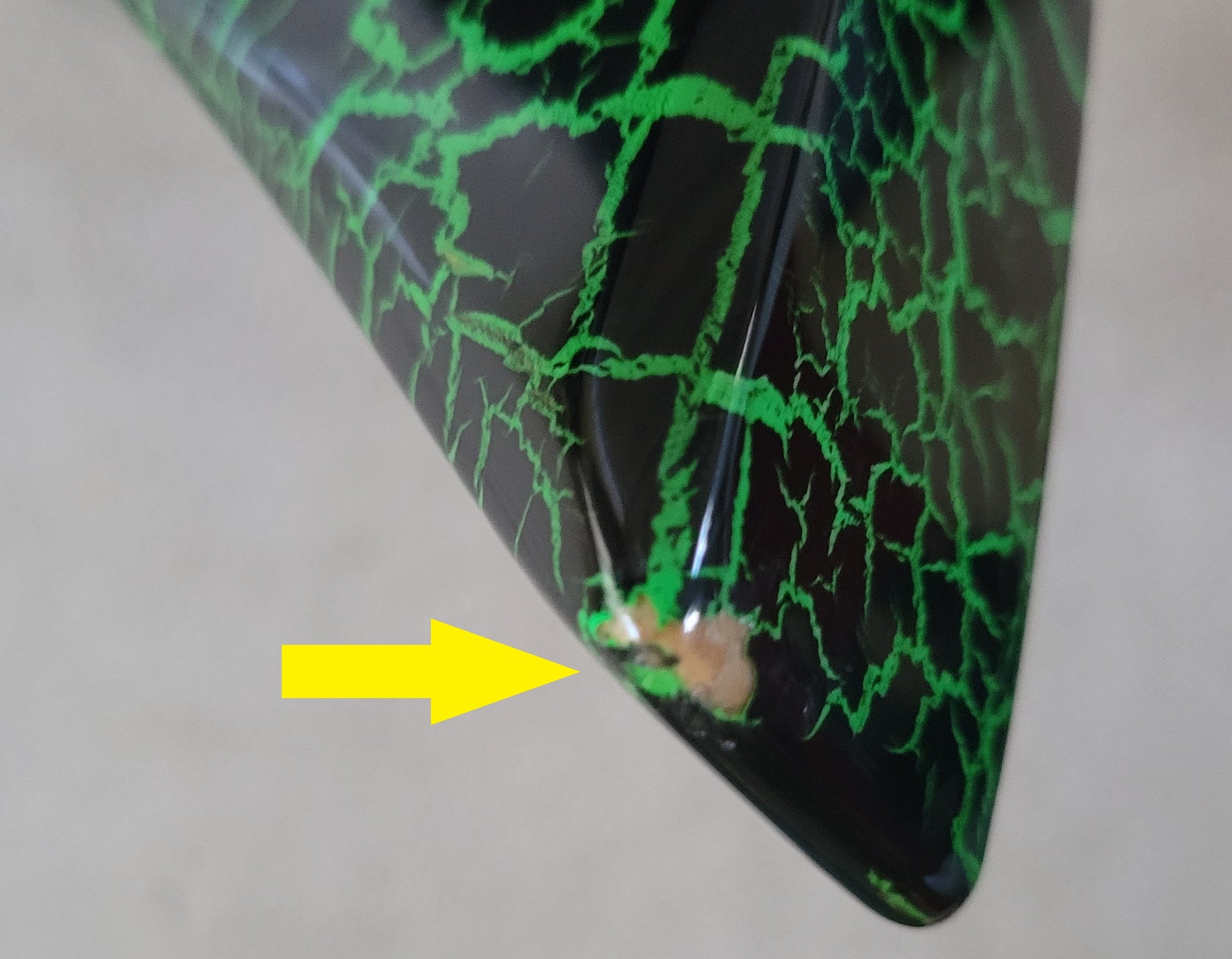This guitar went from the factory to their authorized refurbisher, where it received a full multi-point inspection and expert setup - it is ready to play! This guitar has 2 small areas on the points where the crackle finish is missing and the underlying wood is visible - see the photos. However, these areas have been sealed, clear-coated, and buffed smooth. No other modifications were made except the back of the headstock was stamped USED and the original serial number was replaced with a new one. I acquired this guitar from the refurbisher, and there has been no other owner. This NEAR MINT guitar has not been played except for setup and testing.
