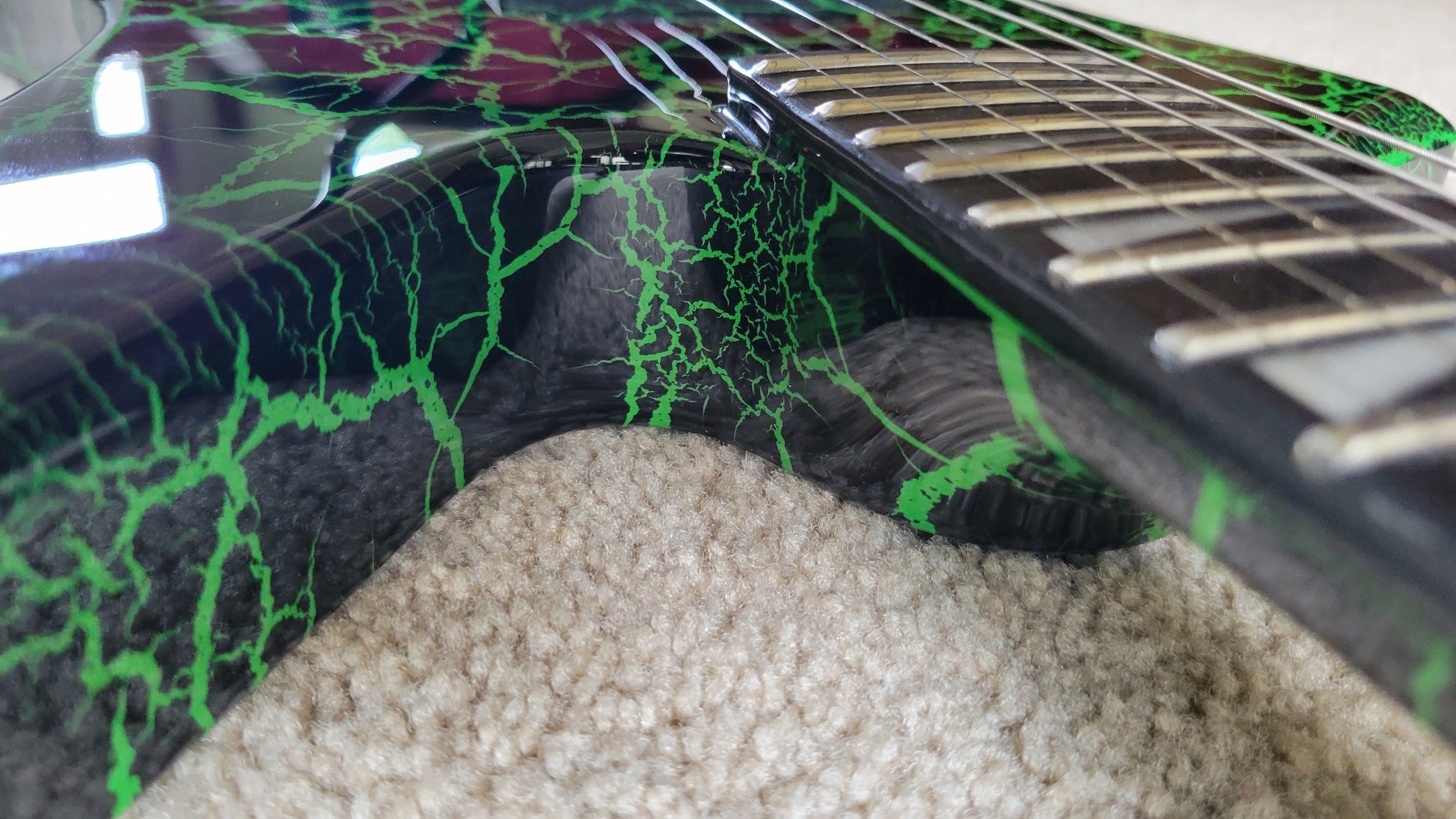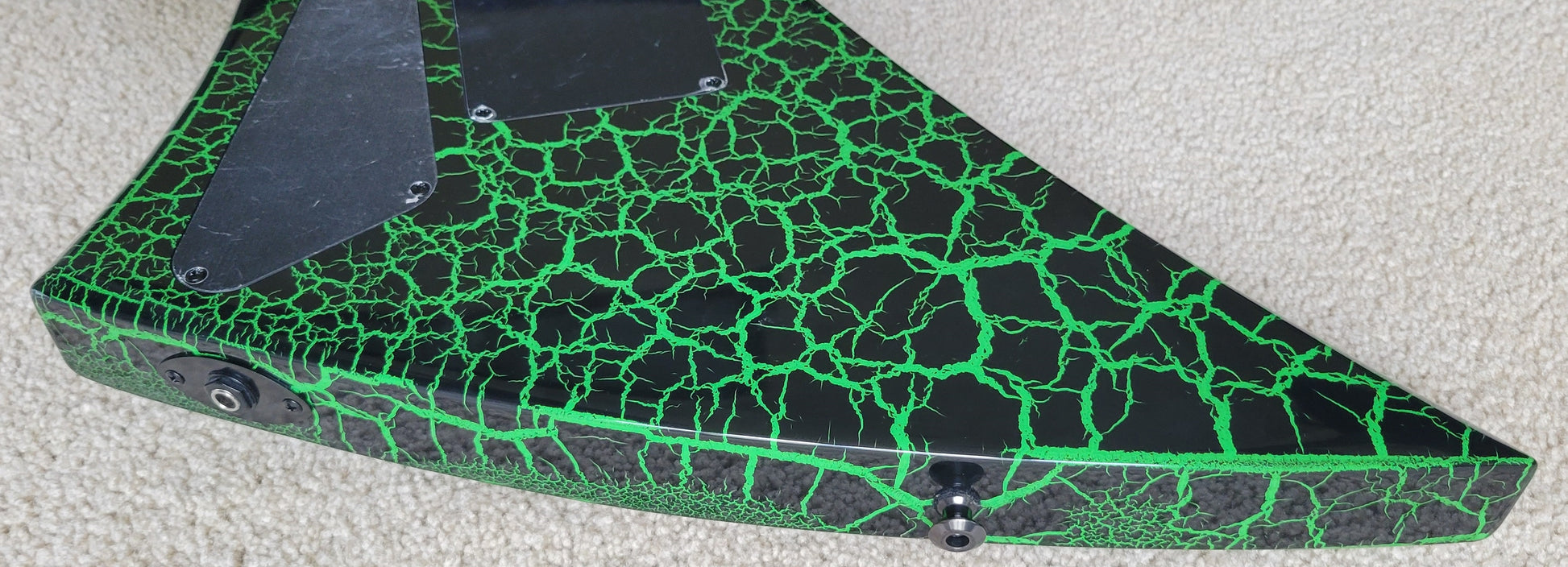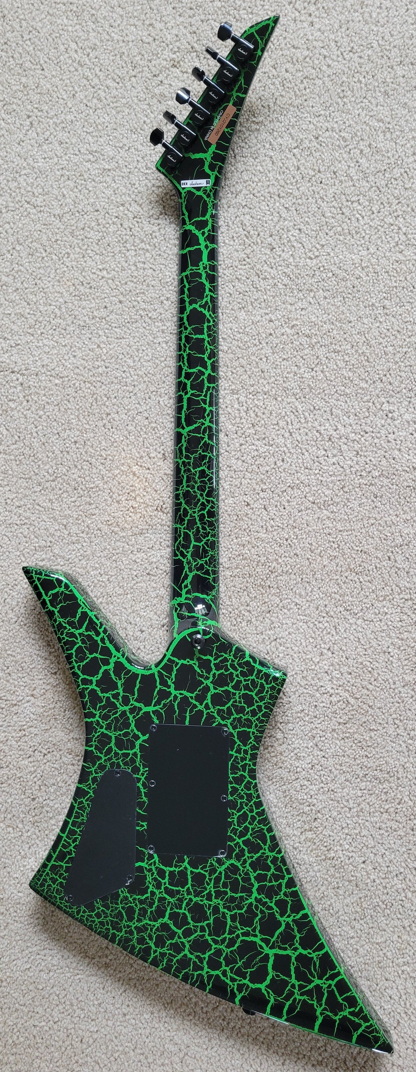 - Available in Green Crackle with reverse Jackson pointed 6-in-line black headstock featuring green Jackson logo and black hardware