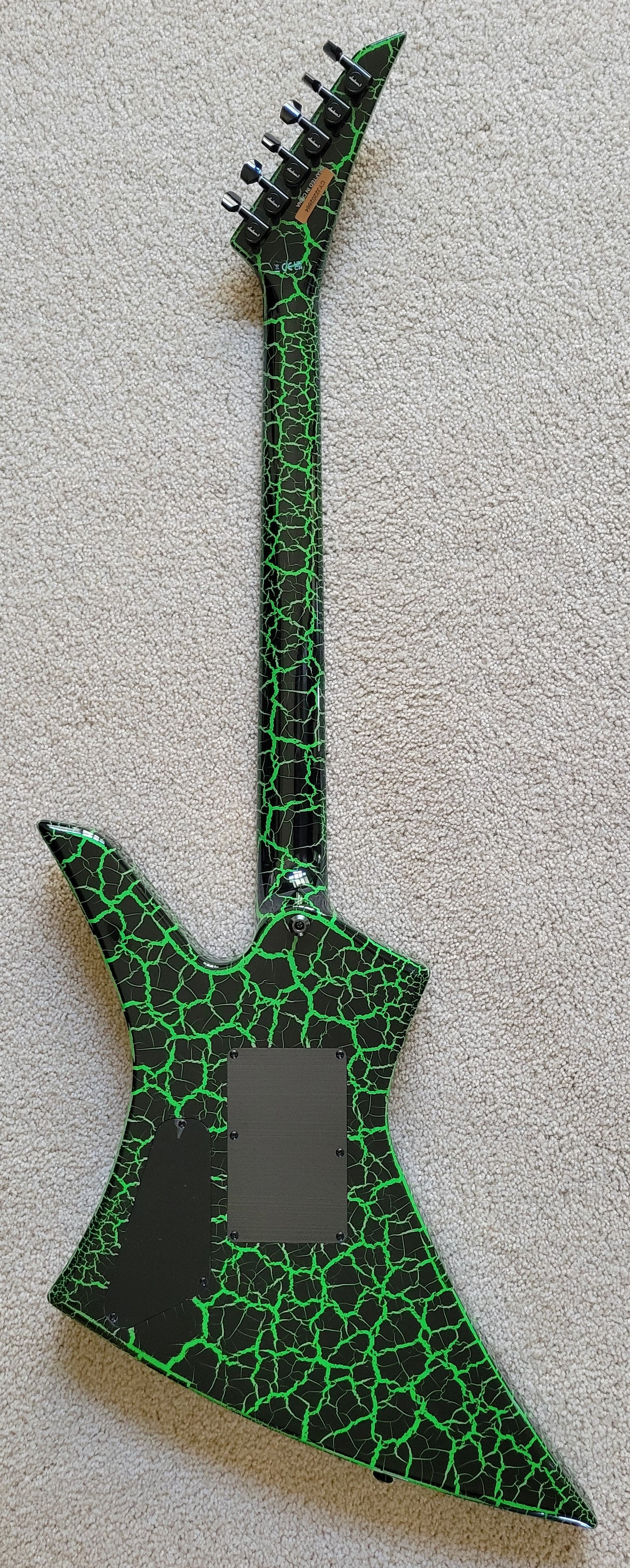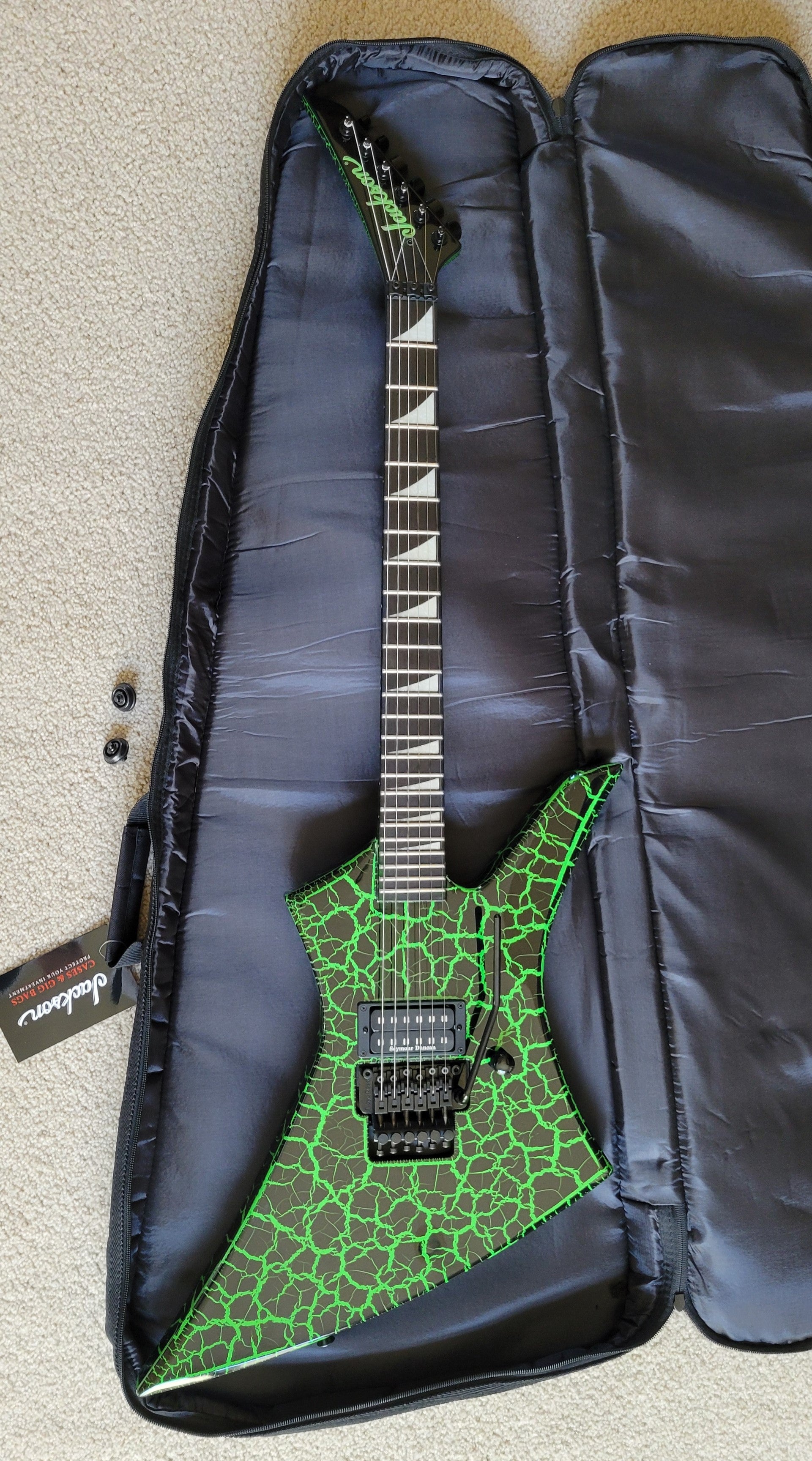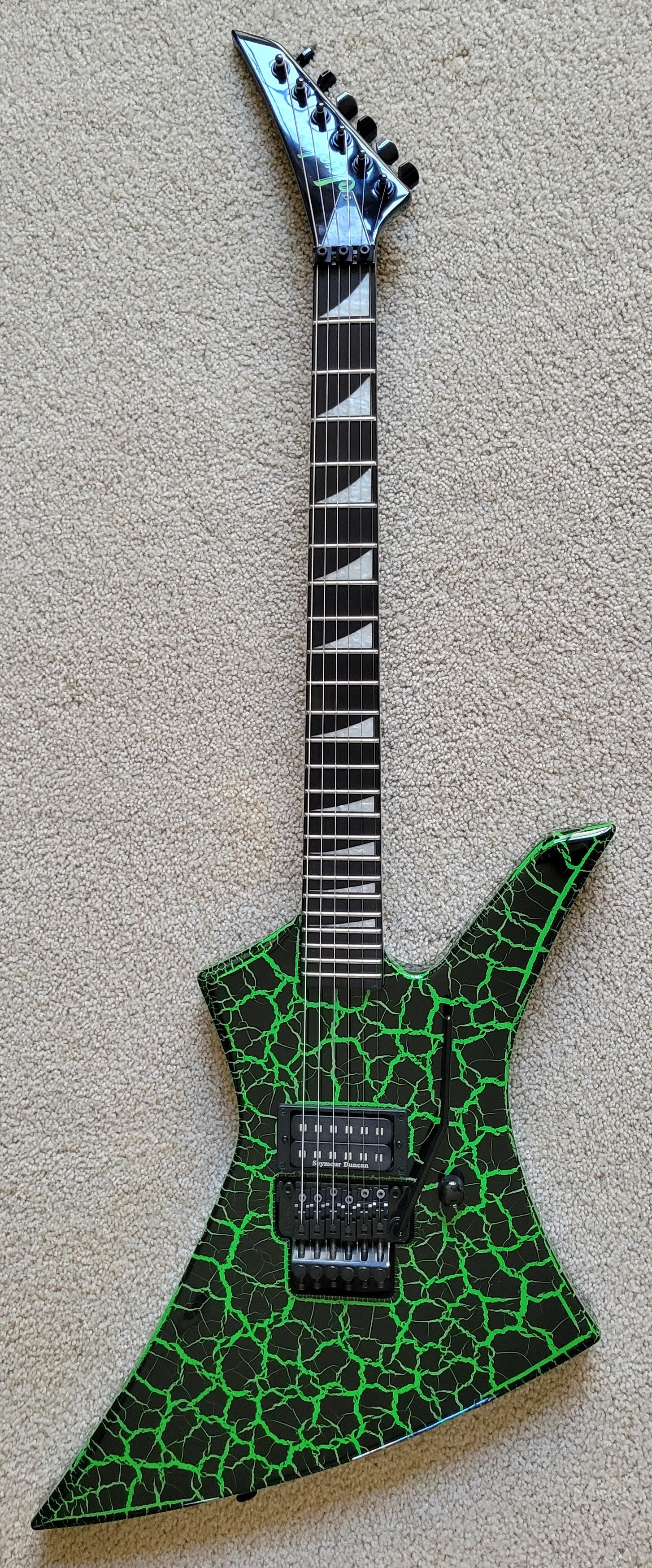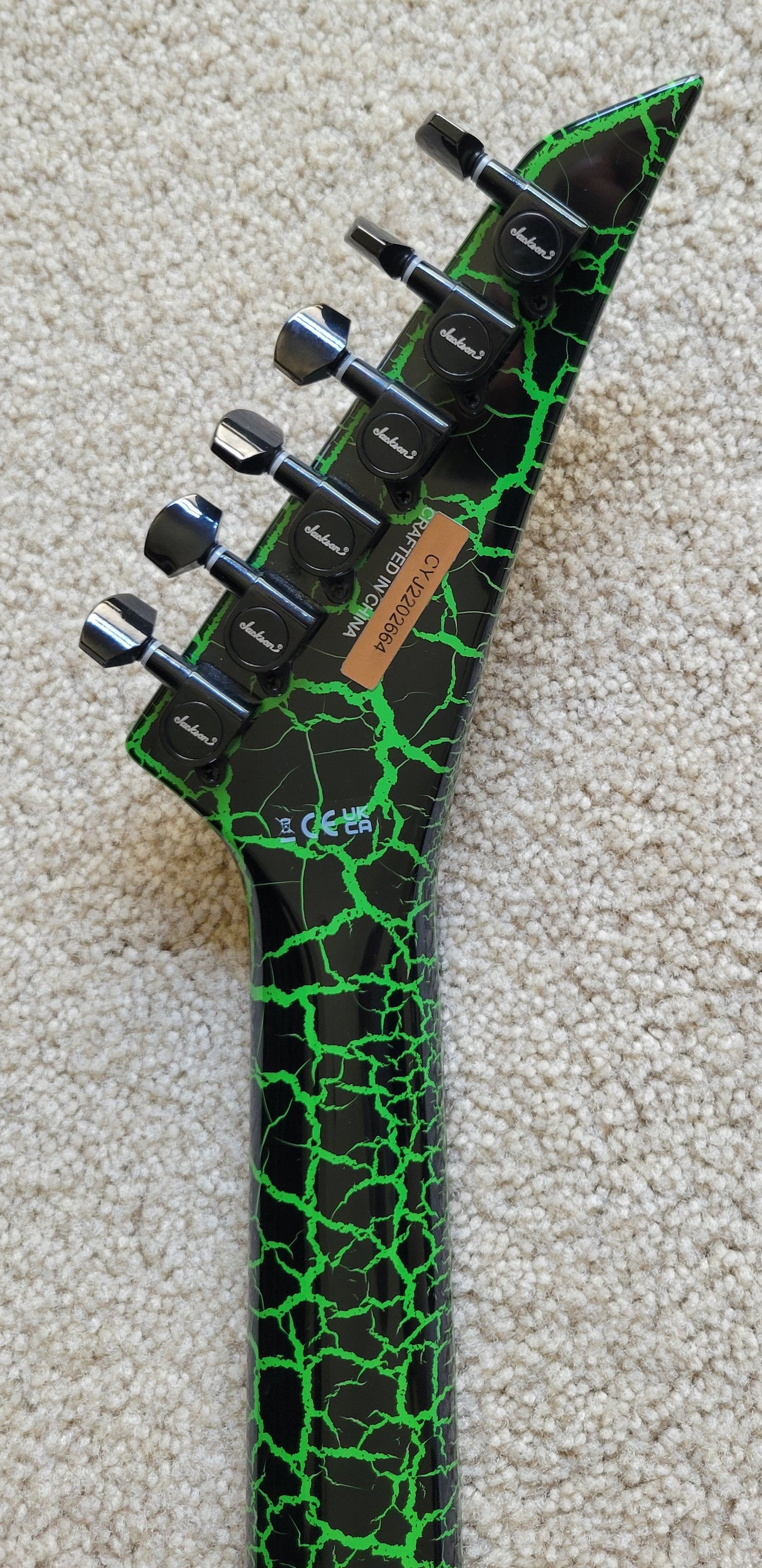 - Available in Green Crackle with reverse Jackson pointed 6-in-line black headstock featuring green Jackson logo and black hardware