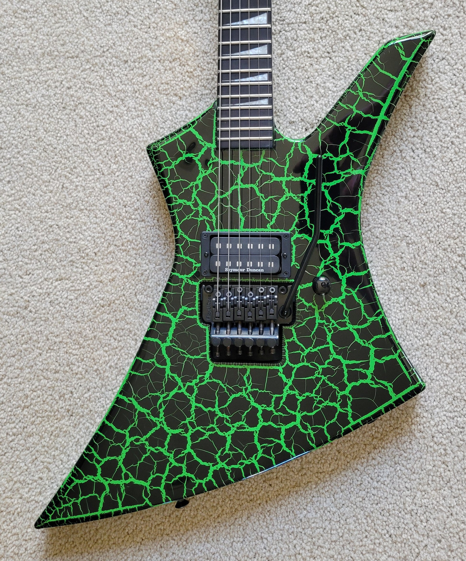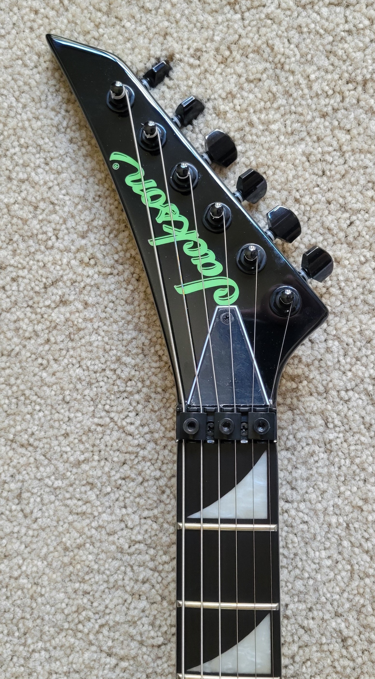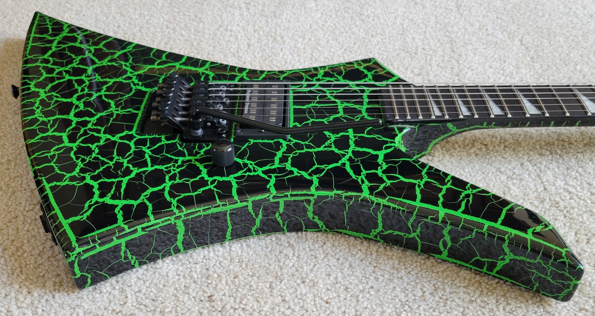 - Available in Green Crackle with reverse Jackson pointed 6-in-line black headstock featuring green Jackson logo and black hardware