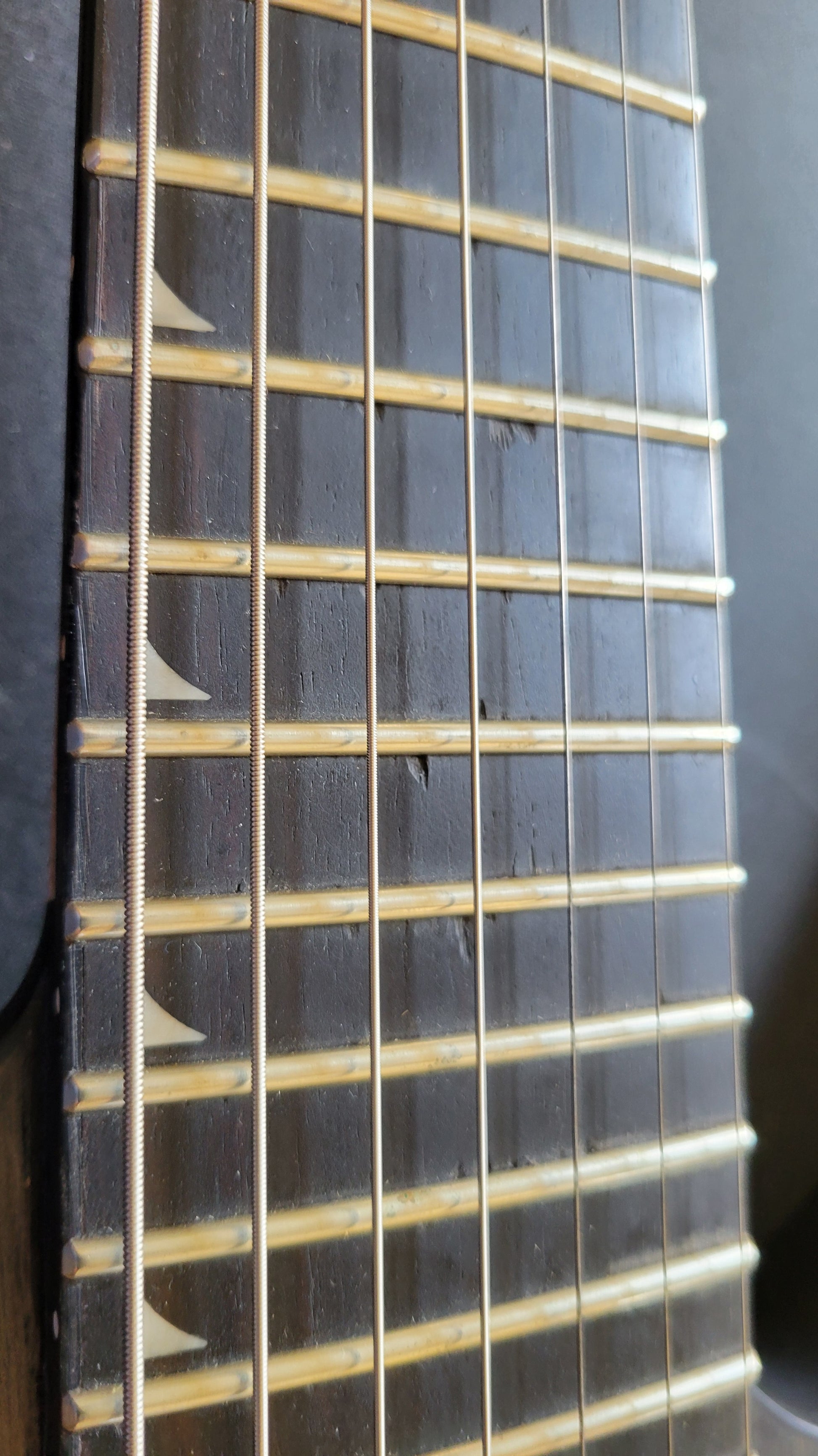 - 12”-16” compound radius ebony fingerboard with 24 jumbo frets and pearloid piranha tooth inlays