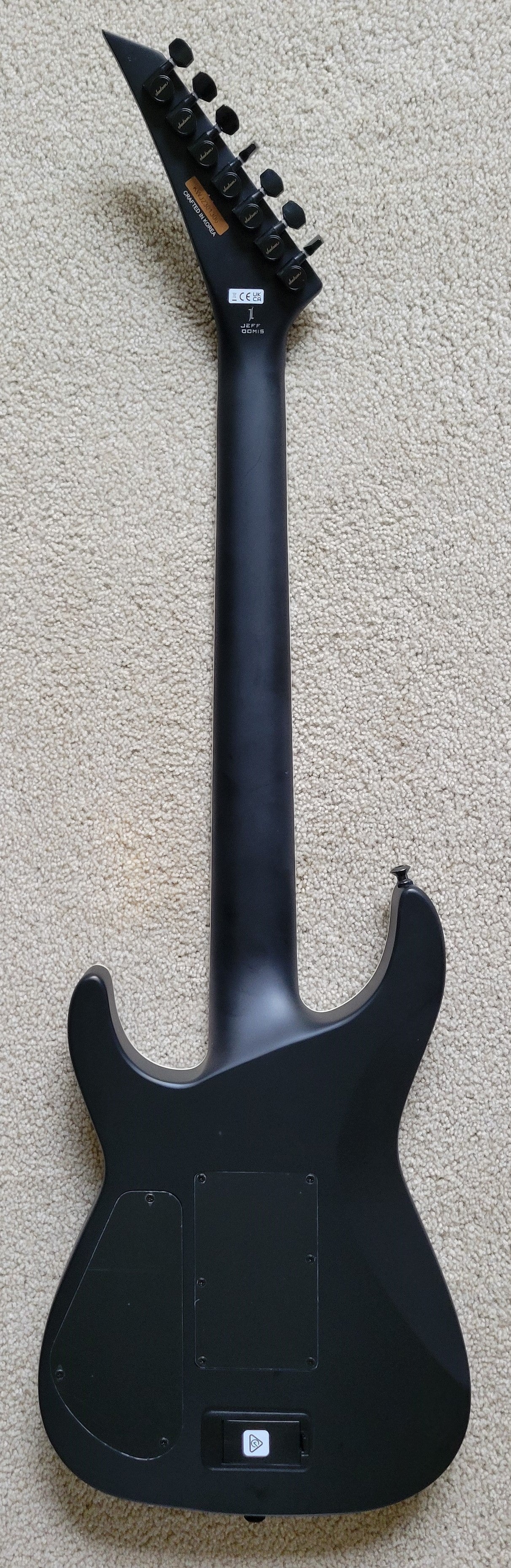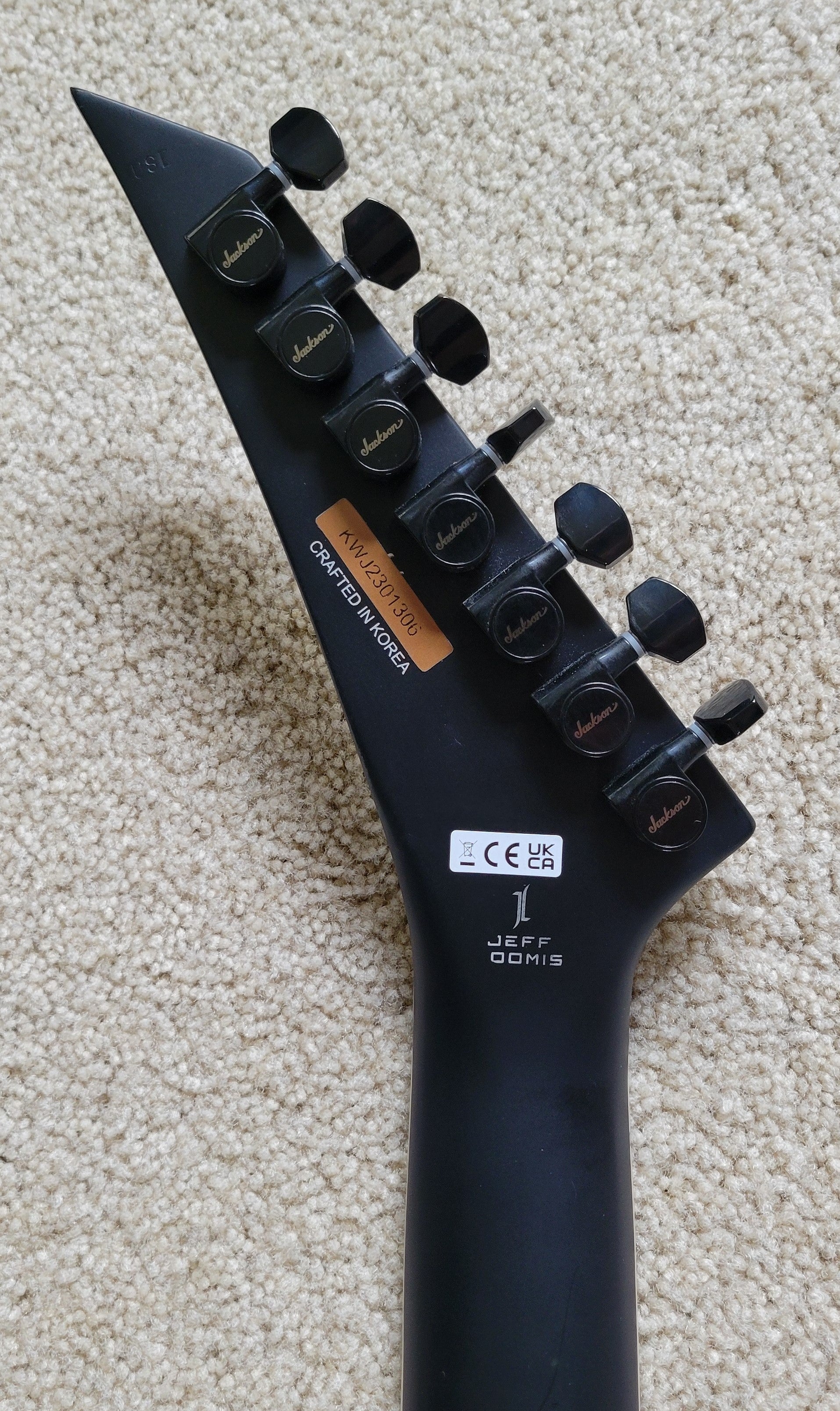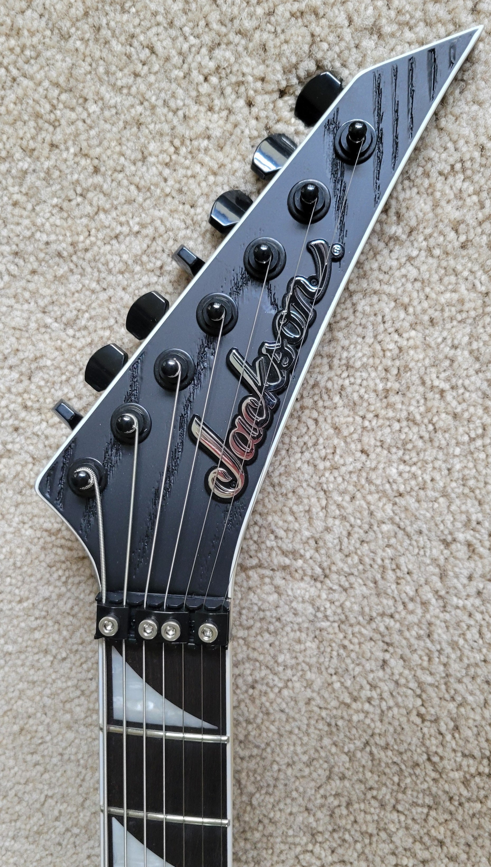 - Available in Satin Black with white binding, matching Jackson pointed 7-in-line headstock and black hardware
