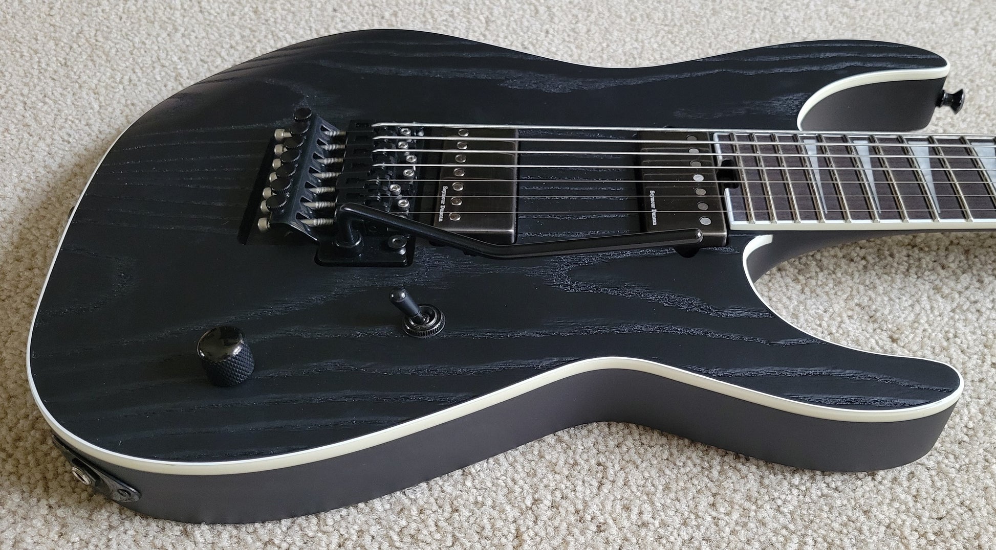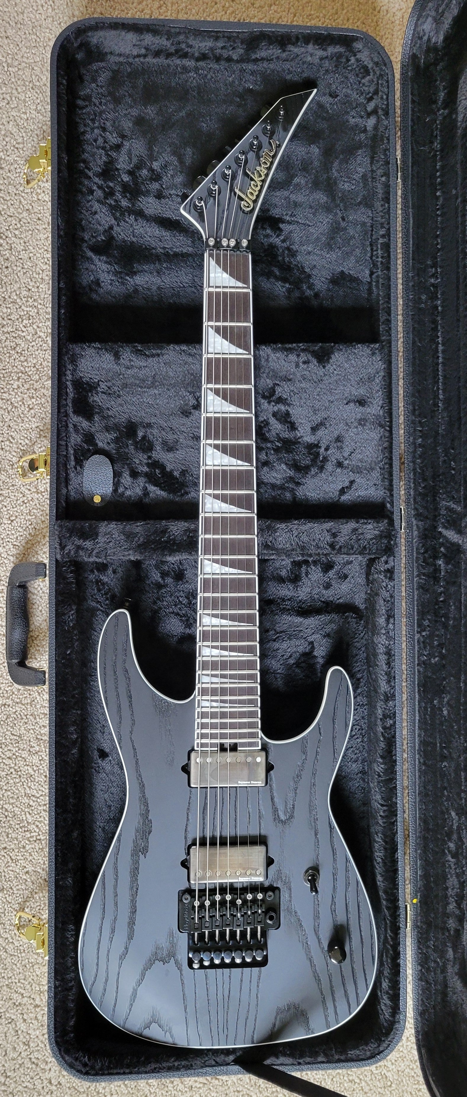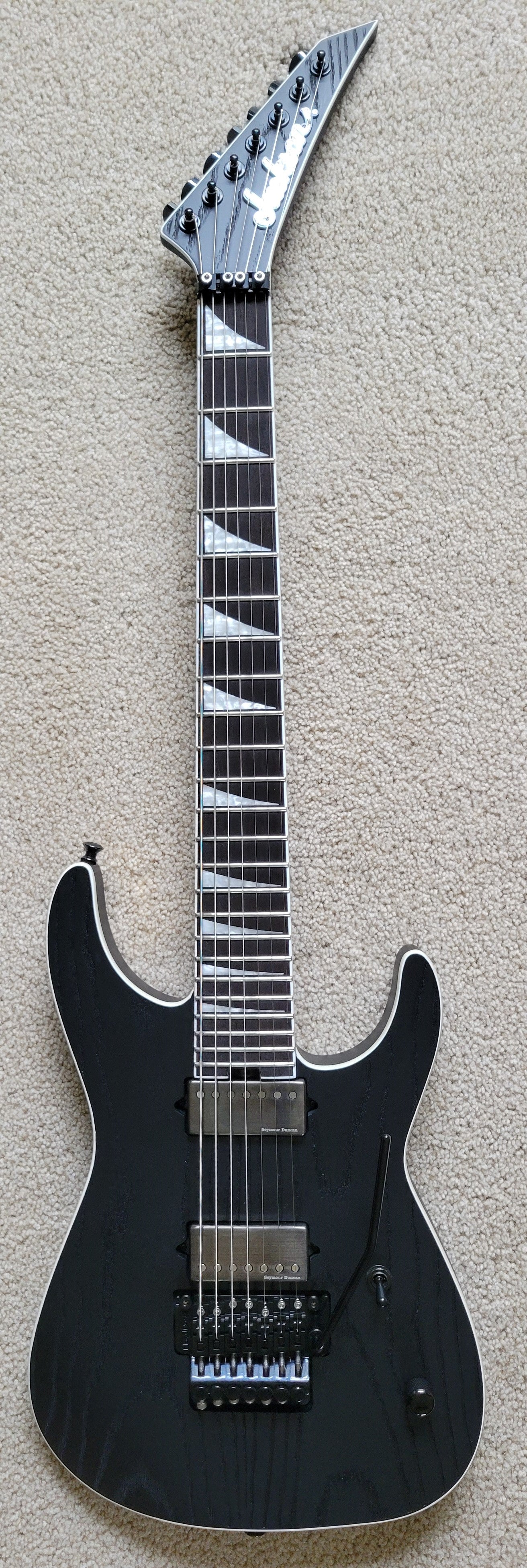 - Available in Satin Black with white binding, matching Jackson pointed 7-in-line headstock and black hardware