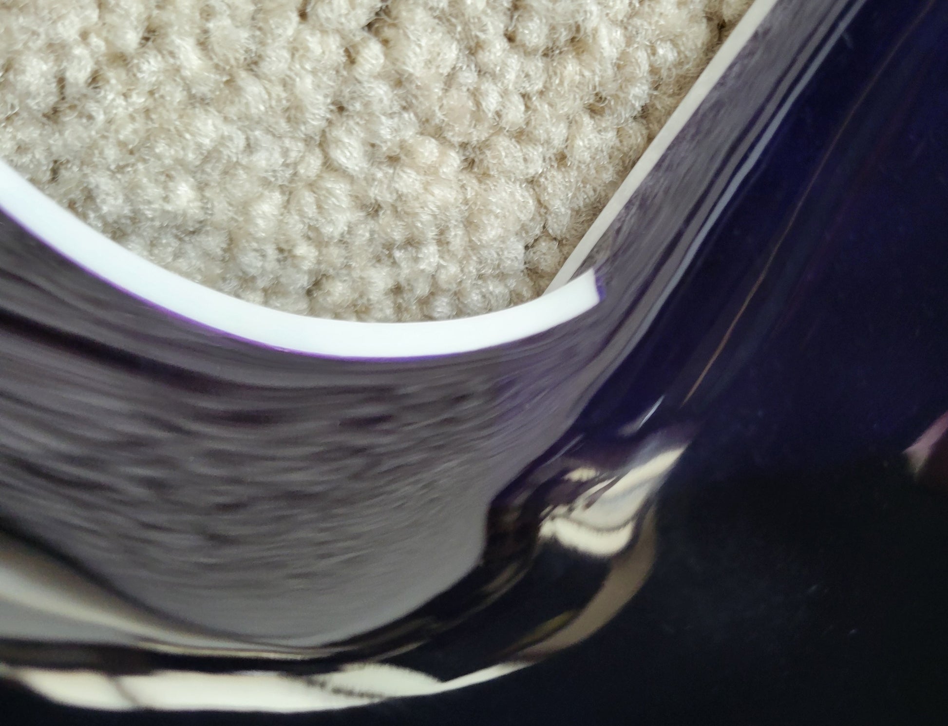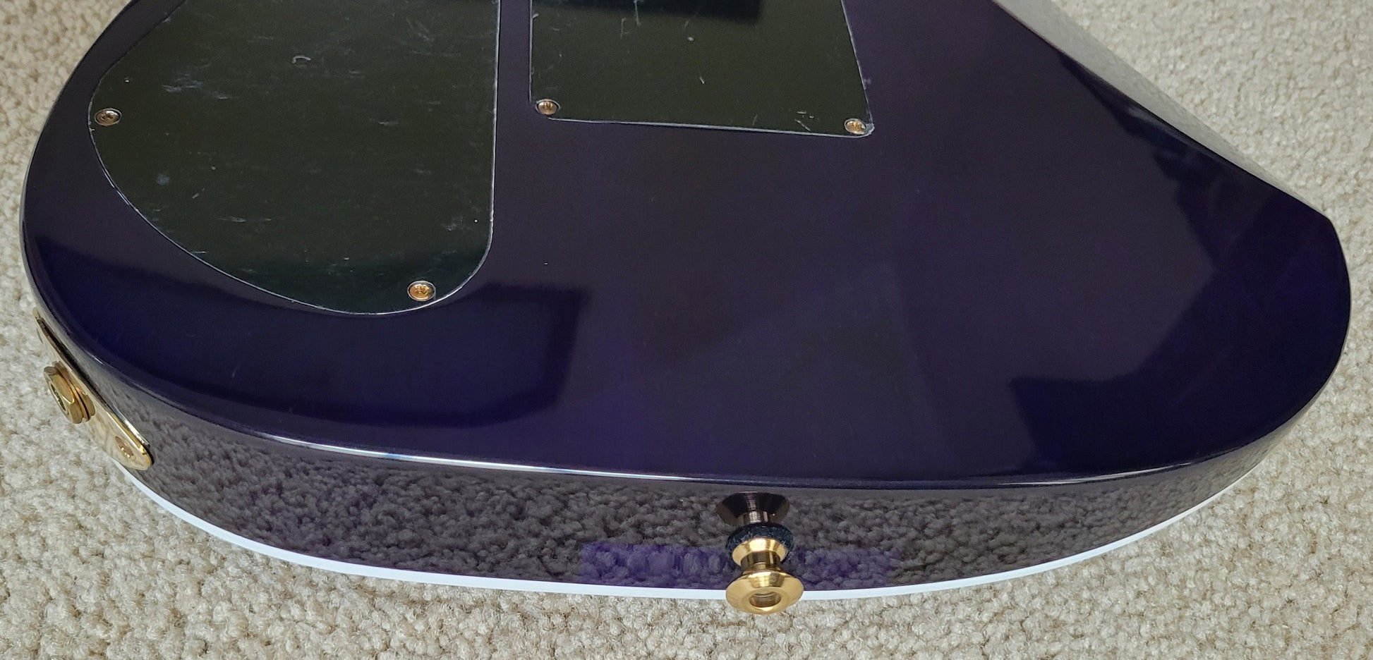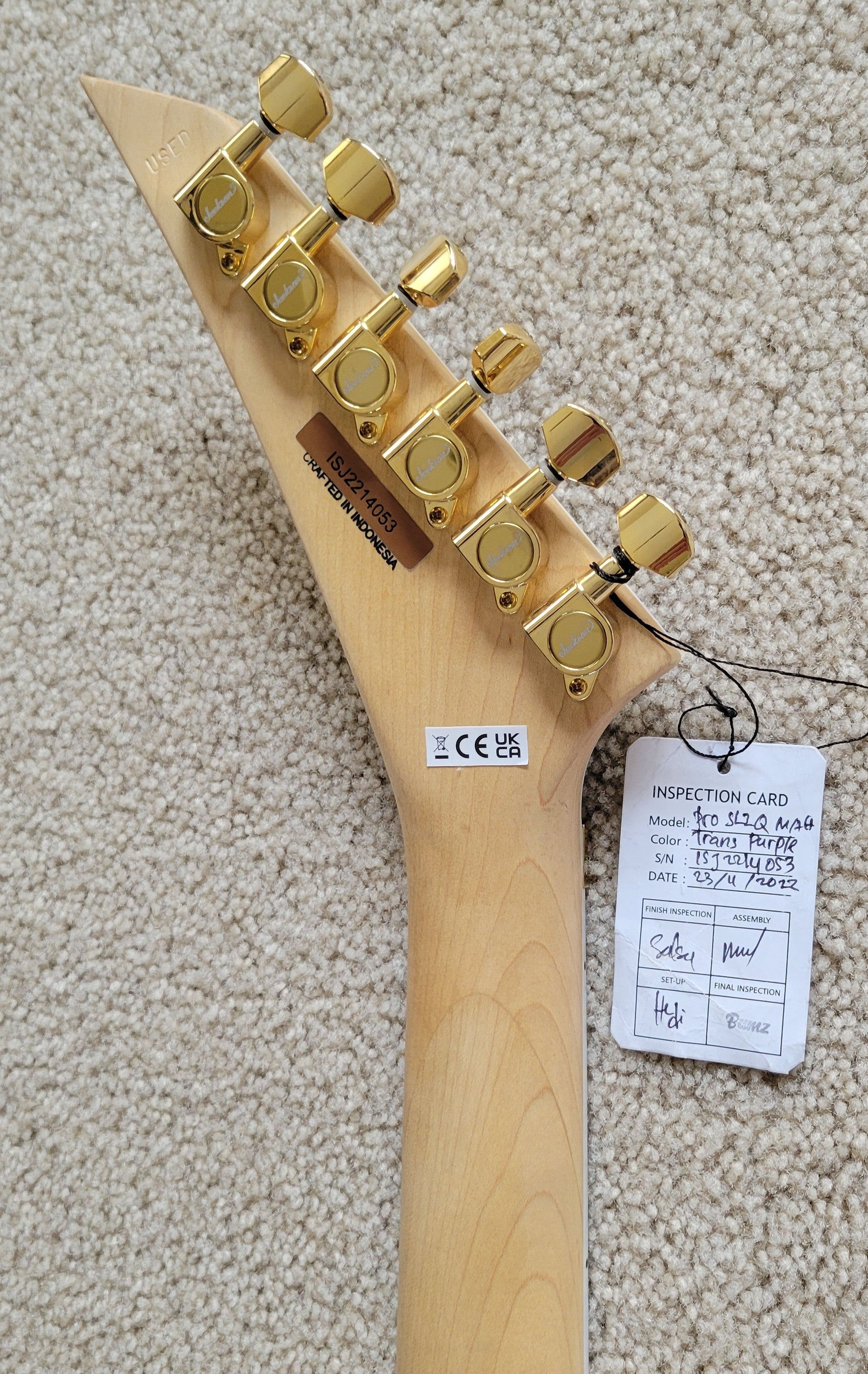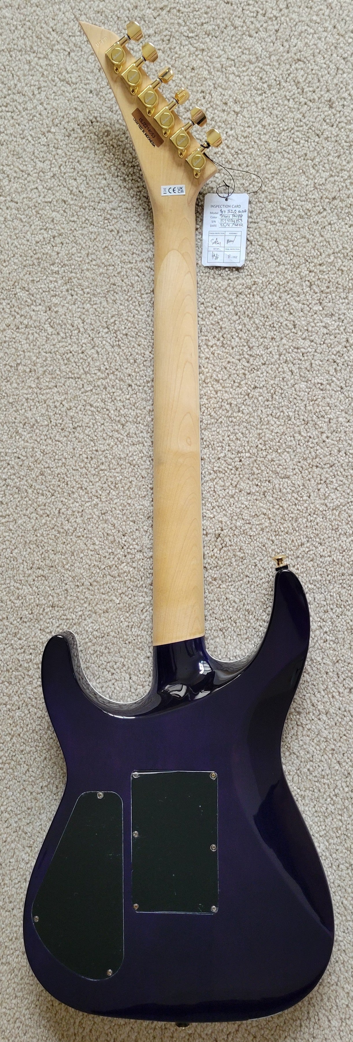 - Transparent Purple Finish with color matched Jackson pointed 6-in-line headstock, white binding and gold hardware