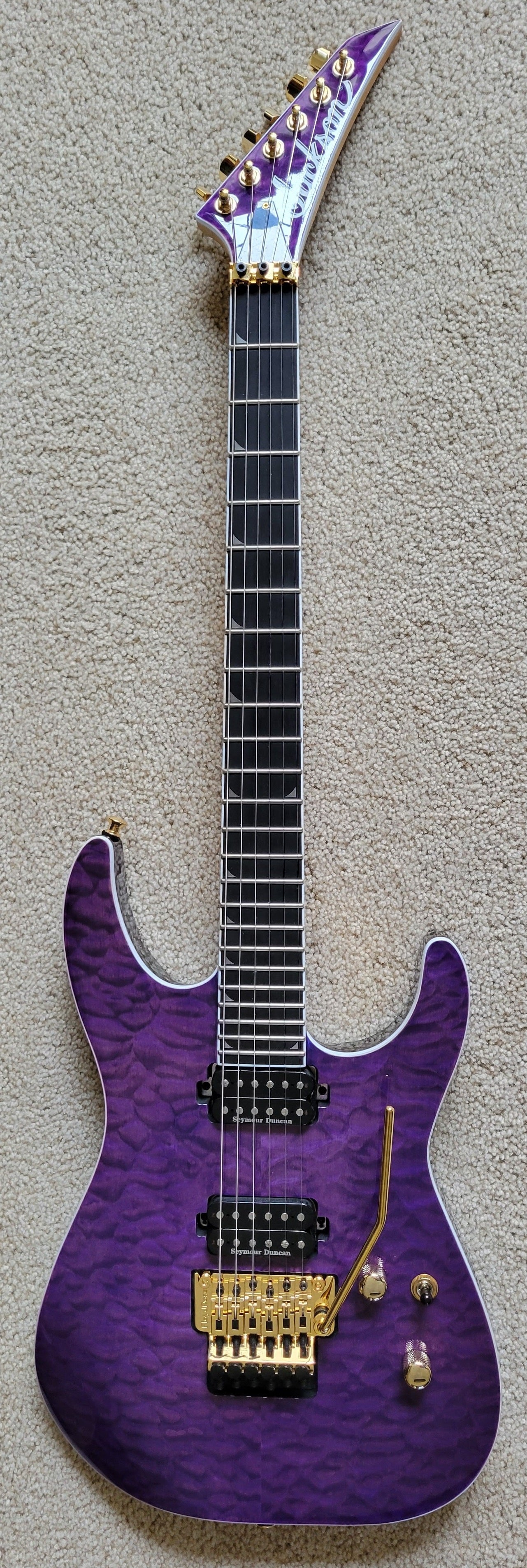 - Transparent Purple Finish with color matched Jackson pointed 6-in-line headstock, white binding and gold hardware