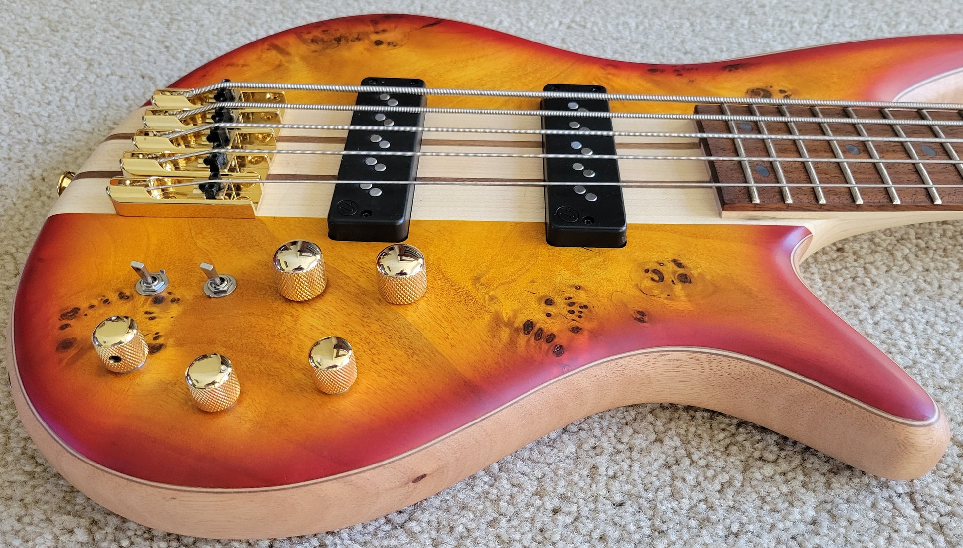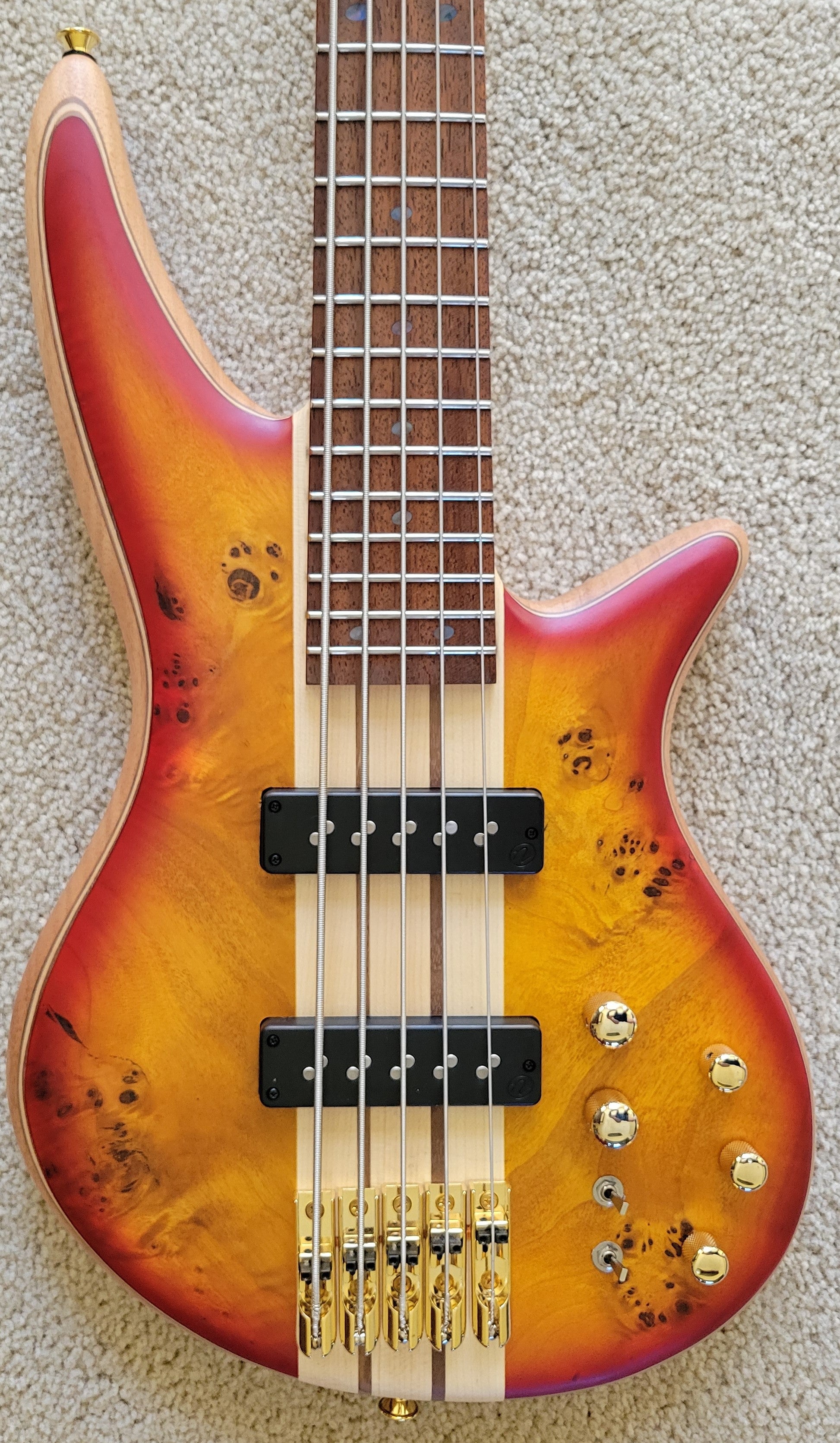 Starting with style, the all-new Pro Series Spectra Bass SBP V features a unique multi-laminate poplar burl/walnut/maple/walnut/mahogany body wrapped in an elegant Transparent Cherry Burst finish, complete with a unique 3x2 color matched headstock with an understated “J” logo and gold hardware.