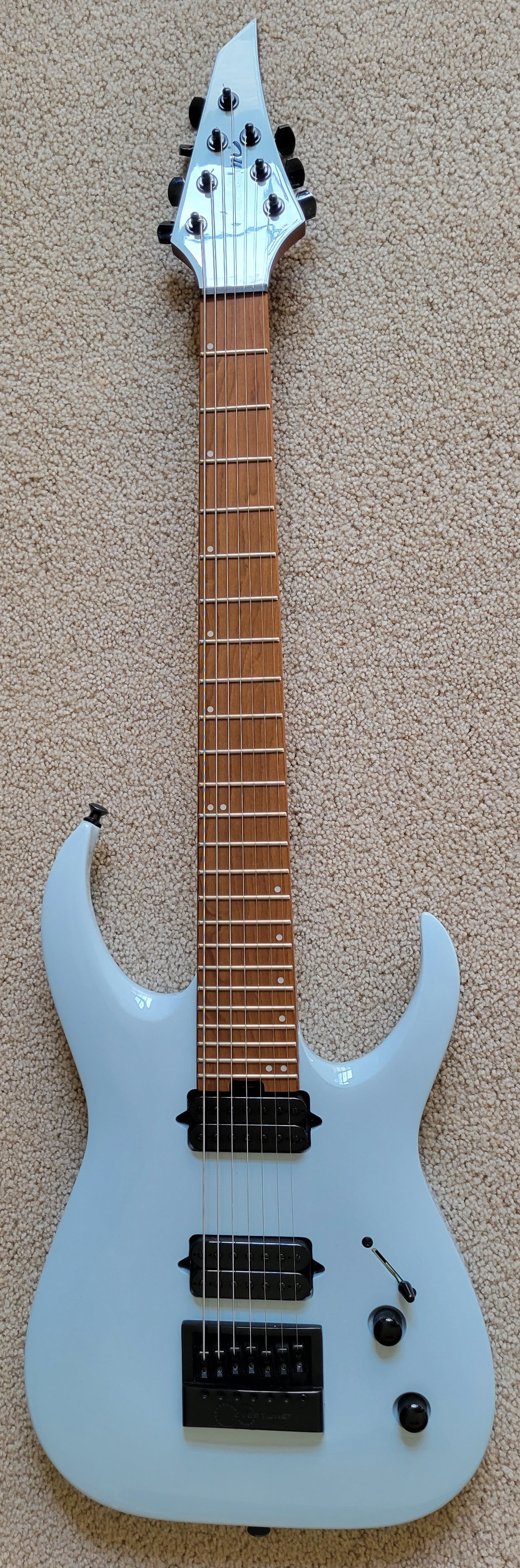 The Pro Series Signature Misha Mansoor Juggernaut ET7 offers a 26.5” scale length, basswood body and caramelized bolt-on maple neck with rock-solid graphite reinforcement, wrap-around heel and oiled back finish for greater playing comfort. Enjoy blazing fast leads with a 20” flat radius caramelized maple fingerboard featuring rolled edges, 24 jumbo frets and offset dot inlays. Luminous side dots will guide your way even on the darkest of stages, while the heel-mount truss rod adjustment wheel allows for convenient neck relief tweaks.