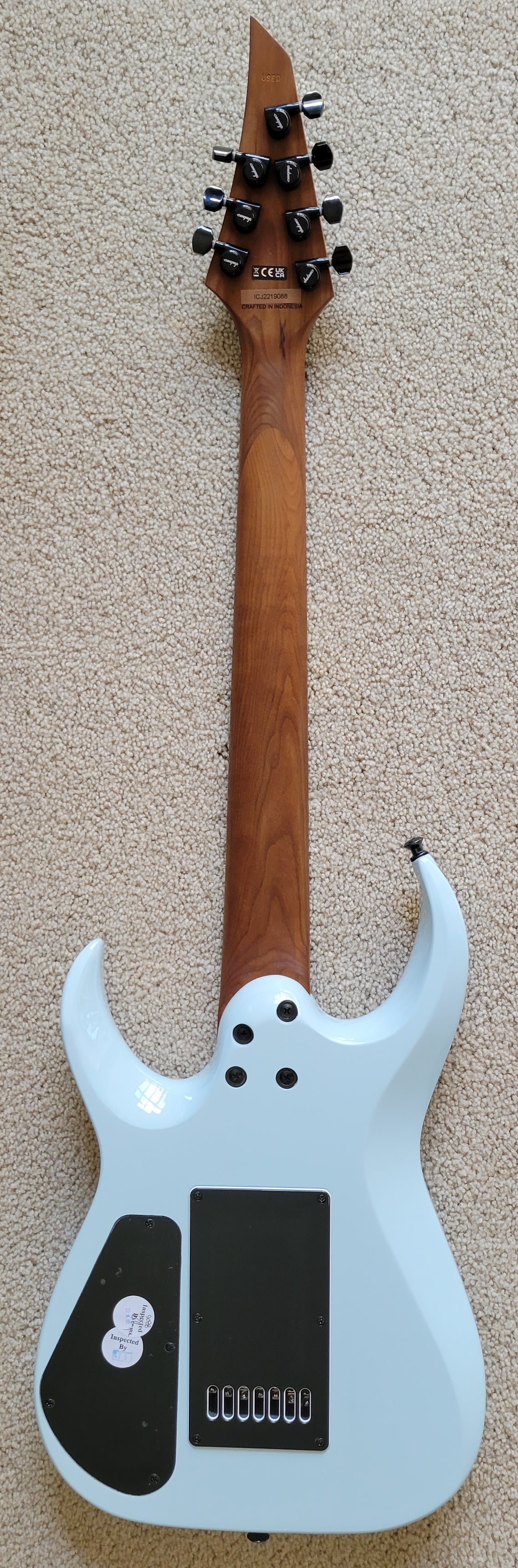 This 7-string Juggernaut is gorgeous in Gulf Blue with a color matched Jackson 4x3 AT-1 headstock and black hardware.